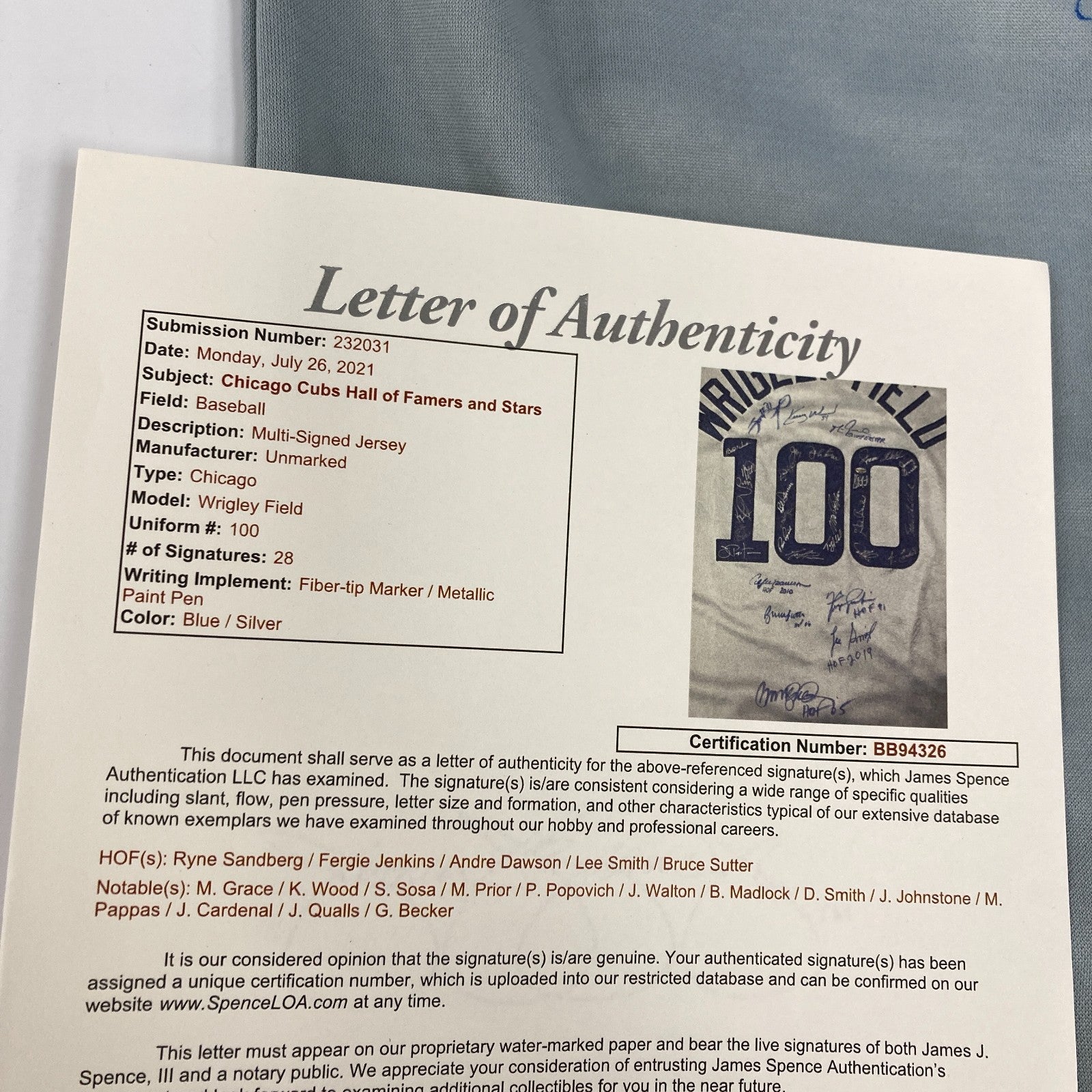 28 signatures with: Ryne Sandberg, Fergie Jenkins, Andre Dawson, Lee Smith, Bruce Sutter, Mark Grace, Kerry Wood, Sammy Sosa, Mark Prior, Paul Popovich, Jerome Walton, Bill Madlock, Doug Smith, Jay Johnstone, Milt Pappas, Jose Cardenal, Joe Qualls, Glenn Beckert and others.