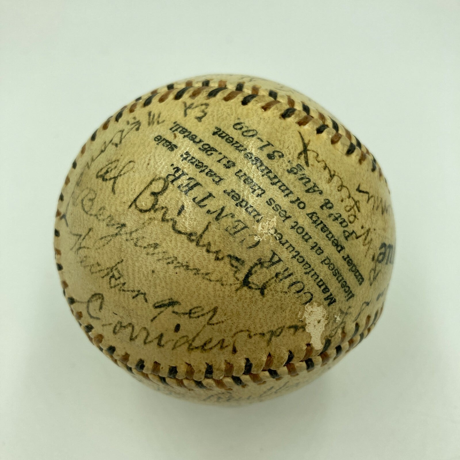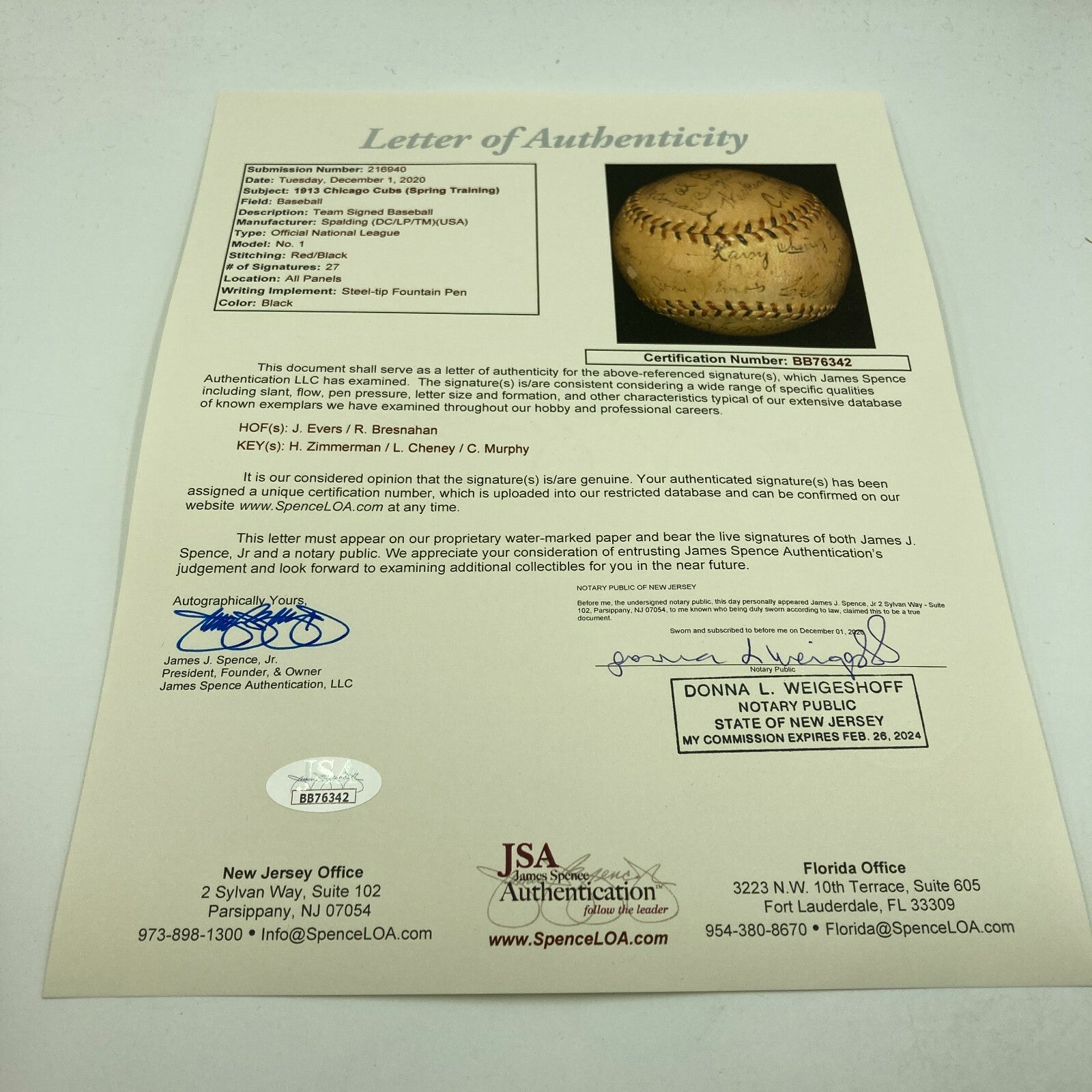 Official Spalding National League baseball signed by 26 members of the 1913 Chicago Cubs team, including: Johnny Evers, Roger Bresnahan, Charles W. Murphy (ss), Vic Saier, Al Bridwell, Heinie Zimmerman, Frank Schulte, Mike Mitchell, Jimmy Lavender, Ed Reulbach, Ward Miller, Wilbur Good, Otis Clymer, and many others. Full letter JSA COA.