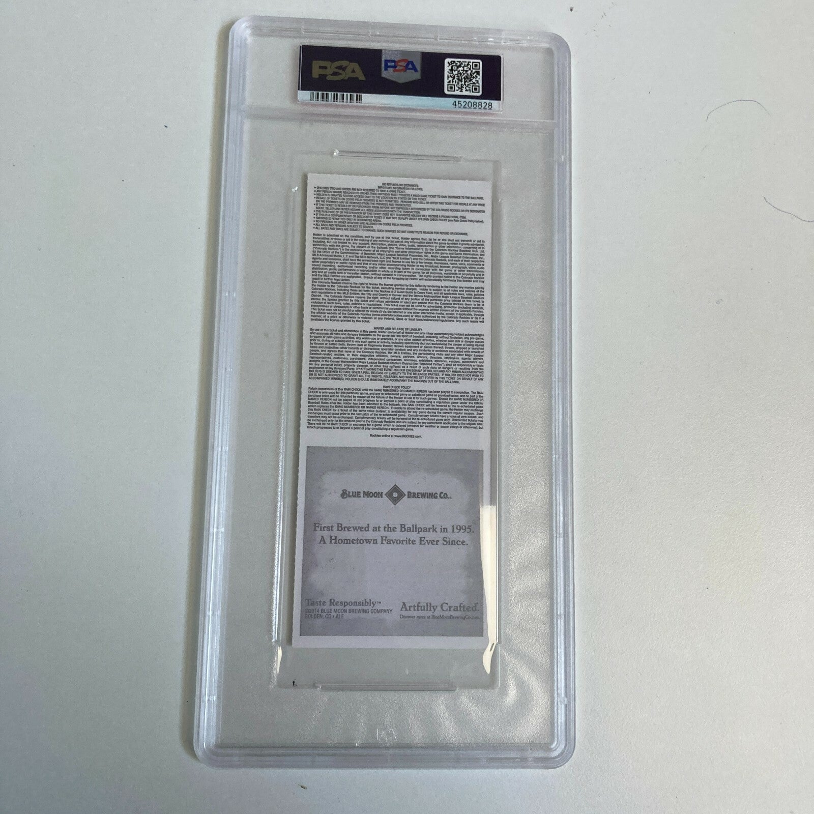 Graded MINT 9 by PSA (45208828). Offered is a full ticket from Javier Baez’s MLB debut against the Colorado Rockies on August 5th, 2014 at Coors Field. The Cubs won this game 6-5 in 12 innings, with Baez crushing the game-winning home run in the top of the 12th frame off Boone Logan on the first pitch of the half-inning. This is one of three examples of this ticket graded at its tier in the PSA population report, with none graded higher