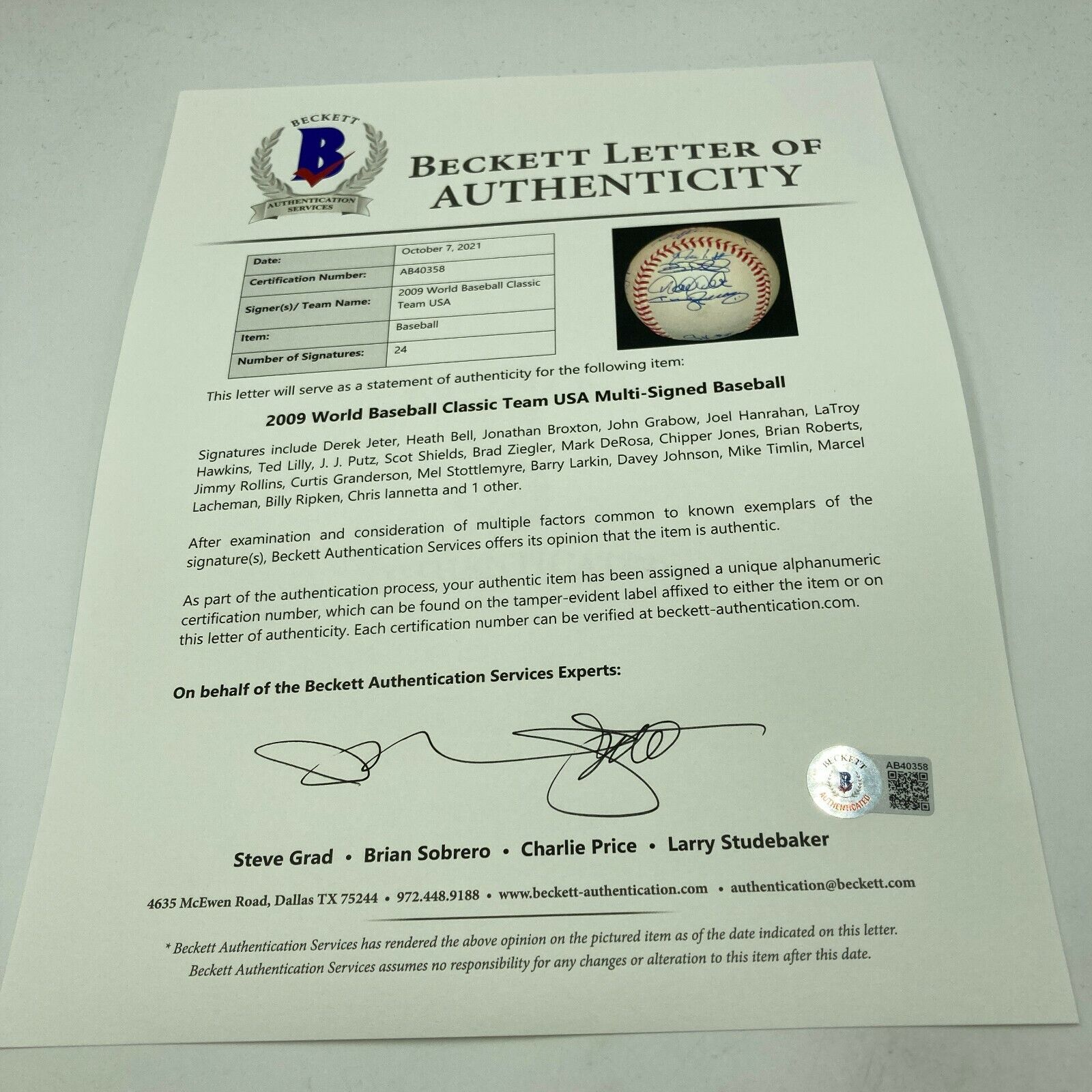 Mint white baseball with "Official Ball 2009 World Baseball Classic" in gold displays two dozen mint blue ballpoint autographs, include Hall of famers Derek Jeter and Chipper Jones. Pristine. Letter of provenance from Mark Kaline. Full LOA from Beckett Authentication Services.