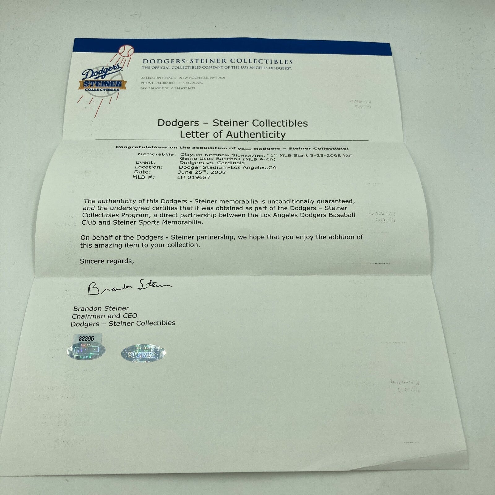 Historic Clayton Kershaw MLB Debut First Career Game Signed Inscribed Game Used Baseball. Kershaw signed the ball and inscribed "First MLB Start, May 28, 2008, 7 strikeouts". Comes with MLB Authenticated Hologram #LH019687 and a Certificate Of Authenticity from Steiner Sports.