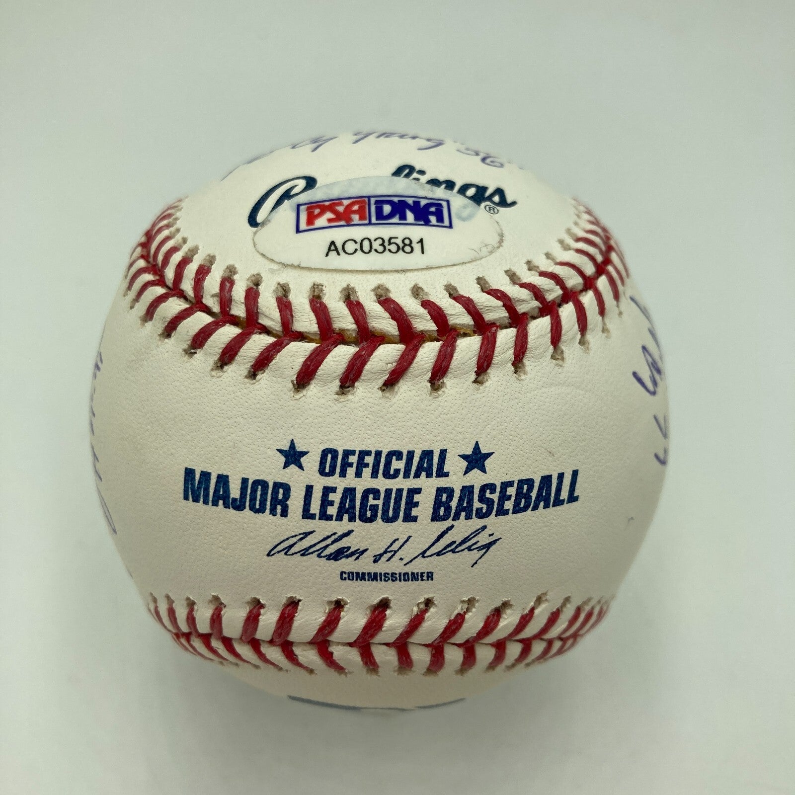 For pitchers, winning the Cy Young Award is the highlight of their careers, and 12 winners of the prestigious award have placed their flowing blue ballpoint pen signatures and inscriptions across this offered Official Major League Allan H. Selig baseball. Hall of Famer Steve Carlton signed and inscribed "Cy 72, 77, 80, 82," Bob Welch signed and inscribed "CY-90," Hall of Famer Gaylord Perry inscribed "HOF 91," Denny McLain signed and inscribed "Cy 68-69," Vern Law signed and inscribed "CY 1960," Randy Jones signed and inscribed "CY 76," Mike Flanagan signed and inscribed "CY 79," Doug Drabek signed and inscribed "90 NL CY," Don Newcombe signed and inscribed "1st Cy Young 56," Jim Longborg signed and inscribed "Cy Young 67," Steve Bedrosian signed and inscribed "87 NL CY," and Hall of Famer Tom Seaver signed and inscribed "Cy 69-73-75." The stitching is vibrant and the ball contains faint toning. The ball is accompanied by a sticker from PSA/DNA (AC03581). Does not have PSA card.