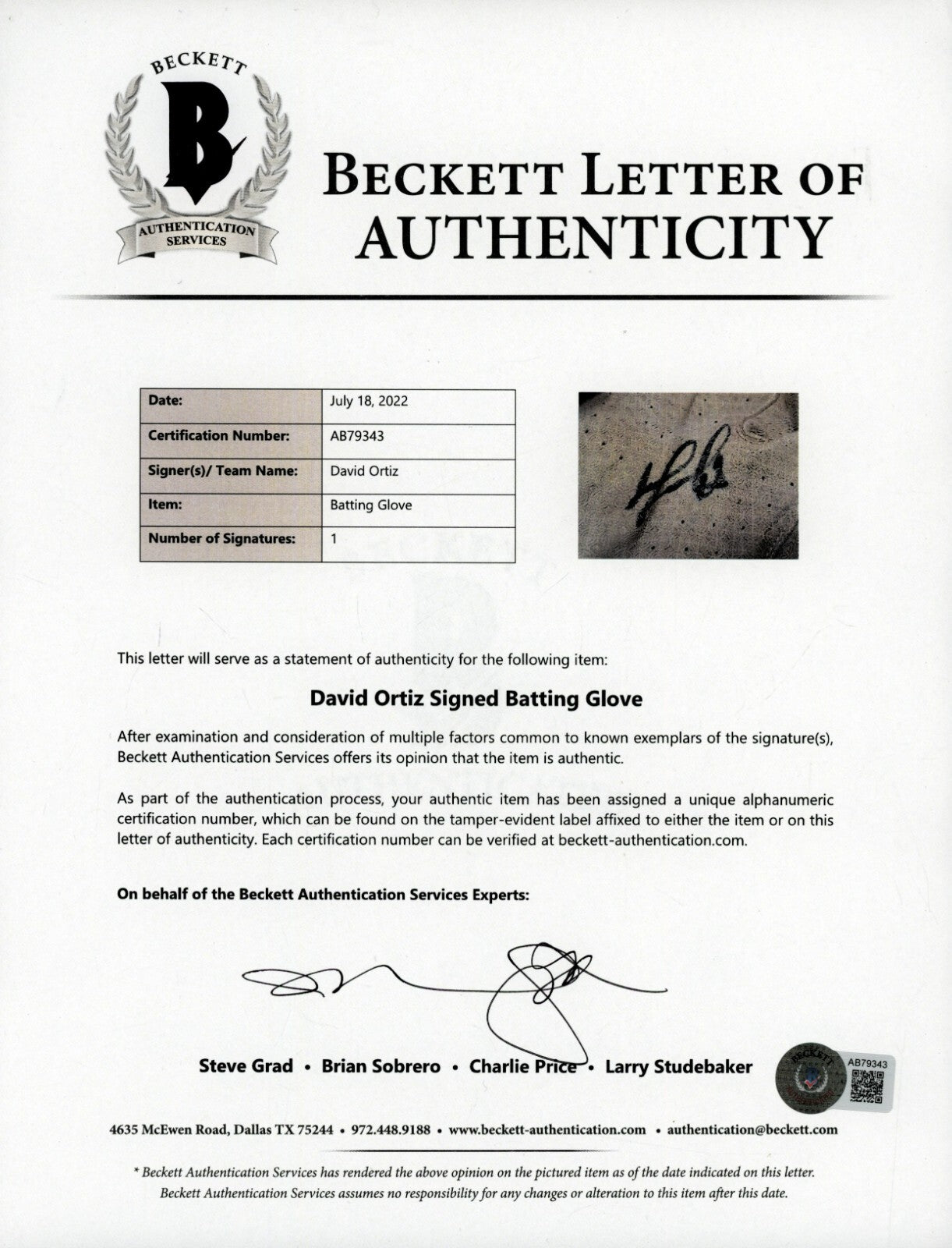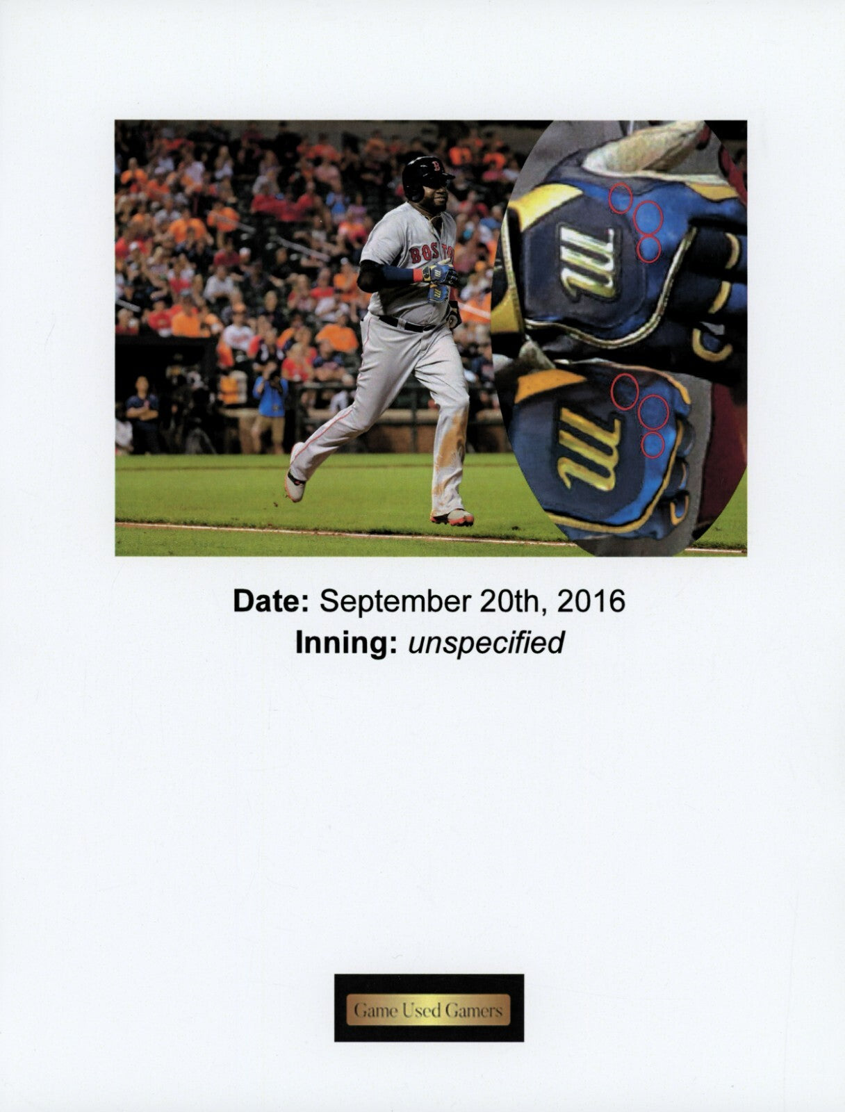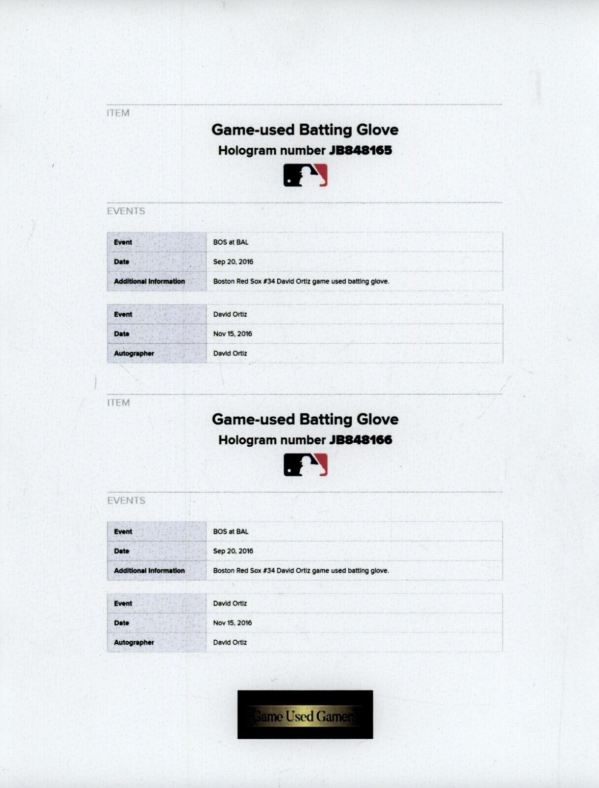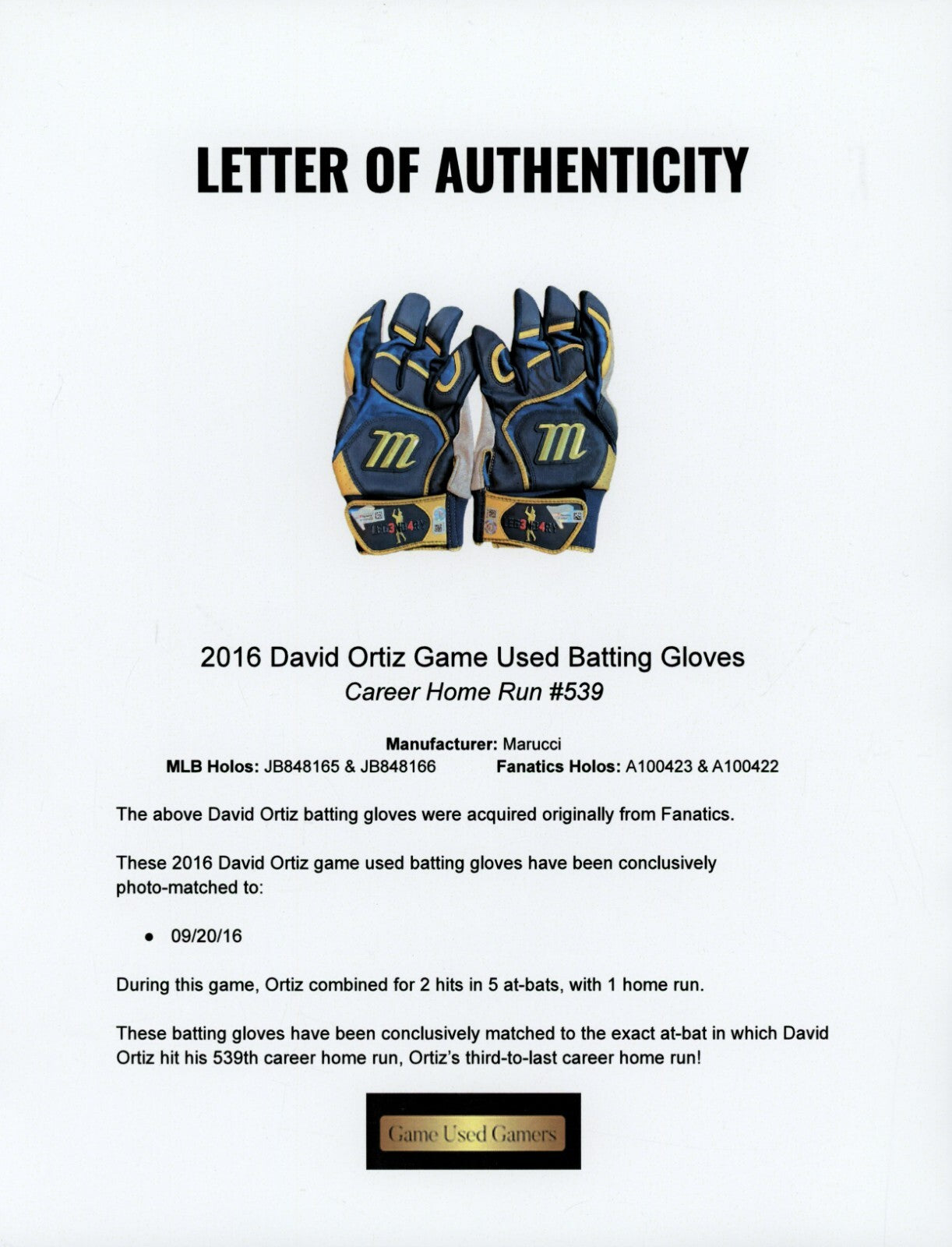 HR #539 GLOVES!!!... At the age of 40, and one of the most beloved athletes in Boston, David Ortiz led the American League in doubles (48), RBIs (127) and slugging percentage (.620) while adding 38 home runs and a .315 batting average. Having already announced his retirement at the conclusion of the 2016 season, Ortiz displayed that he was as good as he ever was and earned an All-Star nod (his 10th) and a Silver Slugger in 20th year in the big leagues. Offered here are a pair of Big Papa's well-worn batting gloves from the Red Sox 151st game of the 2016 season when Ortiz took Baltimore's Kevin Gausman deep for his 539th career home run.