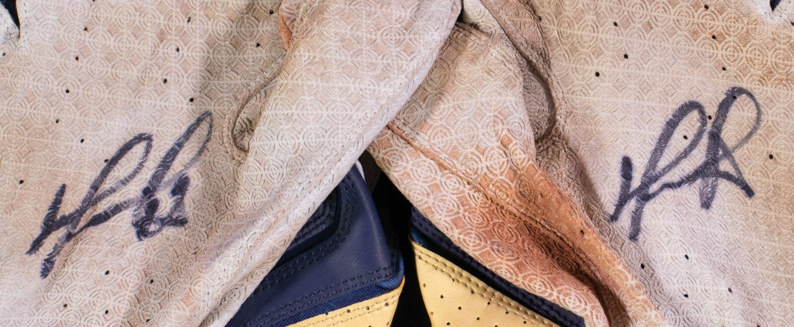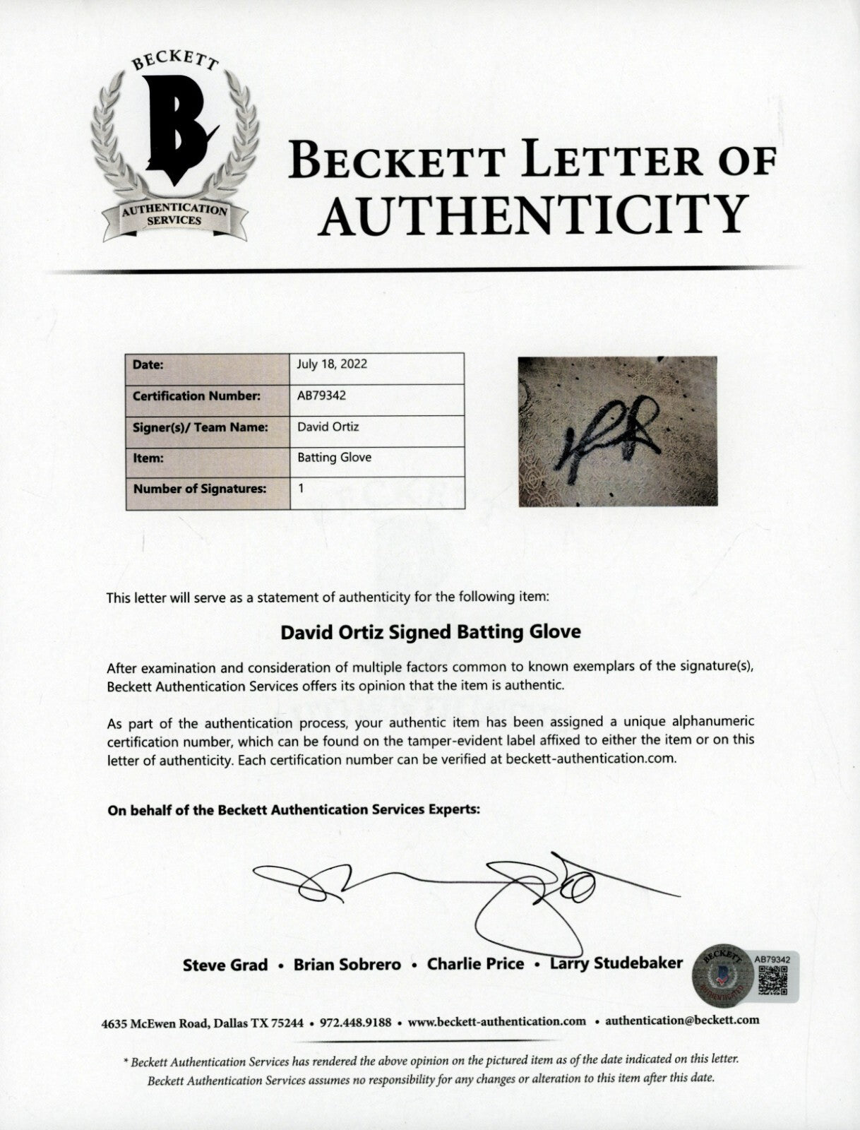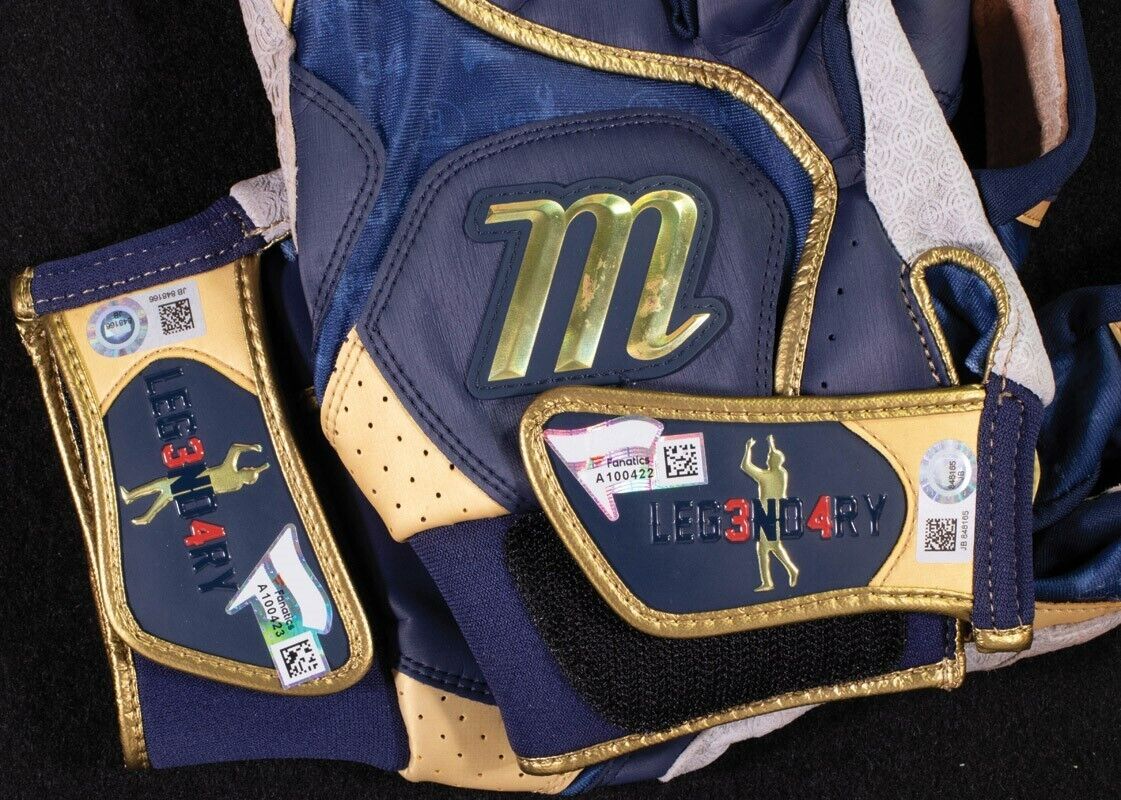 This brilliant and bold pair of navy blue and gold batting gloves remain in excellent condition and have each been signed on the palms by the Red Sox HOFer. Each signature is centered in the palm and penned in black Sharpie, with heavy soiling apparent, especially at the base of the thumbs. Each Velcro enclosing back features the David Ortiz "Legendary" logo with a hologram certification sticker from Major League Baseball and another from Fanatics. Ortiz was an absolute terror at the plate for 20 seasons, including his last when he led the American League with 48 doubles and 127 RBIs, not to mention 38 homers. This well-kept pair of gloves marks the end of an era in Beantown, a Hall of Fame