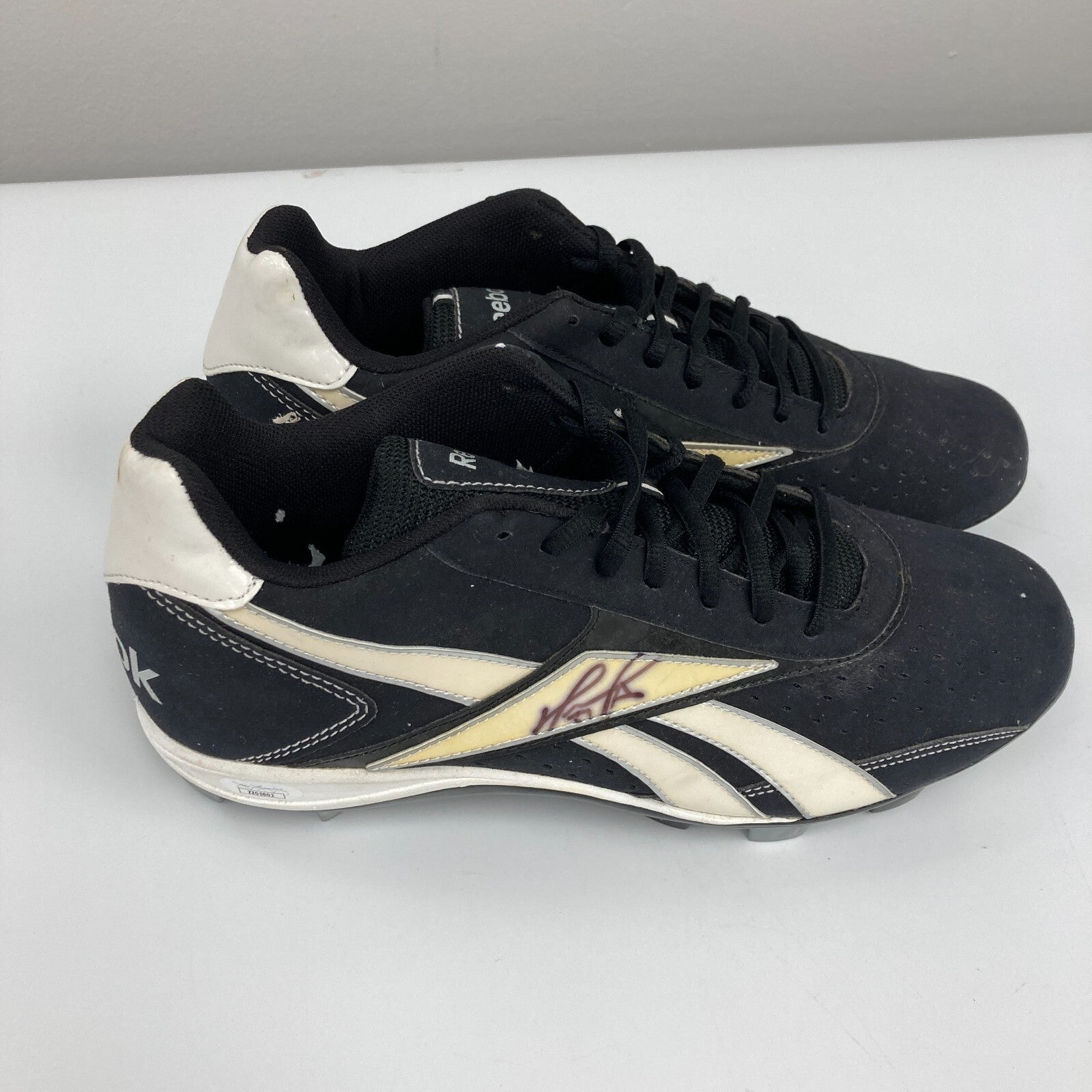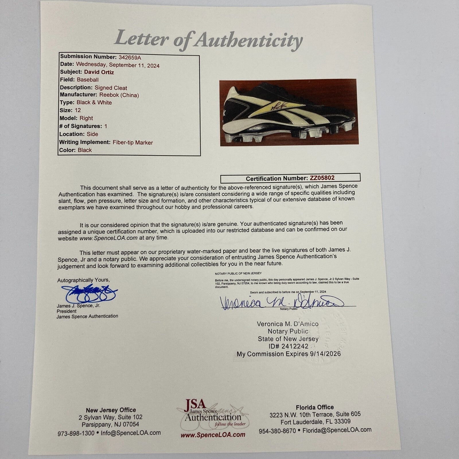 Nice pair of David Ortiz game issued signed cleats. Each size 12 shoe is mostly black with white leather highlights, manufacturer and size tagging is sewn inside each tongue, and a barcode sticker is on the right insole. A Red Sox legend, Big Papi blasted 541 homers in his 20-year Hall of Fame career.