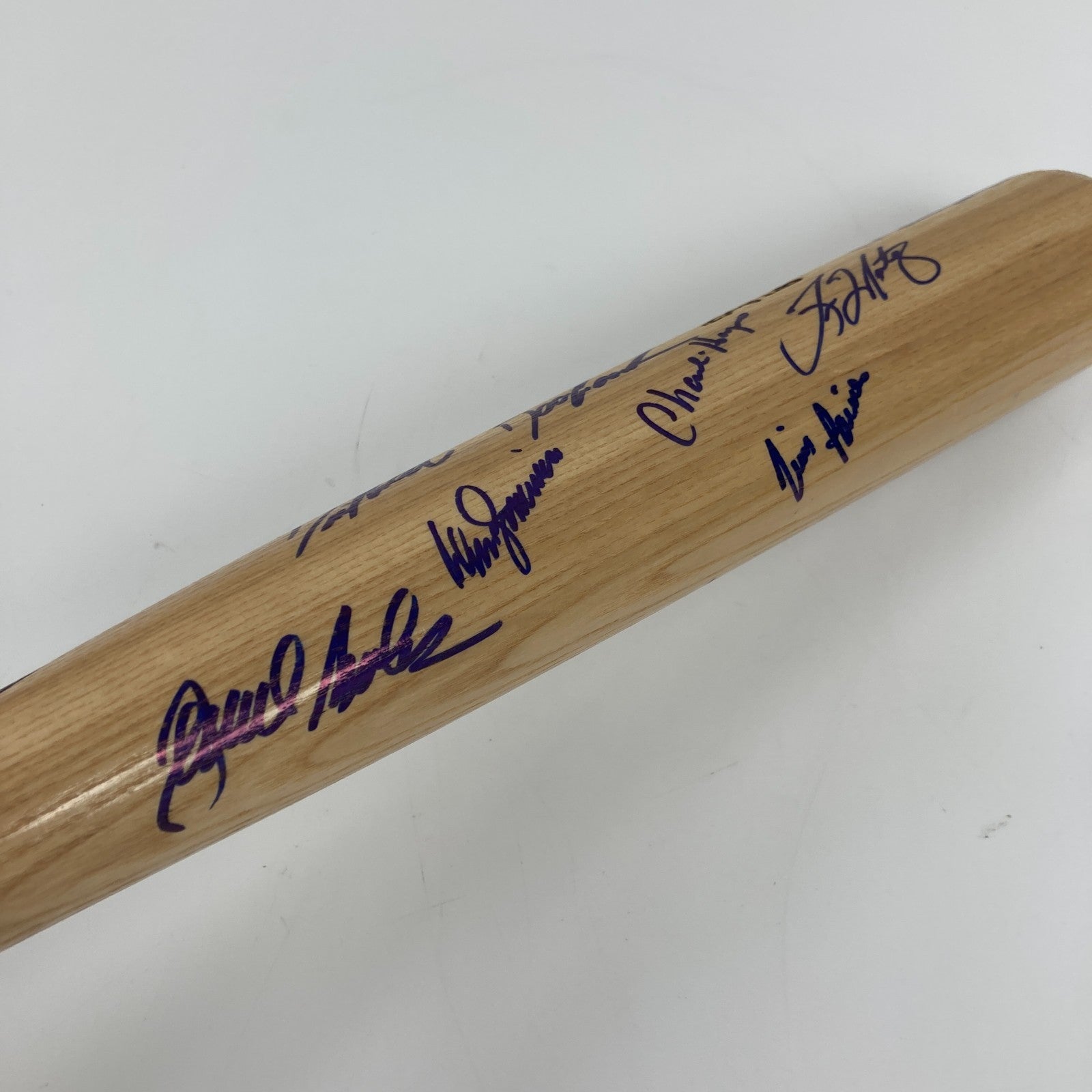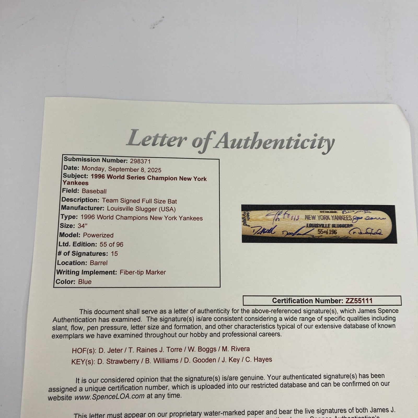 Louisville Slugger limited-edition commemorative bat signed in blue marker by fifteen members of the 1996 World Champion New York Yankees. Notable signatures include Jimmy Key, Mariano Rivera, Wade Boggs, Bernie Williams, Joe Torre (mgr.), Dwight Gooden, Derek Jeter, and Charlie Hayes. The bat (33 inches) is stamped "55 of 196" along the barrel and is in Near Mint condition overall.