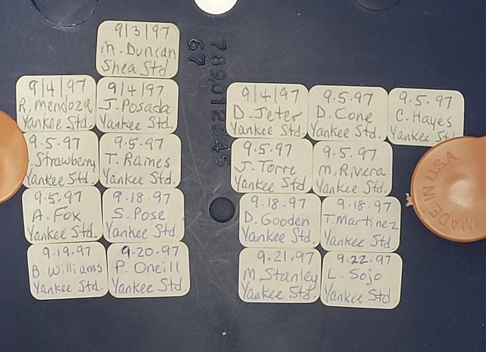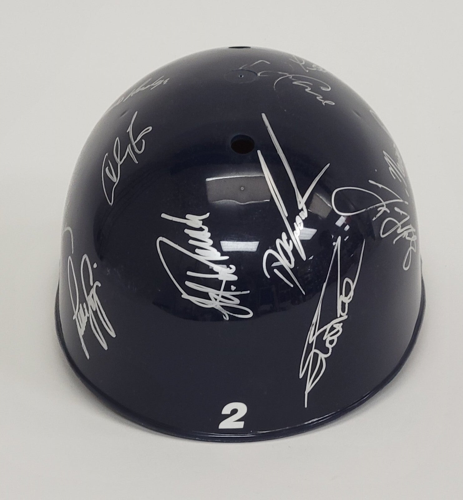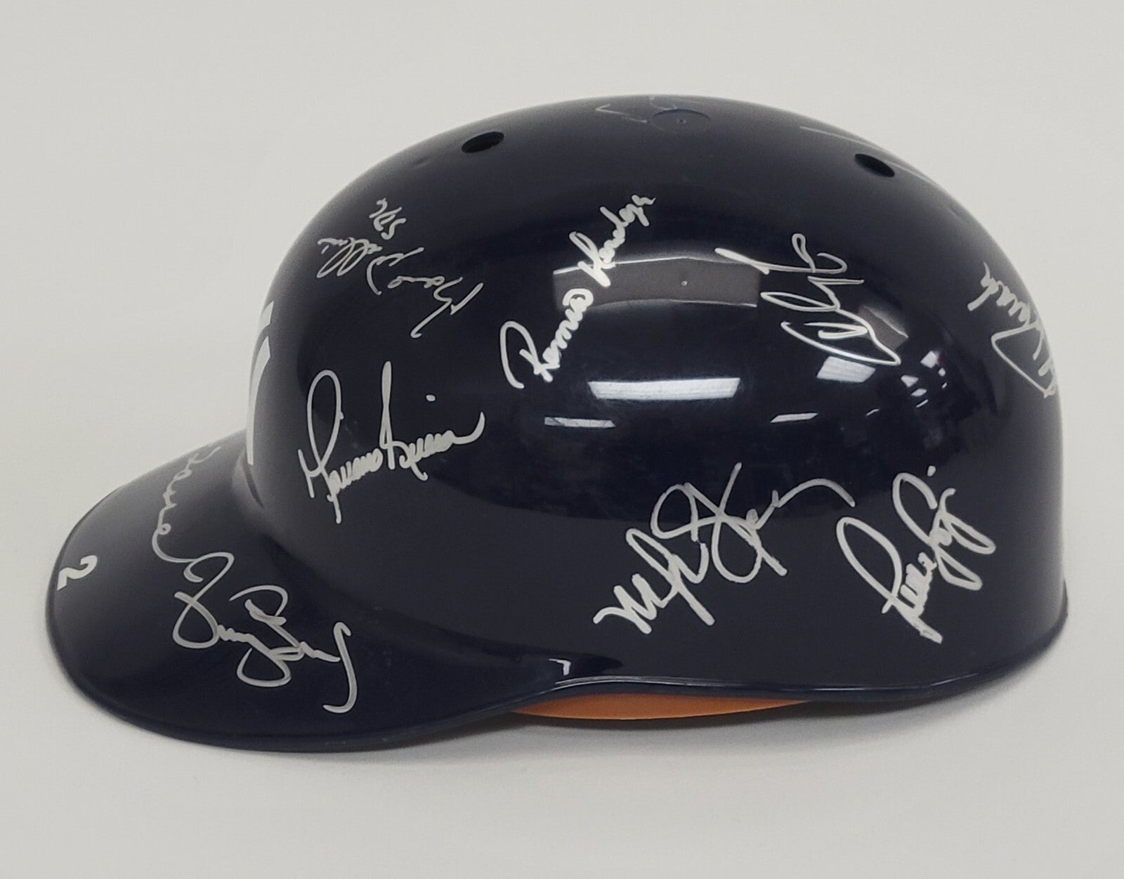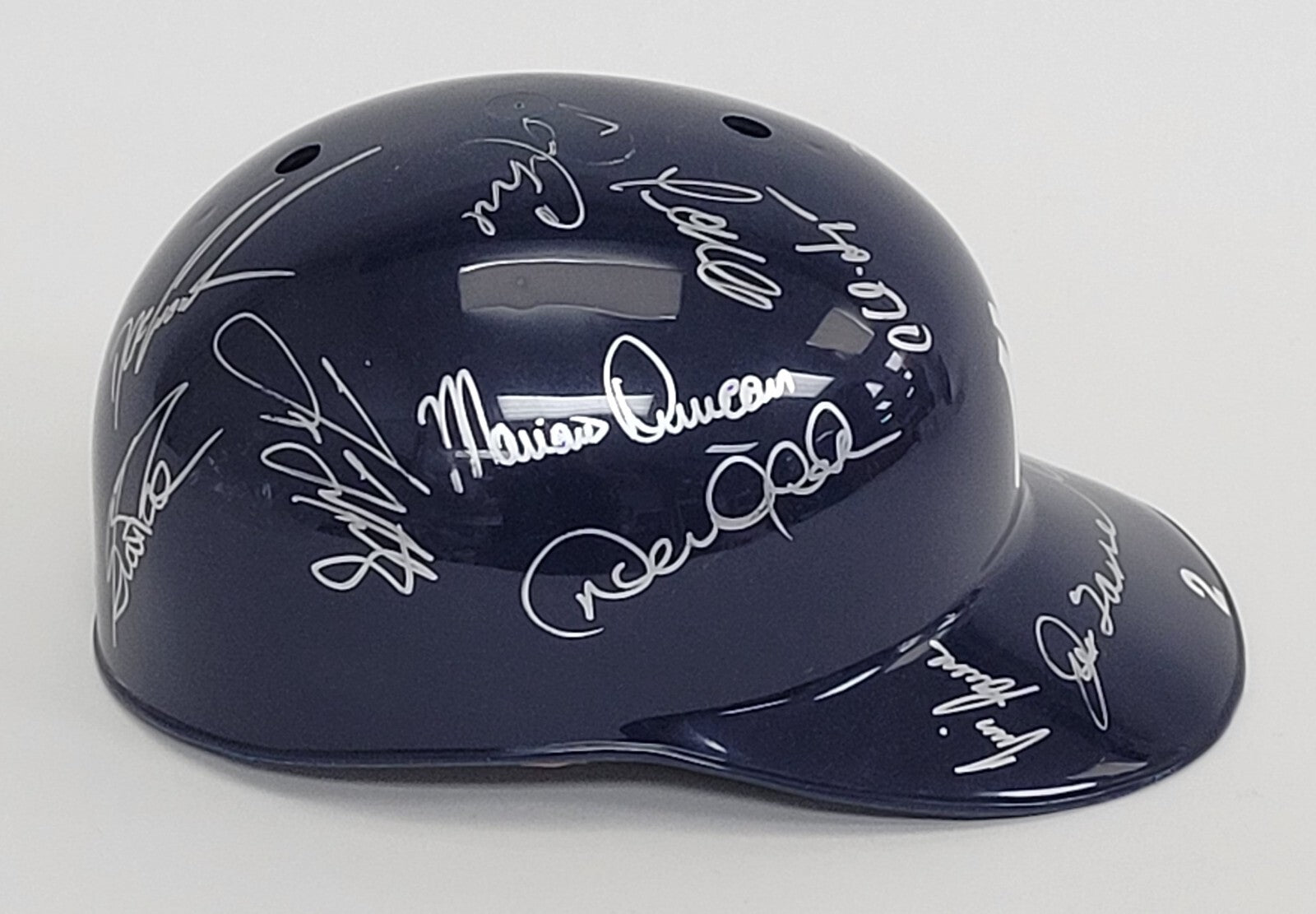 This full-sized batting helmet has been personally signed by 17 members of the 1997 New York Yankees team and is loaded with stars. Signatures include Mariano Rivera, Ramiro Mendoza, Darryl Strawberry, Bernie Williams, Mariano Duncan, Jorge Posada, Tim Raines, Paul O'Neill, Derek Jeter, Joe Torre, Doc Gooden, David Cone, Tino Martinez, Luis Sojo, Andy Fox, Scott Pose, & Mike Stanton. What's unique about this helmet on the inside are stickers with the players names on them with the date and location of when and where the autograph was obtained. This was a labor of love that could not be duplicated today. Originated from the collection of a retired NYC police officer who was able to acquire signatures in person due to his close ties with ball players. This comes with a full letter of authenticity from Beckett.