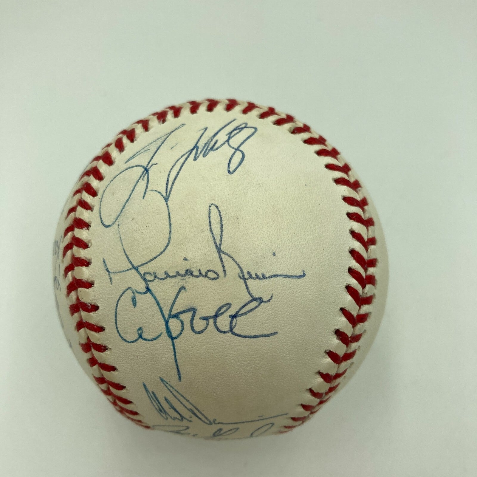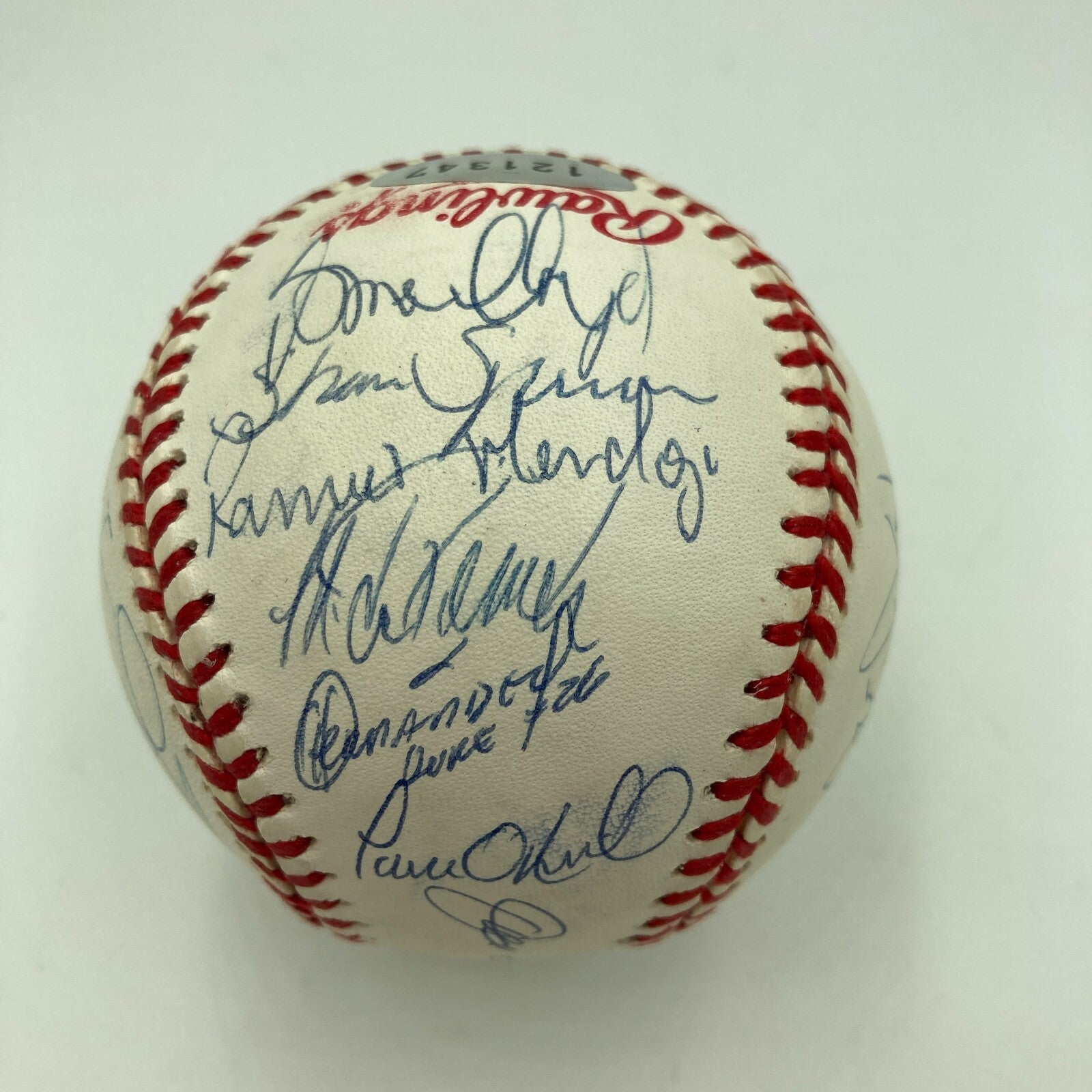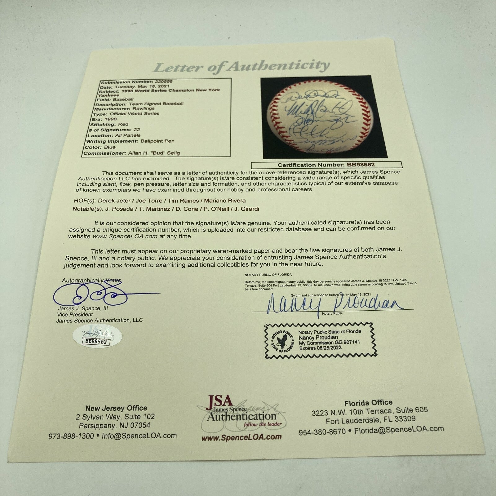 Back on top as the dominant squad of the era, a position they held throughout most of the 20th century, this 1998 New York Yankees World Champion Team Signed Official 1998 World Series ball contains 22 signatures with, of course, Manager Joe Torre on the sweet spot. Derek Jeter displays prominently, with Lloyd, Spencer, Mendoza, Posada, O' Hernandez, O'Neill (x2), Cone, Sojo, Raines, Leder, Stanton, Bush, Nelson, Brosius, T. Martinez, Rivera, Knoblauch, Davis, and Girardi. Full LOA from JSA.