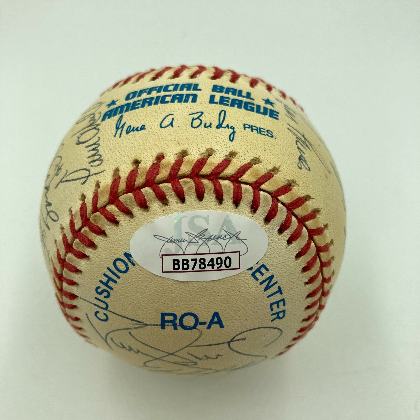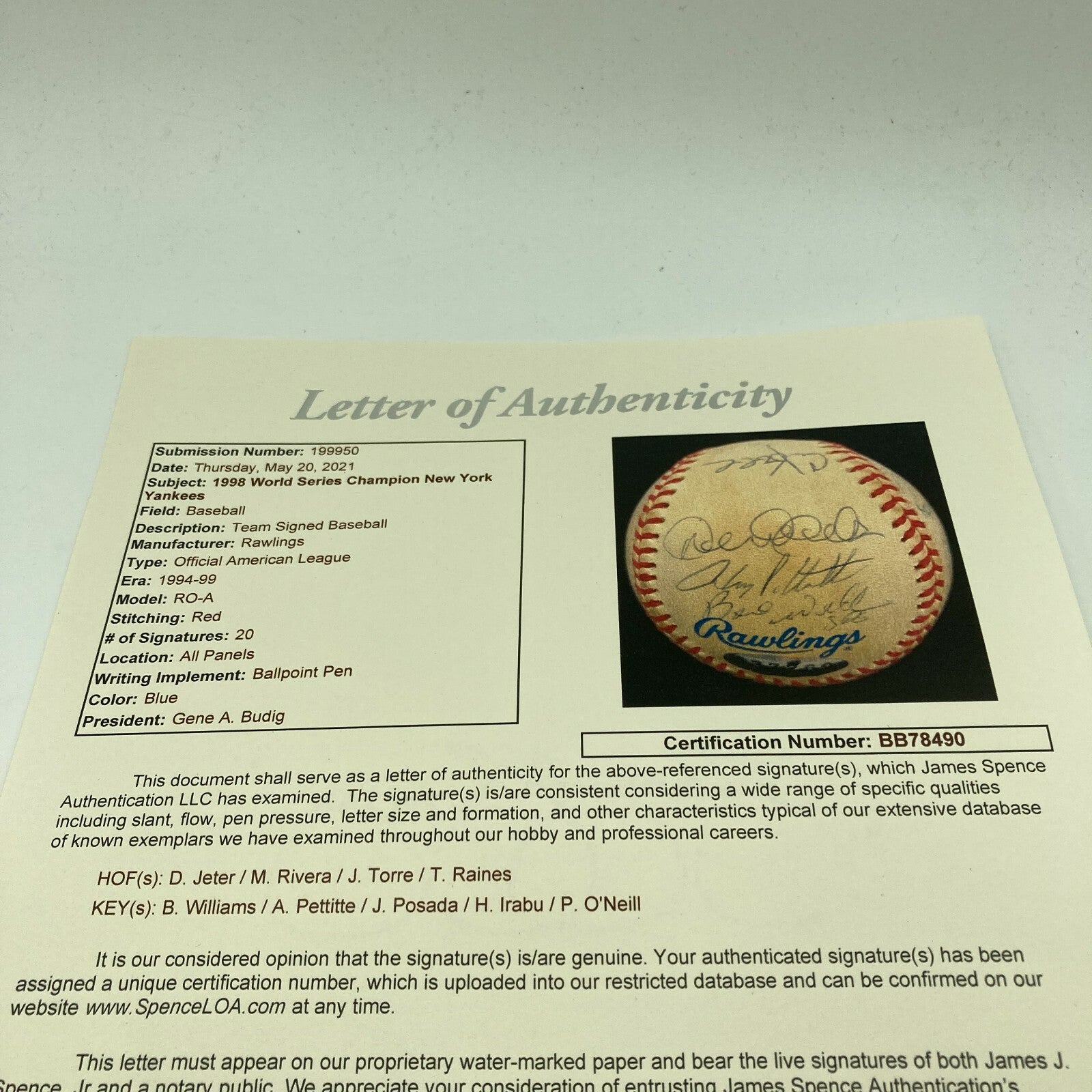 1998 New York Yankees World Series Champs Team Signed American League Baseball. 20 signatures with Derek Jeter, Mariano Rivera, Joe Torre, Tim Raines, Bernie Williams, Andy Pettitte, Jorge Posada, Paul O'neill and many others. Full letter JSA COA.