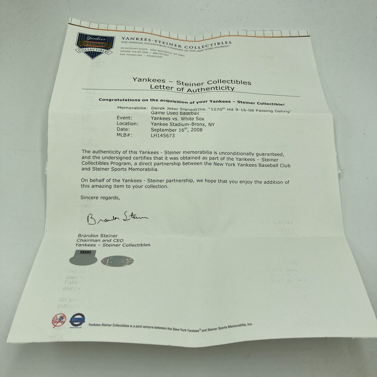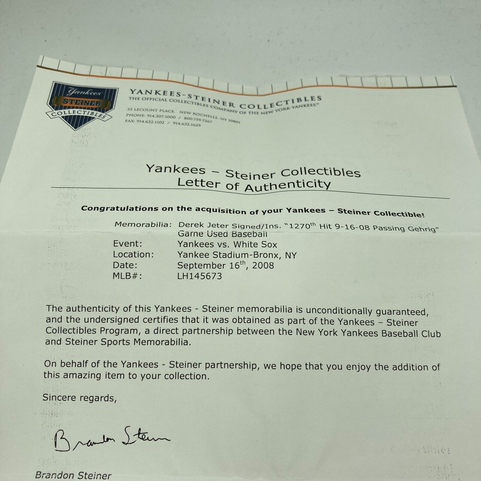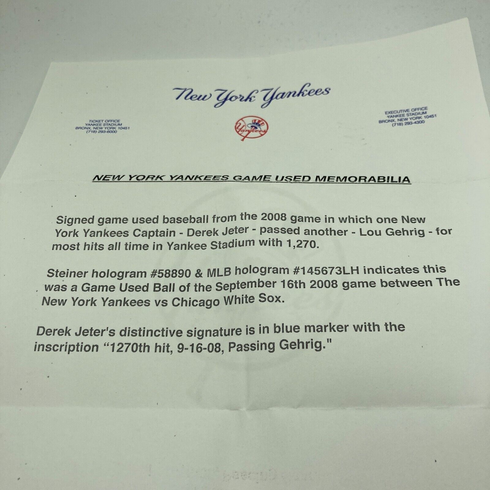 History was made when Hall of Famer Derek Jeter smacked a single during the first inning of the Yankees' 6-4 loss to the Chicago White Sox, as he recorded his 1,270th hit at home, surpassing Hall of Famer Lou Gehrig for most career hits by a Yankee at Yankee Stadium. Jeter placed his gorgeous signature and the inscription "1270th Hit 9-16-08 Passing Gehrig" with a blue ballpoint pen on the south panel of this offered Official Major League Allan H. Selig baseball. The ball comes with a COA from Steiner (58890), an MLB Authenticated hologram (LH145673) and an LOA from the New York Yankees for the game use, signature, and inscription.