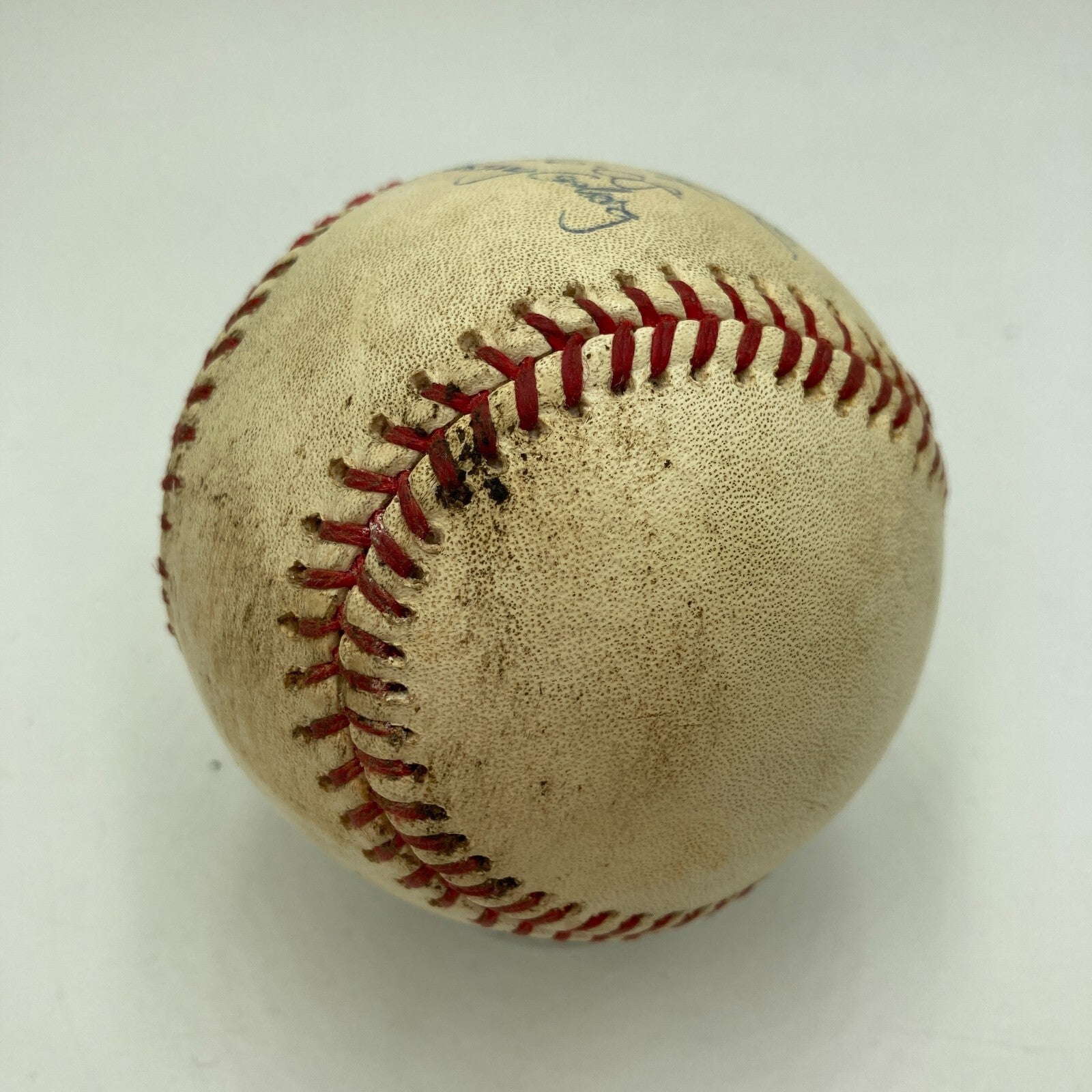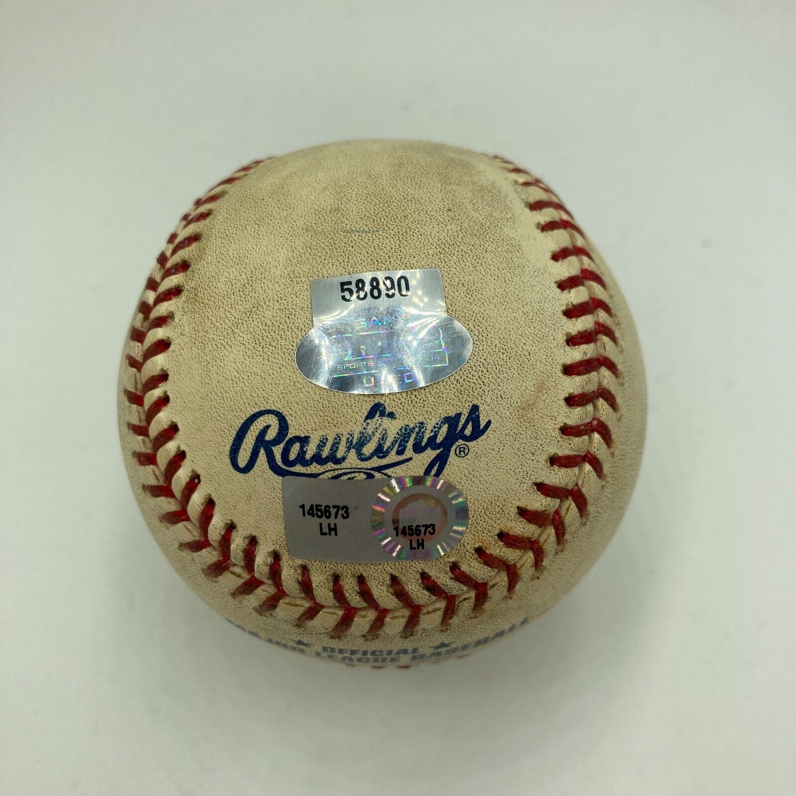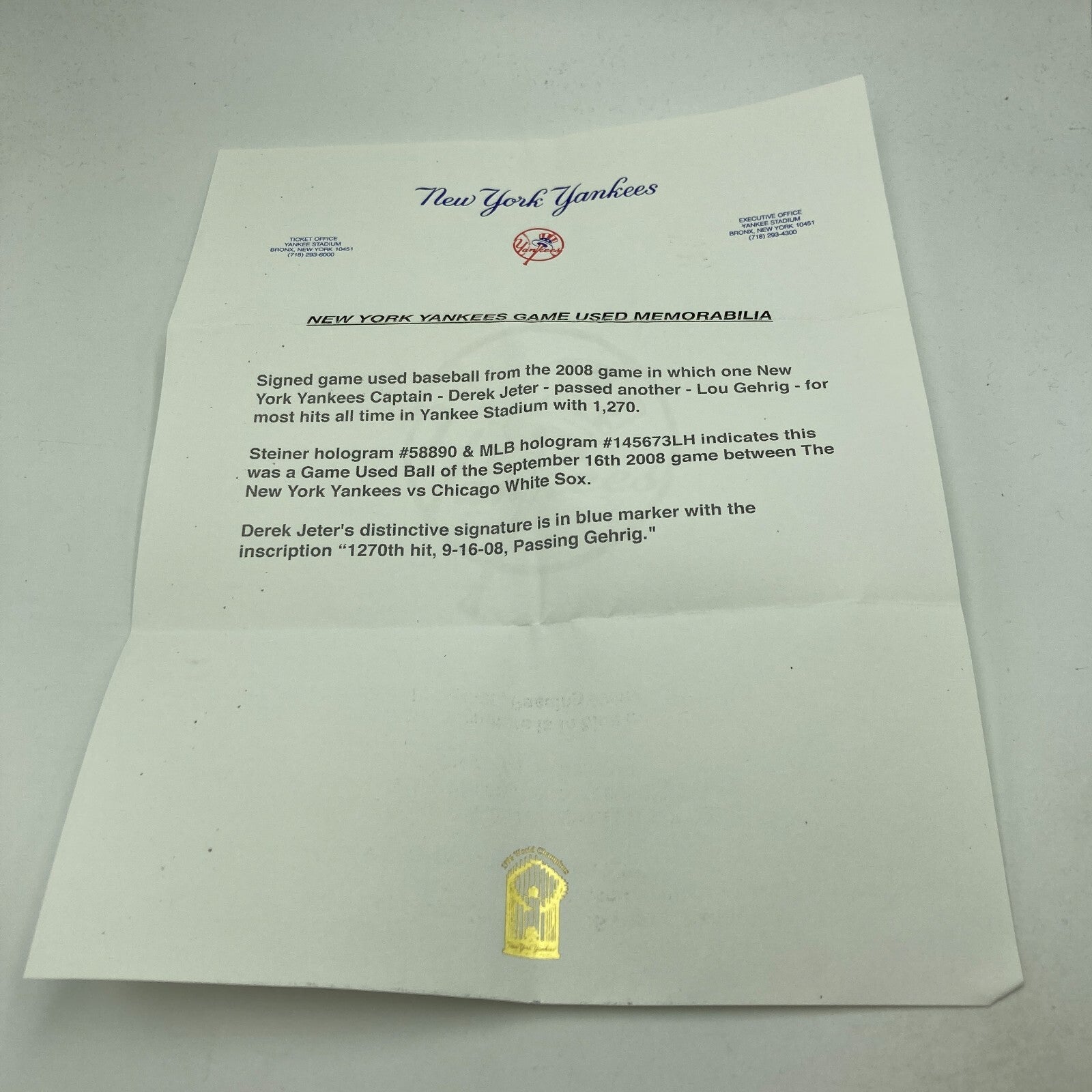 History was made when Hall of Famer Derek Jeter smacked a single during the first inning of the Yankees' 6-4 loss to the Chicago White Sox, as he recorded his 1,270th hit at home, surpassing Hall of Famer Lou Gehrig for most career hits by a Yankee at Yankee Stadium. Jeter placed his gorgeous signature and the inscription "1270th Hit 9-16-08 Passing Gehrig" with a blue ballpoint pen on the south panel of this offered Official Major League Allan H. Selig baseball. The ball comes with a COA from Steiner (58890), an MLB Authenticated hologram (LH145673) and an LOA from the New York Yankees for the game use, signature, and inscription.