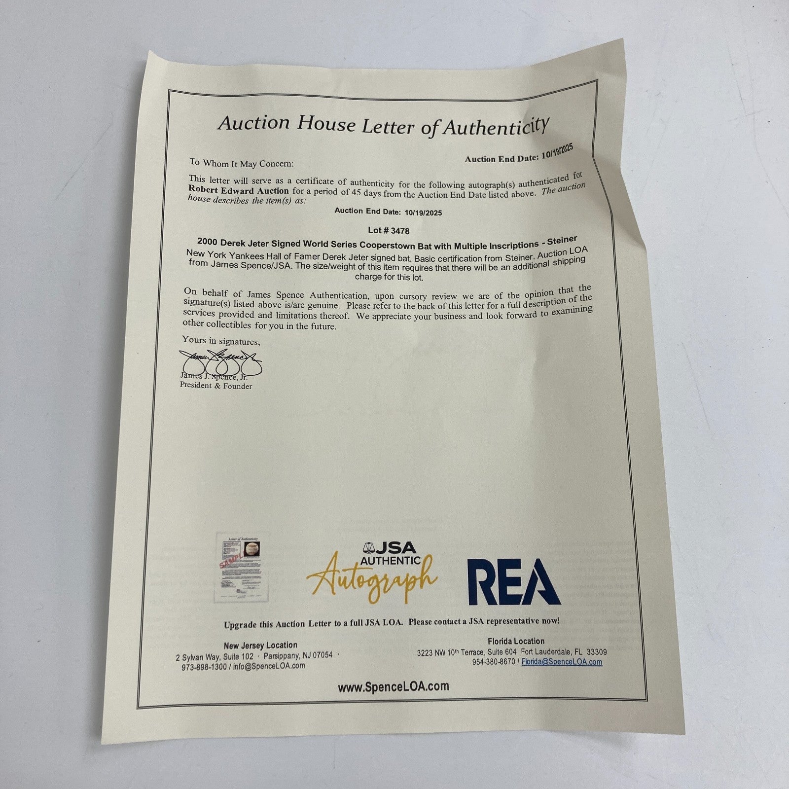 Derek Jeter "1998 1999 2000 W.S. Champs 3 Peat" Signed Inscribed Baseball Bat With Steiner and JSA COA.