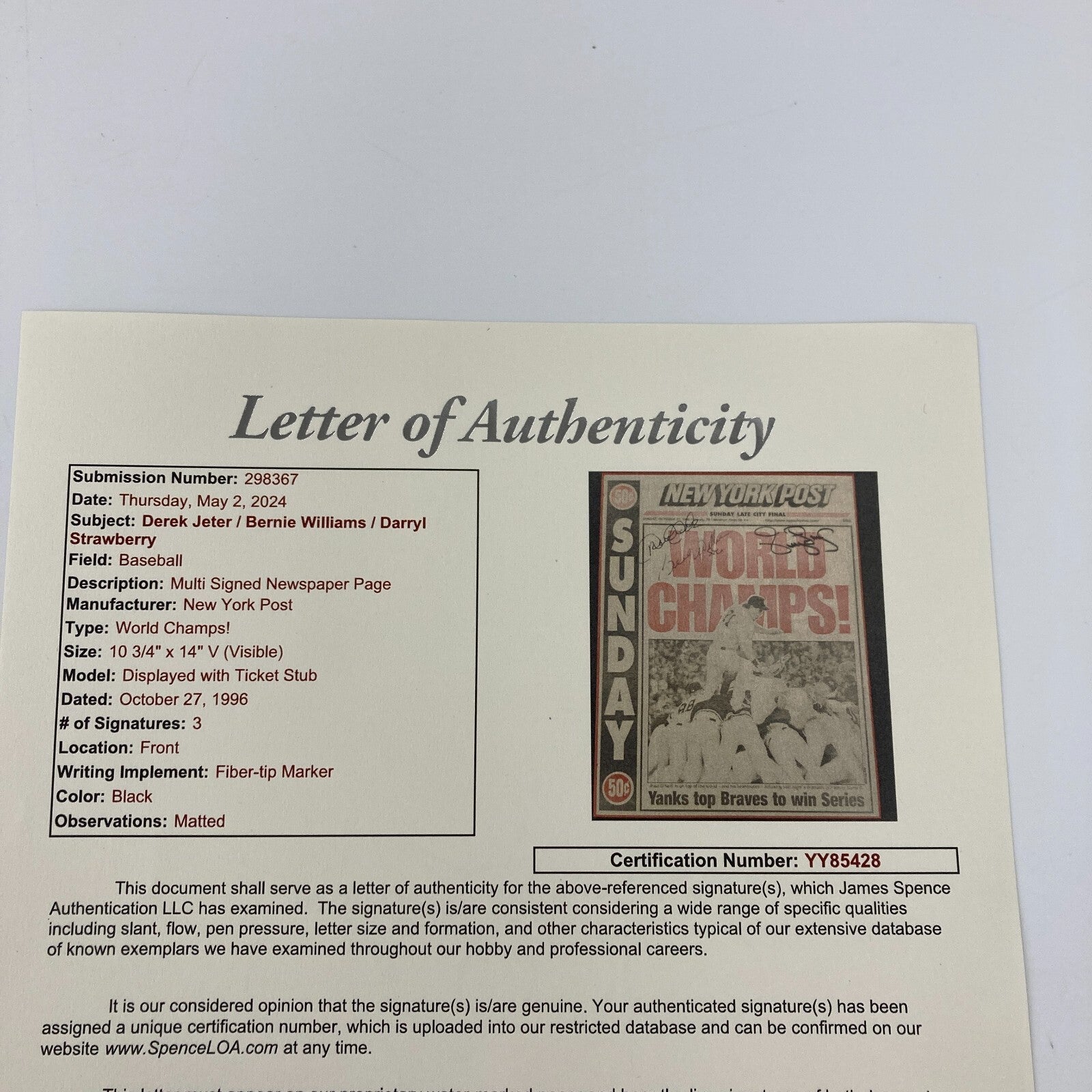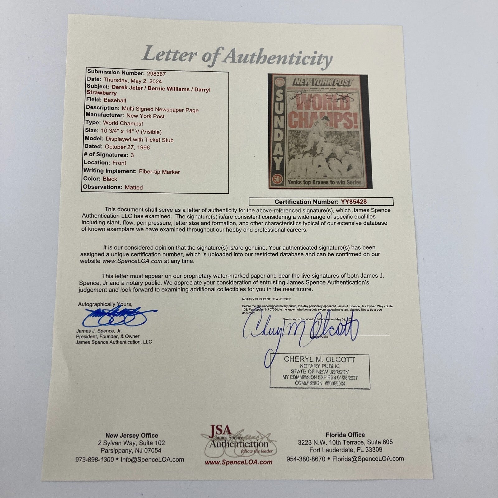 Derek Jeter & Bernie Williams Signed 1996 World Series New York Post Cover. Also comes with original 1996 World Series Ticket.