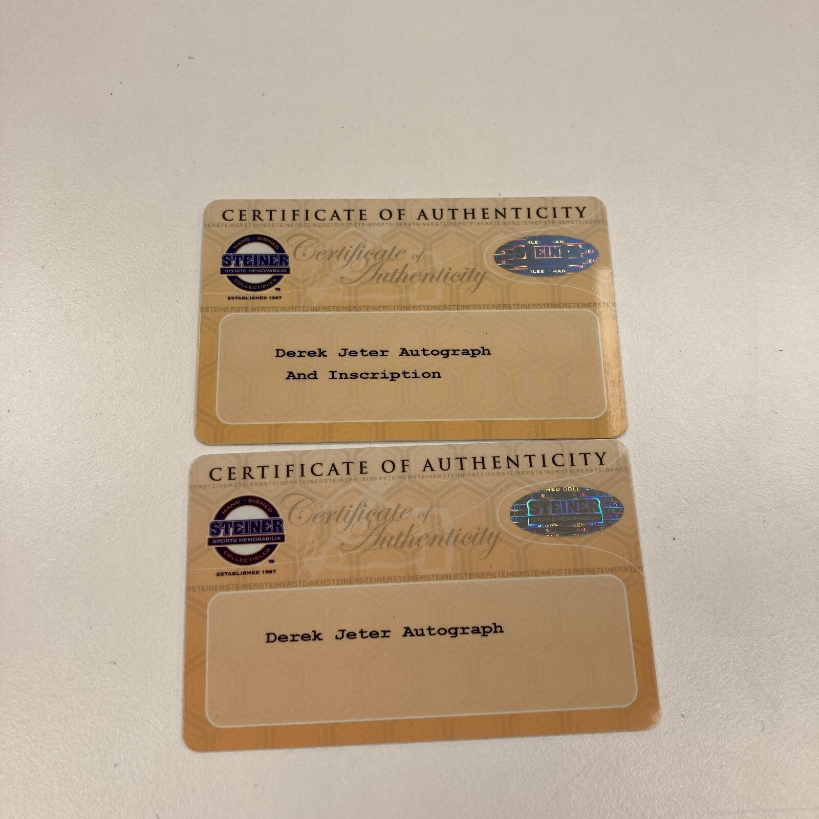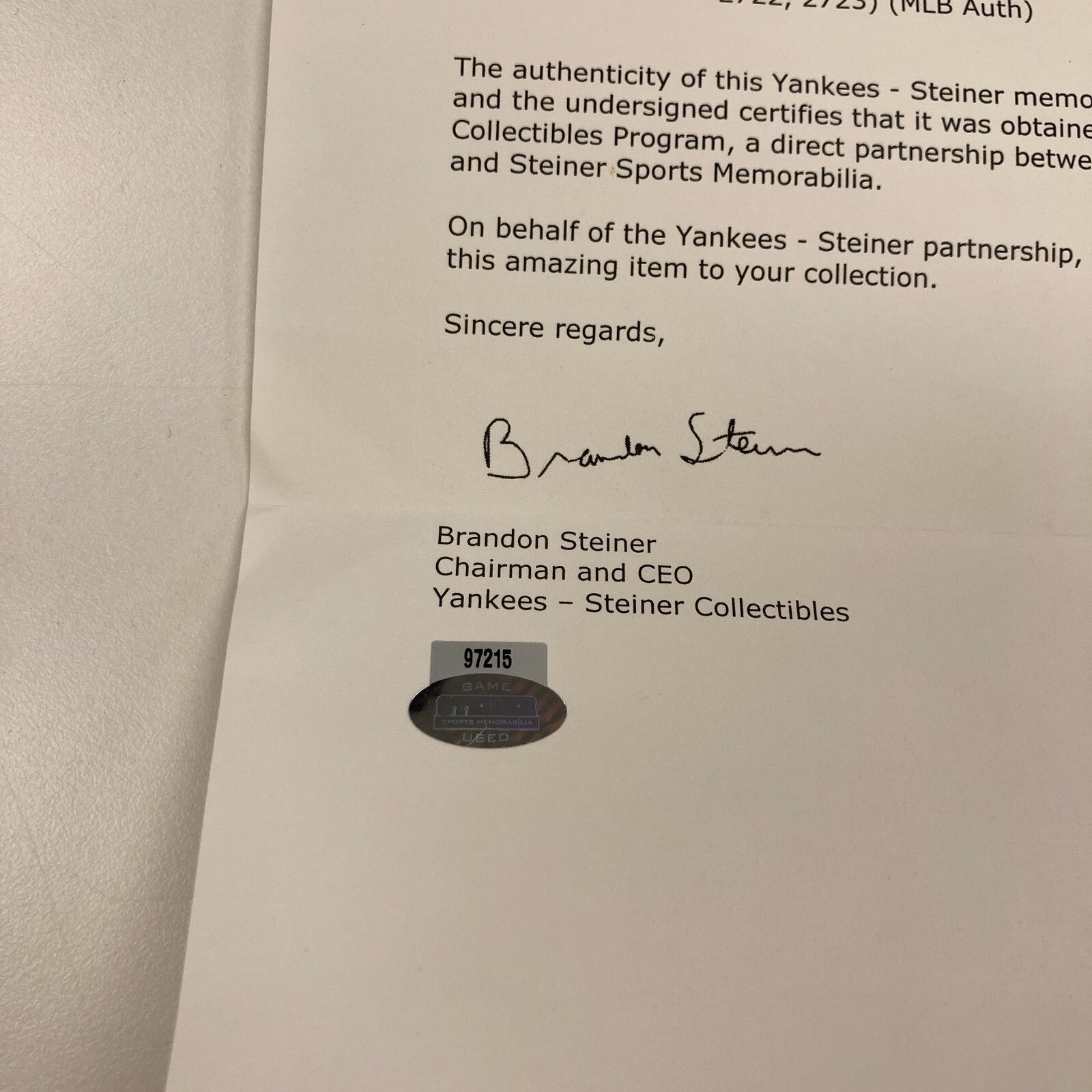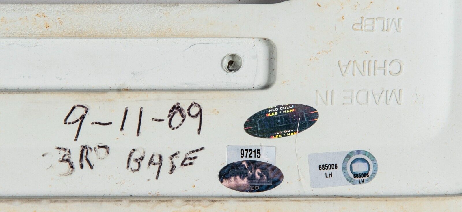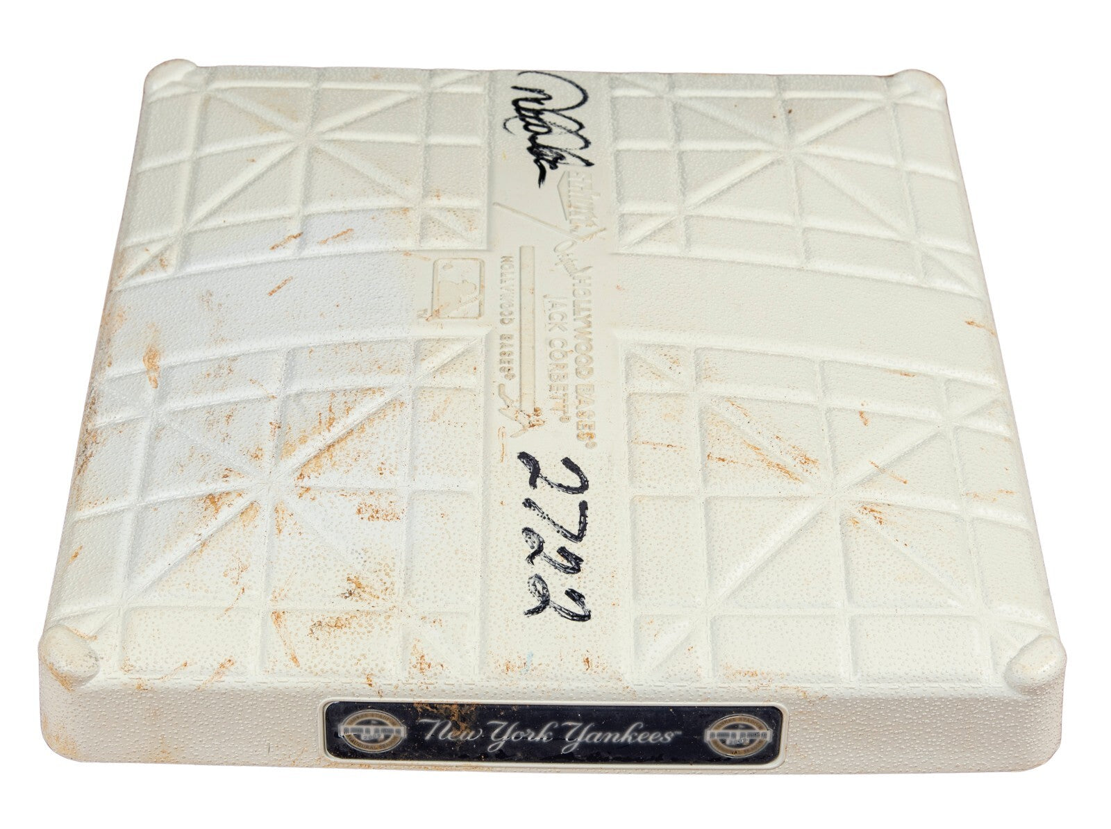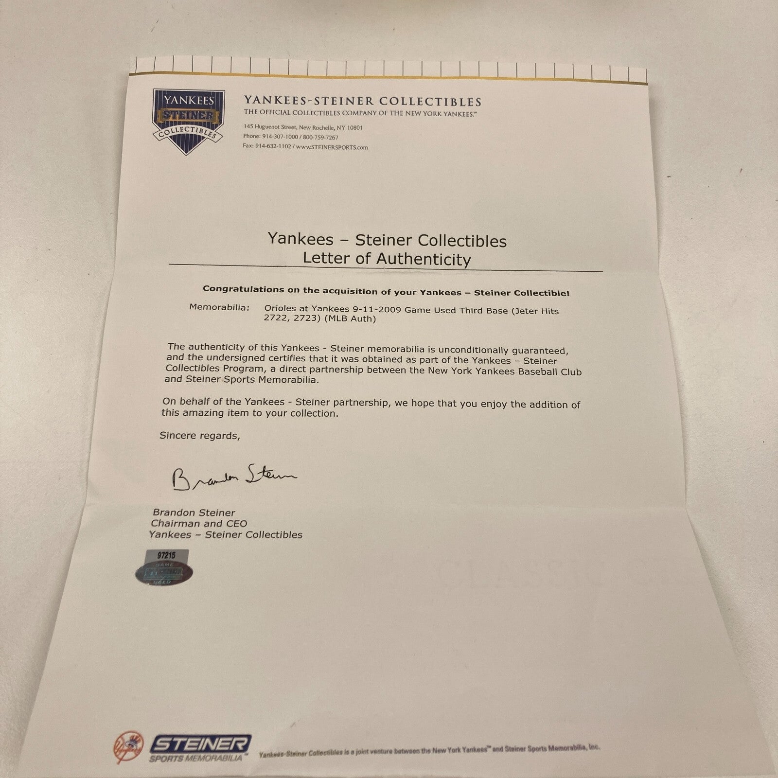 As he did many times during his illustrious career, Hall of Famer Derek Jeter made history during the Yankees' 10-4 loss at Yankee Stadium to the Baltimore Orioles on Sept. 11th, 2009. Jeter cracked a third-inning single off Chris Tillman to surpass Lou Gehrig's seven-decade hit record with 2,722 hits. Fans, who endured a rain delay and less than stellar conditions, rose in applause to honor Jeter's accomplishment. Jeter later added the 2,723rd hit during the loss. This third base, used during the second inning, displays excellent evidence of game use and contains dirt stains across the top of the base. "2009 New York Yankees" plaques flank each side. The underside of the Schutt base features the inscription "9-11-09 3rd Base," inscribed in black marker. Jeter placed a flowing black marker signature and the inscription "2722" across the base's top. The base comes with an LOA from Steiner (97215) for game use and an MLB Authenticated hologram (LH685006) for game use, signature, and inscription.