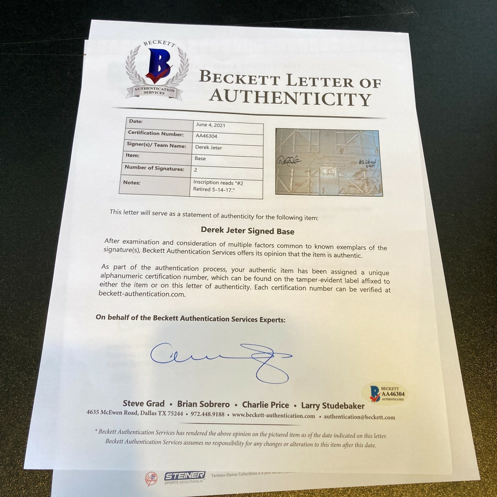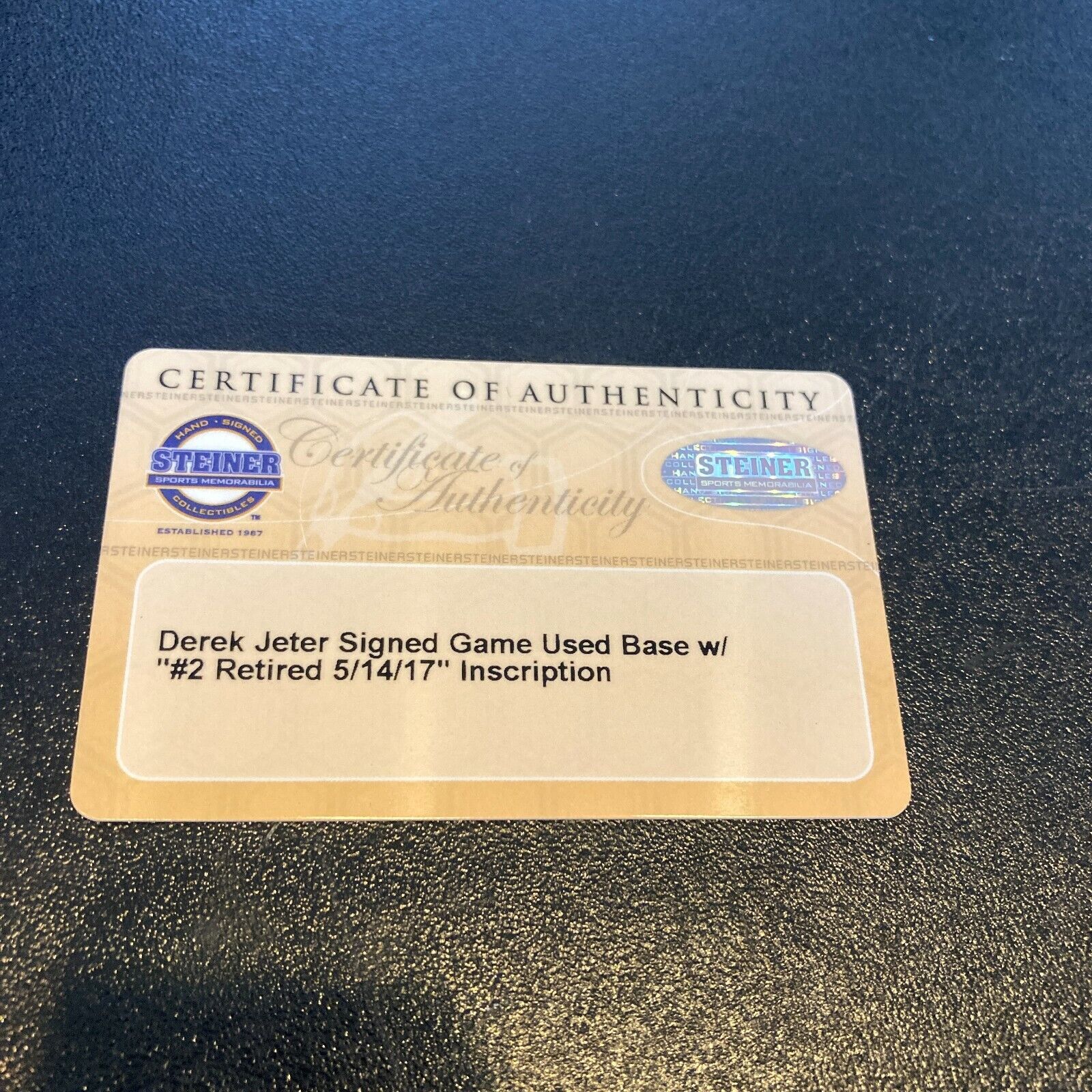 The offered base has tons of use and has "THE CAPTAIN" "NEW YORK YANKEES MAY 14, 2017" molded into opposite sides with "2" Molded into the other ends. Jeter has signed the base and inscribed "#2 Retired 5/14/17" in bold black marker. An outstanding tribute to the captain and beautiful keepsake for any advanced Yankee collector. Authentication from Steiner, MLB and Beckett.
