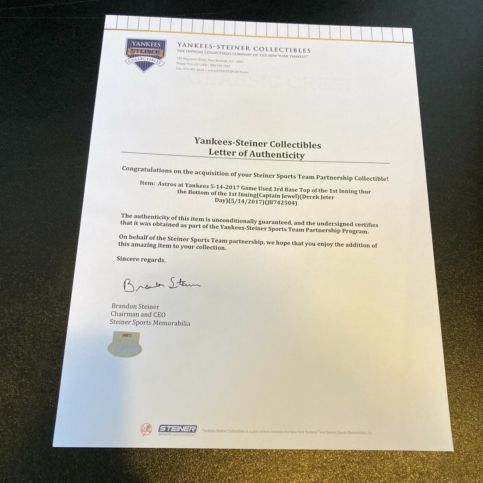 Derek Jeter May 14, 2017 #2 Jersey Retirement Day Signed Game Used Base Steiner