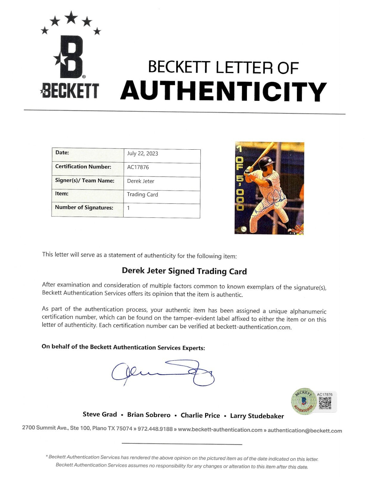 Click or scroll to zoom Tap or pinch to zoom Click or scroll to zoom Tap or pinch to zoom Click or scroll to zoom Tap or pinch to zoom Click or scroll to zoom Tap or pinch to zoom Derek Jeter Signed 1994 Signature Rookies Auto 8x10 Card LE #324/1000 Beckett $425.00 1 2 3 4 5 6 7 8 9 10+ Quantity Quantity Add to cart This item is a recurring or deferred purchase. By continuing, I agree to the cancellation policy and authorize you to charge my payment method at the prices, frequency and dates listed on this page until my order is fulfilled or I cancel, if permitted. Derek Jeter autographed 1994 Signature Rookies 8x10 Card Limited Edition #324/1000. Accompanied by a Beckett Letter of Authenticity.