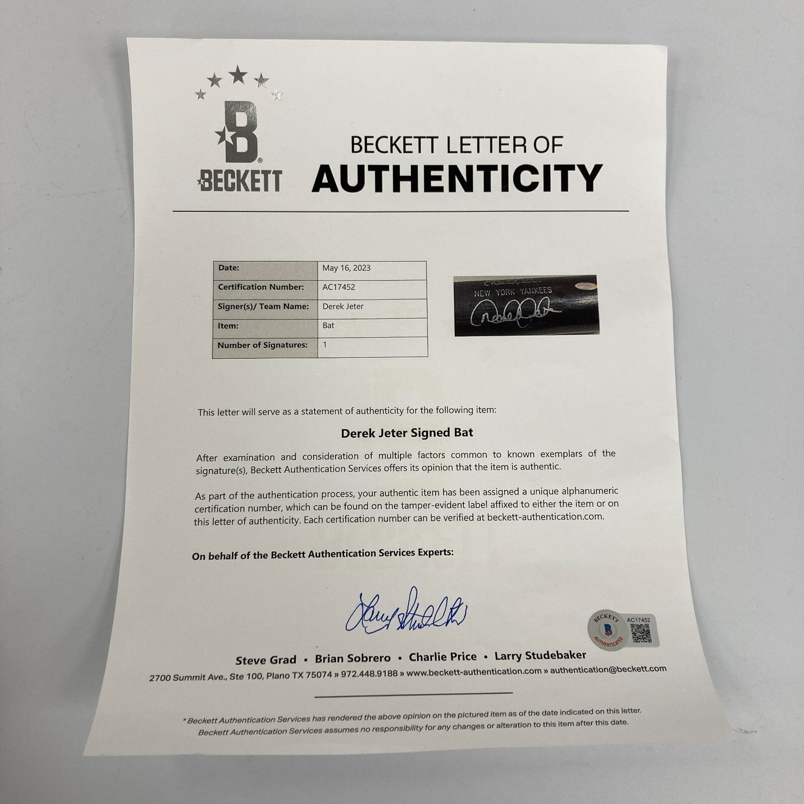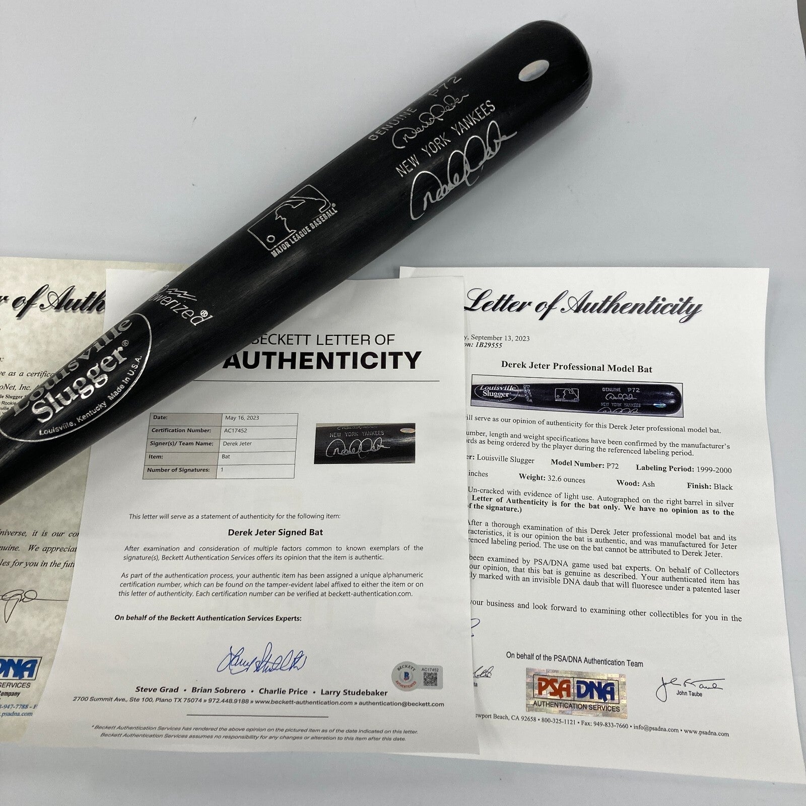 Presented is a Louisville Slugger P72 model bat used by New York Yankees legendary shortstop Derek Jeter between the 1999 and 2000 seasons. Jeter has penned his flowing signature in silver marker across the bat's barrel. The bat exhibits excellent game use with an uncracked handle. Pine tar coats the handle, and the bat contains multiple scratches and ball impressions across the barrel. The bat comes with a COA from Steiner and an LOA from Beckett (AC17452) for signature, and a full letter COA from PSA/DNA (1B29555) for game use.