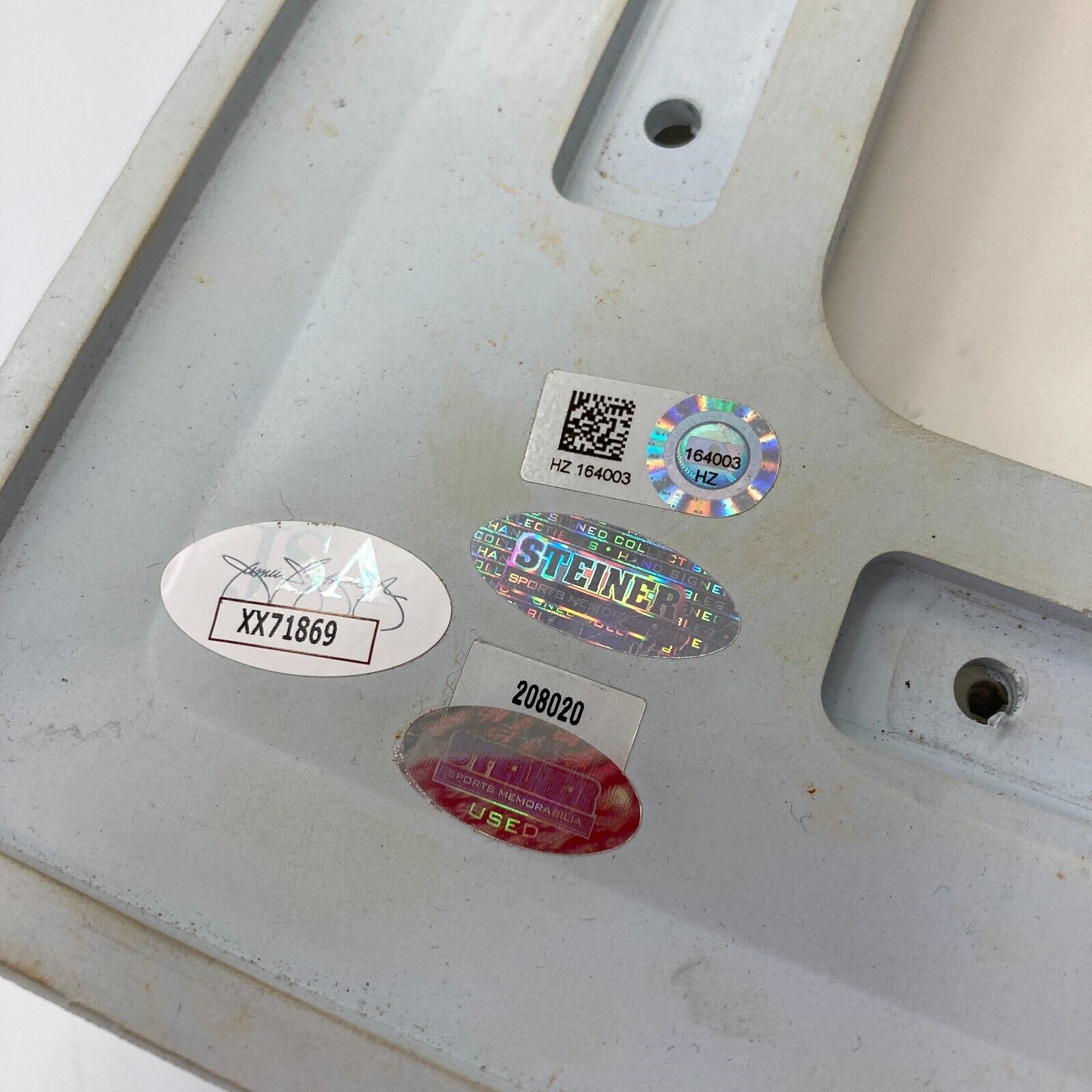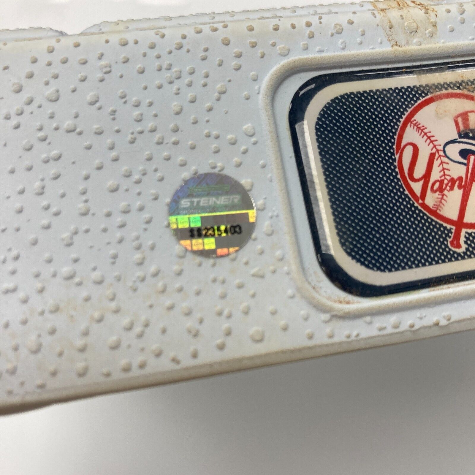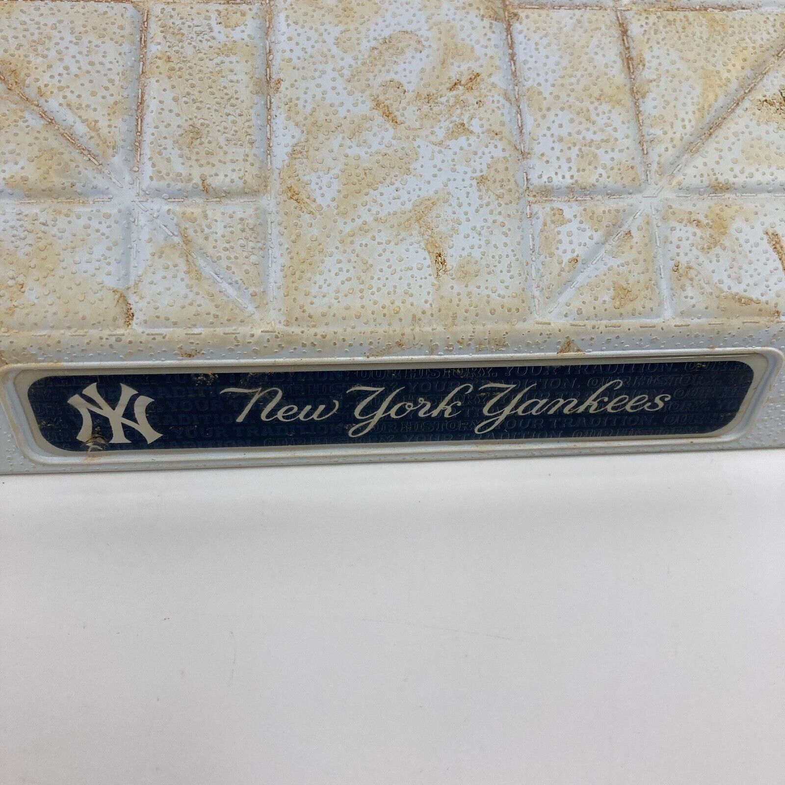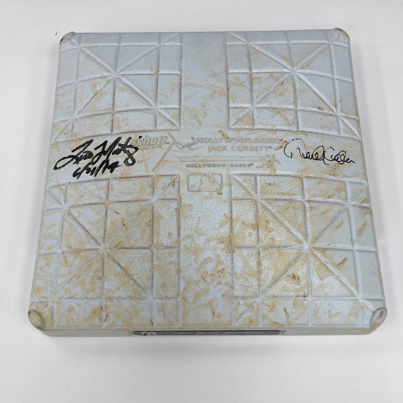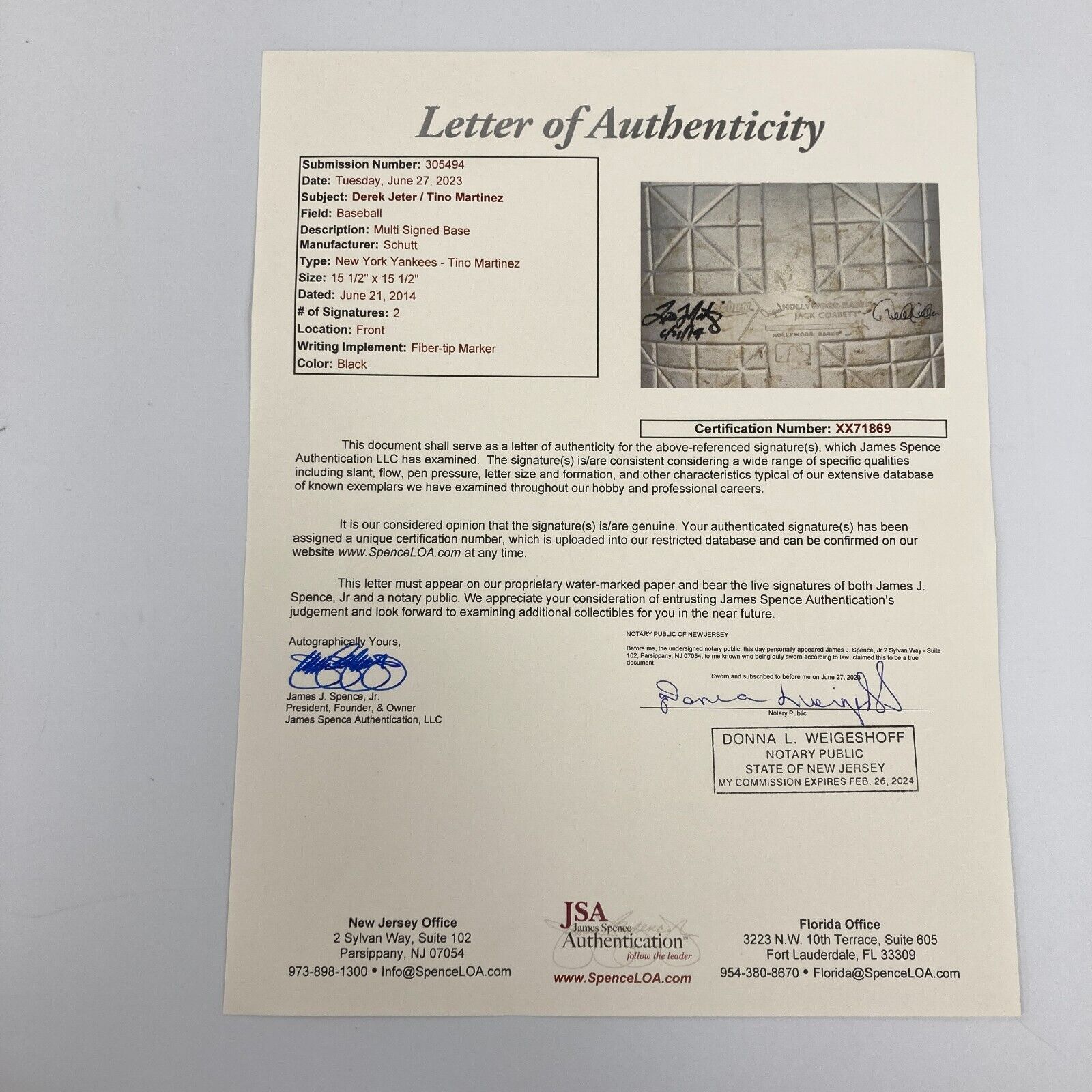 Presented is the first base used in the sixth and seventh innings on Tino Martinez Day on June 21, 2014. The base has been signed by Tino Martinez and his former teammate and New York Yankee legendary shortstop Derek Jeter. Both have penned their flowing signatures in black marker. With Martinez as a spectator, Jeter singled in the eighth inning for his only hit of the game against the Baltimore Orioles in a 6-1 loss. The base exhibits excellent wear, with dirt stains throughout, and comes with an MLB Authenticated hologram (HZ164003) for game use, a COA from Steiner, and an LOA from JSA for Tino Martinez and Derek Jeter's signature, respectively.