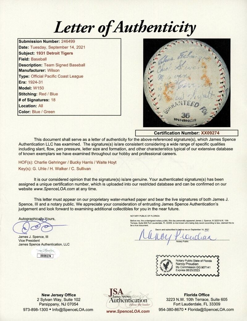 In 1931, the Detroit Tigers finished the season with a forgettable 61-93 record, 47 games behind the AL Pennant winning Philadelphia Athletics. Though there were a few bright spots during the season with Dale Alexander, Charlie Gehringer, Billy Rogell and John Stone topping the .300 batting mark, each pitcher, including Hoyt, posted losing records. Offered is an Official Pacific Coast League baseball signed by 20 players and coaches from that hapless squad with signatures ranging from 2-7 strength due to fading. Inscribed "Detroit – 1931" in green ink, notable autographs include Hall of Fame manager Bucky Harris (4-5), ace Earl Whitehill (4) on the sweet spot, 3X World Series champ Joe Dugan, Hall of Famers Waite Hoyt (4) also in green and Chas. Gehringer (5) in black, 6X All-Star Tommy Bridges (3-4) and four-time All-Star Whit Wyatt, Harry Walker, Elon Hogsett, Wally Schang, George Uhle, Frank Doljack, Bill Akers and Ray Hayworth among others . Toning is visible on a few panels. Despite finishing 32 games below .500, the '31 Detroit Tigers rostered two of the greatest players and one of the best managers Major League Baseball has ever seen. Make it a point to add this one to your Tigers or team-signed ball collection! JSA LOA included.