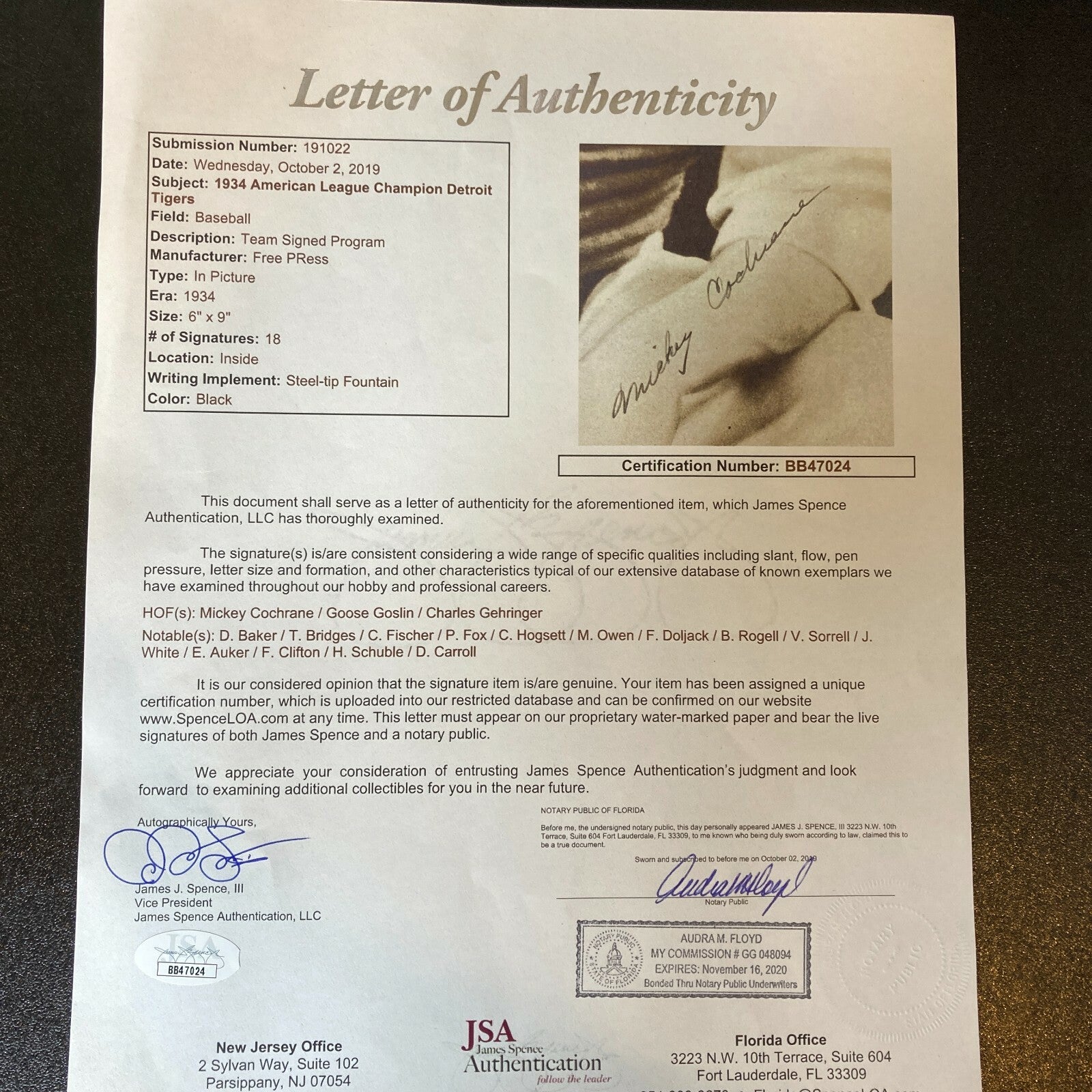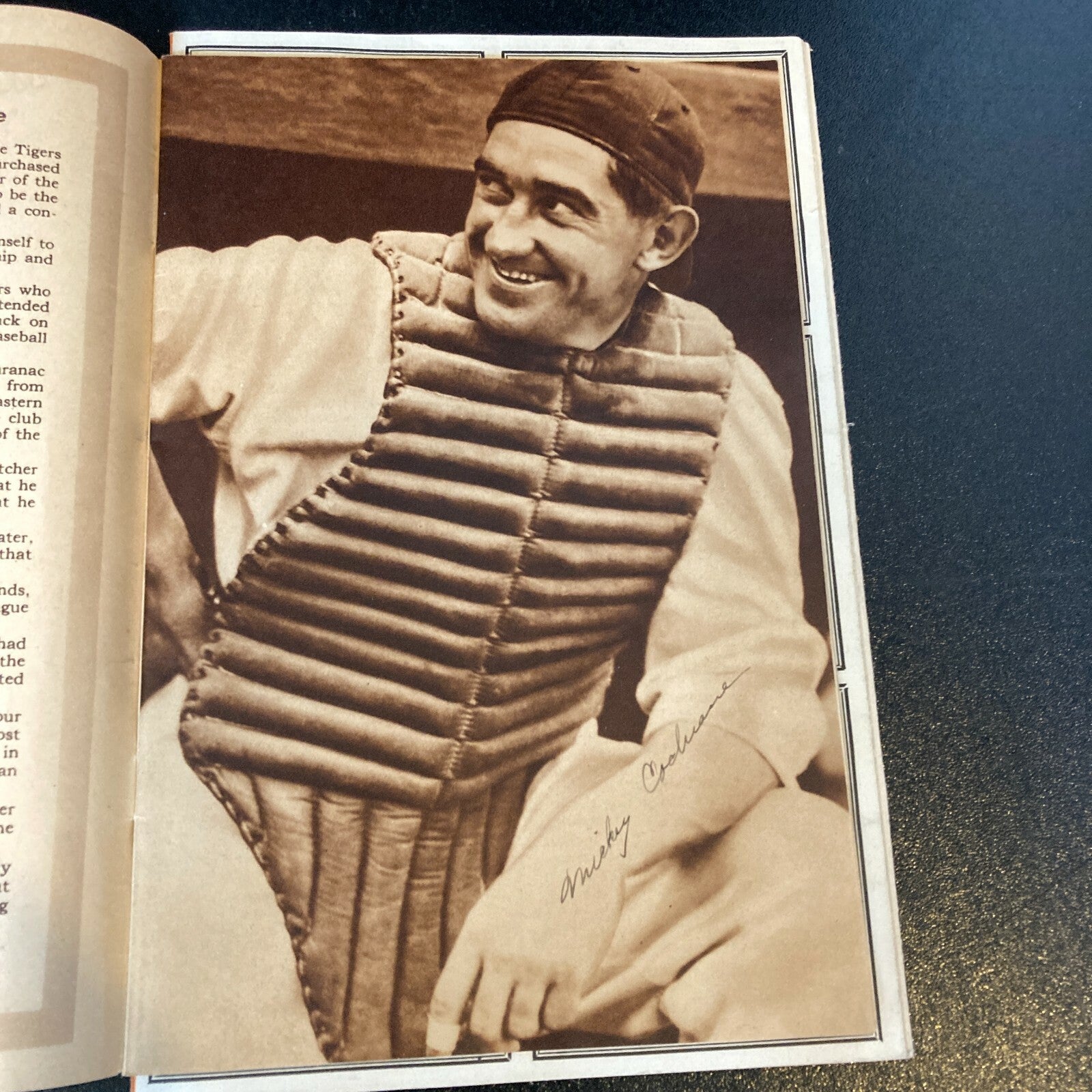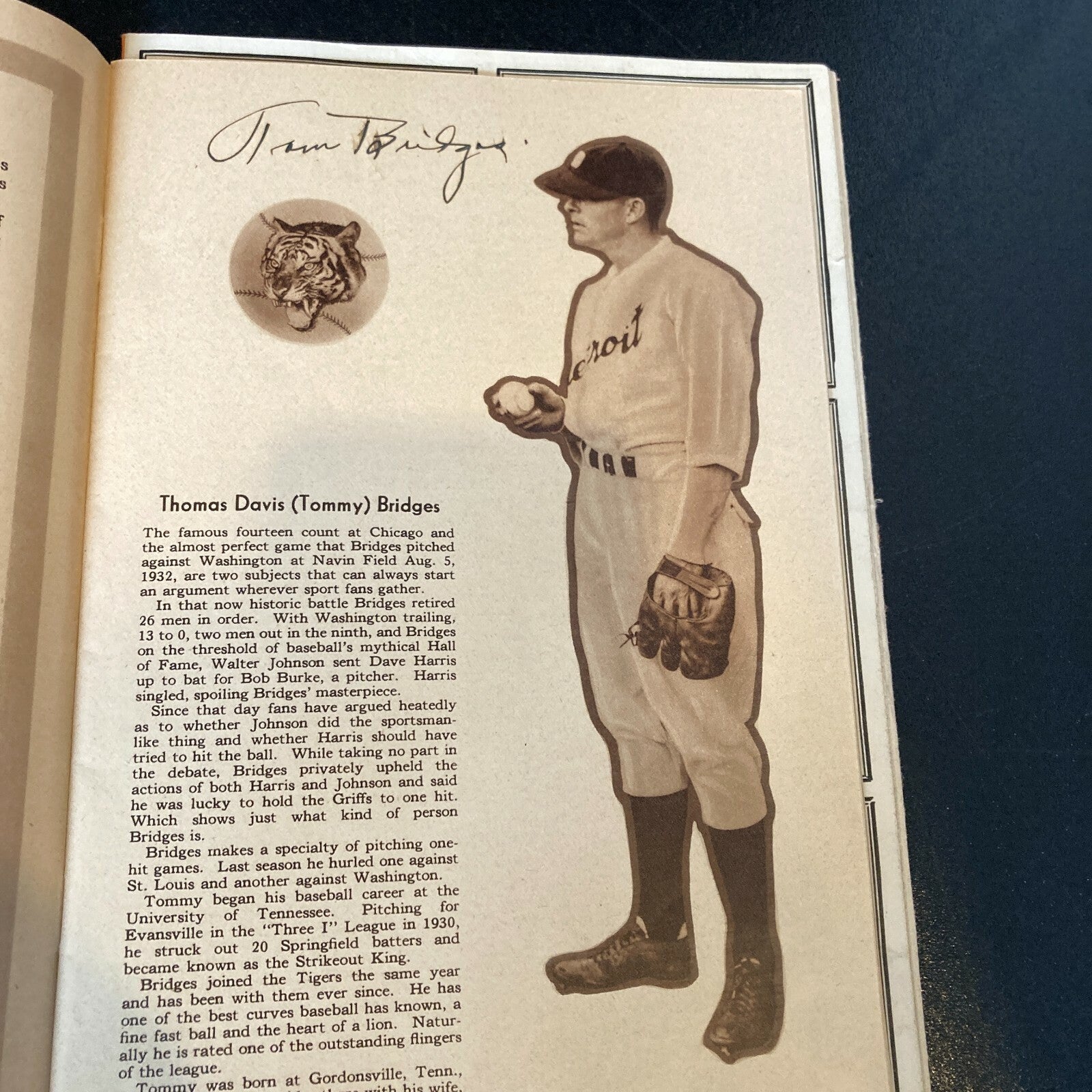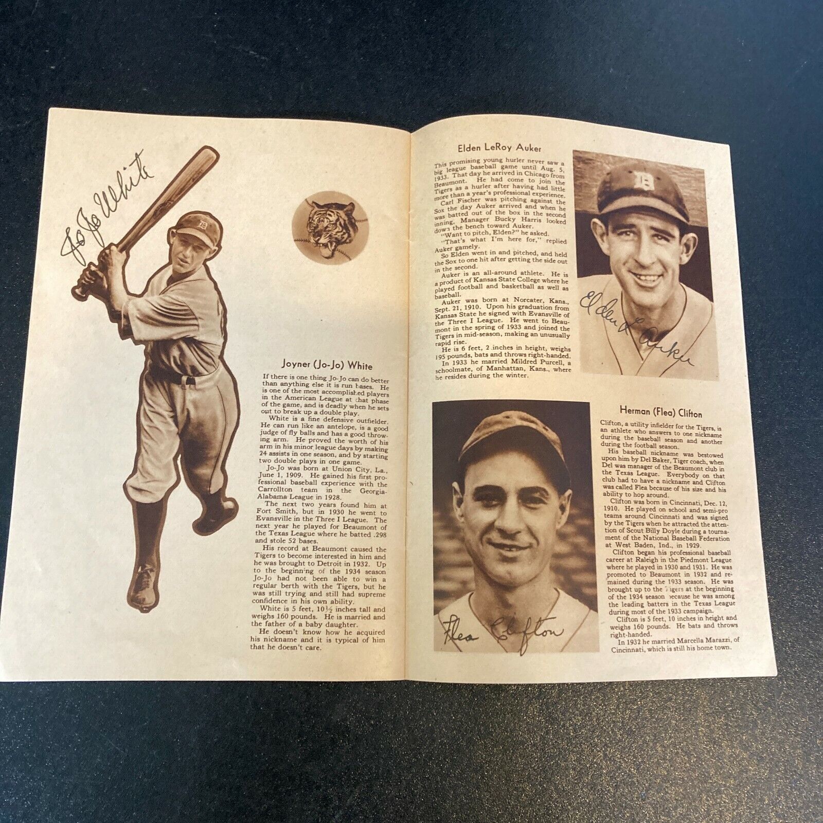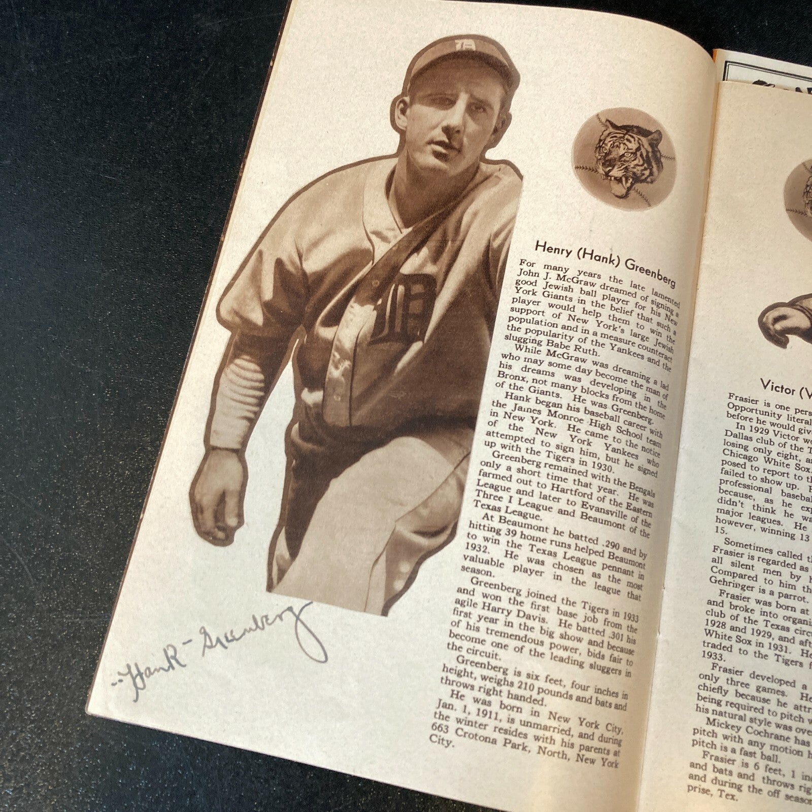 1934 Detroit Tigers Yearbook – This is one of the earliest signed yearbooks published by a big-league ball club, and it’s a beauty published by the American League champion Detroit Tigers. The book has photos been signed by (18 ) and bios of all of the players – including Hall of Famer Mickey Cochrane (who was the player-manager or the team) as well as other Hall members Hank Greenberg, Charlie Gehringer, and Goose Goslin. Other notables on the team were Carl Fischer, Tommy Bridges, Pete Fox, Chief Hogsett, Marvin Owen, Bill Rogell, Victor Sorrell, JoJo White, Eldon L. Auker, Flea Clifton, Frank Doljack, Heinie Schuble, Denny Carroll, and Del Barker. There’s also a brief history of baseball in the Motor City and a great double-spread photo of Navin Field. Signatures are signed in blue steel-tip- fountain pen. FUll letter JSA COA.