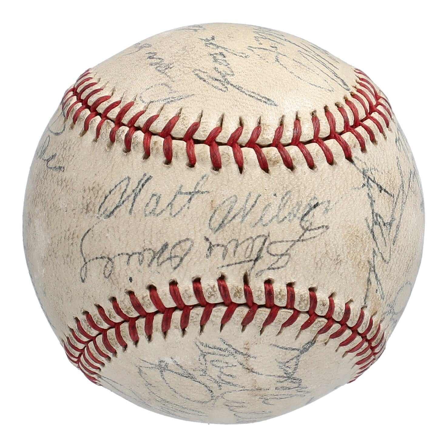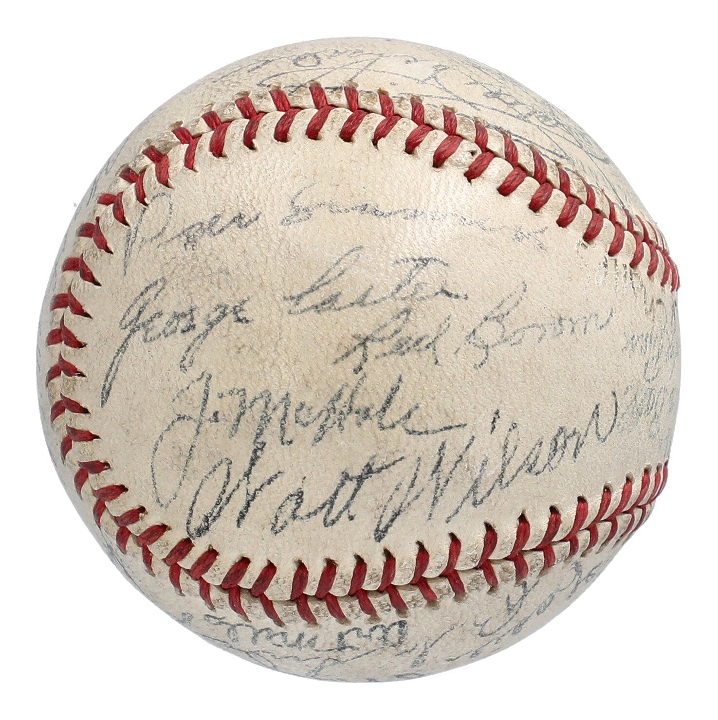 Presented is an Official American League William Harridge baseball that contains the signatures of 21 members of the 1945 World Series champion Detroit Tigers. The Tigers finished the regular season with 88 wins before defeating the Chicago Cubs in seven games in the World Series. Each signature has been penned in black ink throughout the baseball. Signatures include Hall of Famer Hank Greenberg, Steve O'Neill, Walter Wilson (who has signed twice), Dizzy Trout, Roy Cullenbine, Rudy York, Russ Kerns, George Caster, Red Borom, John McHale, Doc Cramer, Stub Overmire, Eddie Mayo, Bob Swift, Art Mills, Jim Tobin, Skeeter Webb, Paul Richards, and Chuck Hostetler. A clubhouse version of Hal Newhouser's signature is also present on the ball. Comes with an LOA from Beckett (AE01446) for signatures.