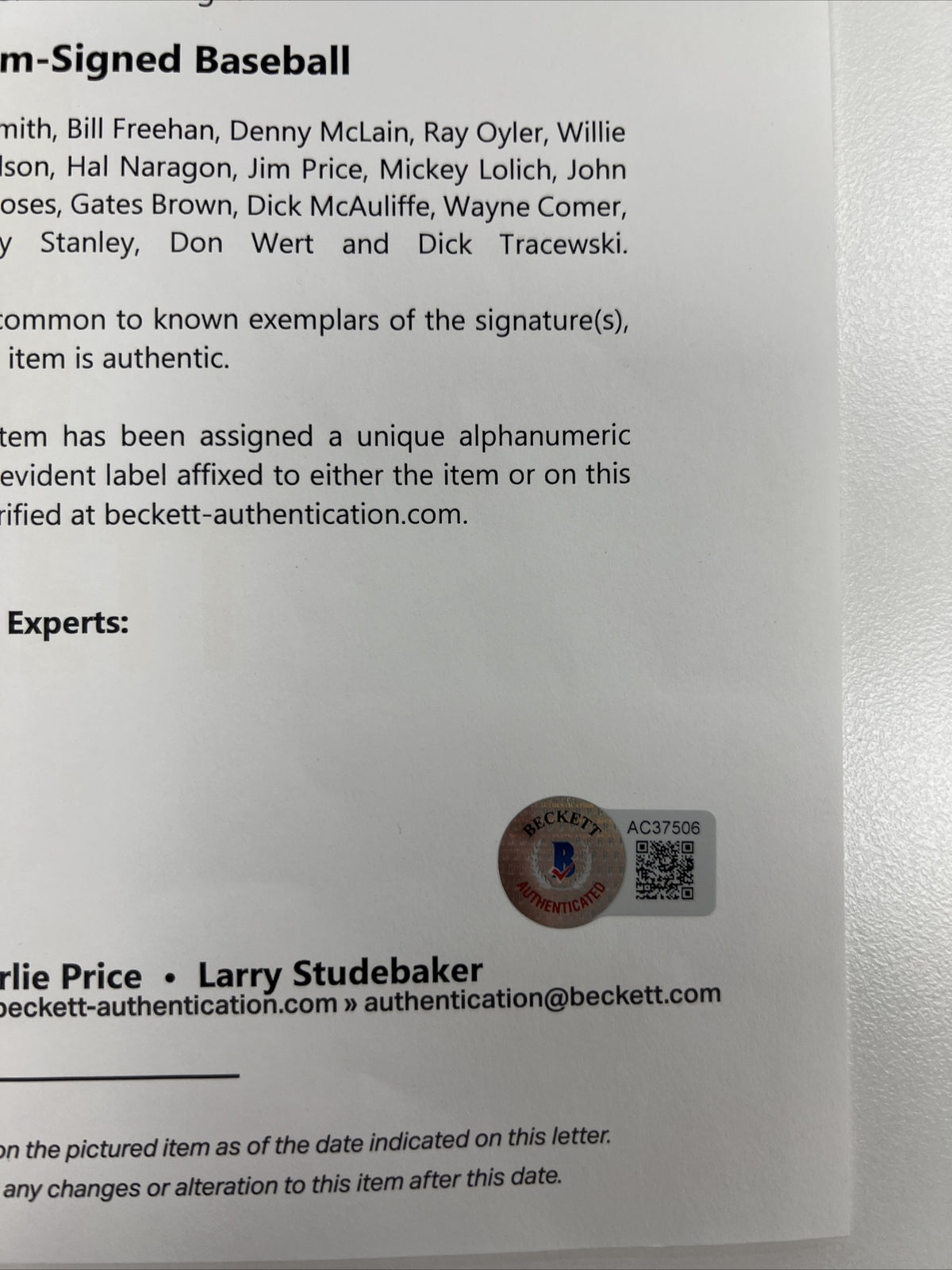 This Official American League (Joseph E. Cronin) baseball has been signed in ink by 24 members of the 1968 World Champion Detroit Tigers. Manager Mayo Smith signed his name over the Official stampings on the highly presentable, off-white sphere. Hall of Famer Al Kaline's signature appears alone on the sweet spot, and additional autographs include those of 1968 A.L. MVP and Cy Young Award winner Denny McLain, plus Norm Cash, Mickey Stanley, Don Wert, Gates Brown, Joe Sparma, John Wyatt, Daryl Patterson, Wayne Comer, Willie Horton, Mickey Lolich and others. The ball comes with an LOA from Beckett Authentication for the signatures.