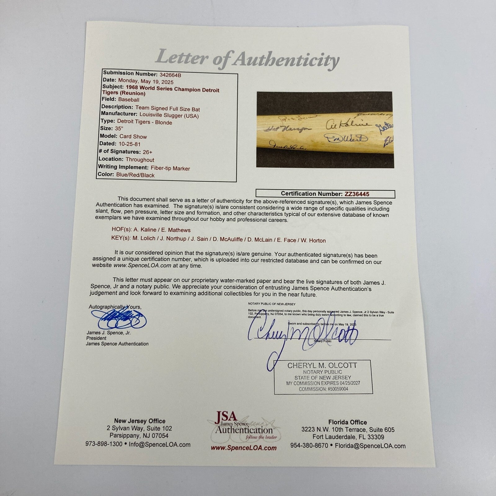 An awesome piece that we have not seen before, this is a custom bat produced for a 1981 card show in Michigan. There are approximately 26+ signatures on the bat. The autographs include the rare Norm Cash (D'1986 and impossible on items like this), Kaline, Mathews, McLain, Lolich, Freehan, Sain, Horton and Northrup.