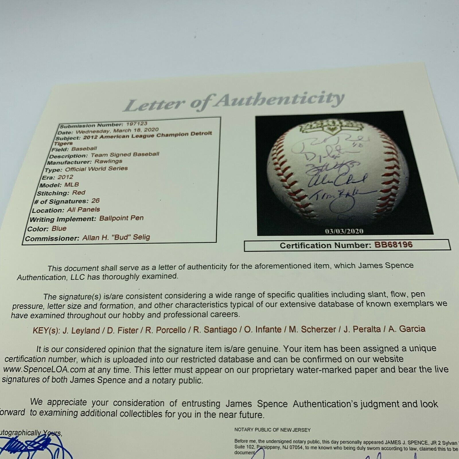 2012 Detroit Tigers Team Signed World Series Baseball With JSA COA