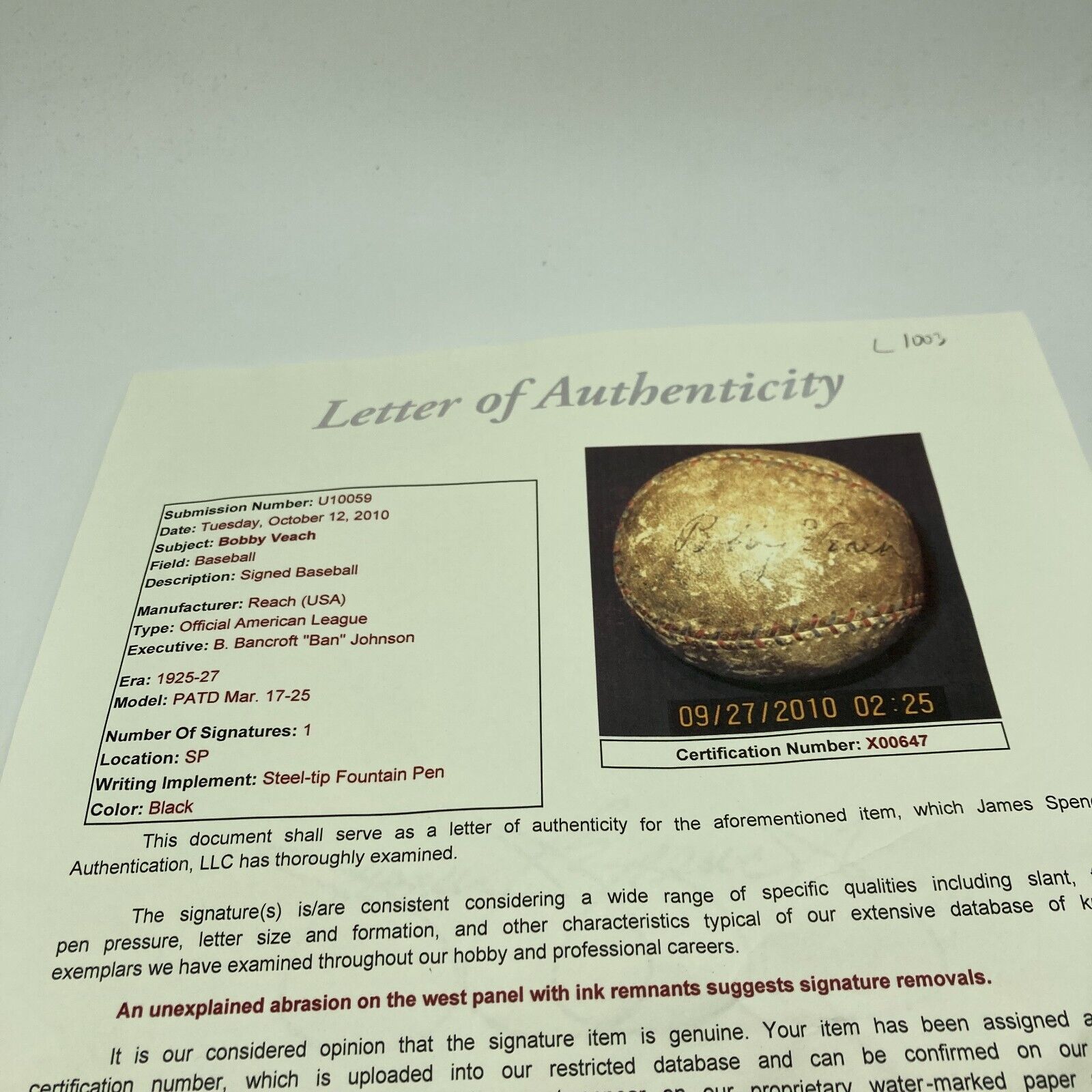 Presented is an official American League B. Bancroft "Ban" Johnson baseball signed by former Detroit Tigers outfielder Bobby Veach. Veach, a career .370 hitter from 1912 to 1925, has penned his flowing signature in black steel-tip fountain pen ink across the panel adjacent to the baseball's sweet spot. The baseball, which exhibits a heavy circulated manner of appearance consistent with a ball nearly a century old, comes with an LOA from JSA (X00647) for signature. The experts at JSA notes "an unexplained abrasion on the west panel with ink remnants suggests signature removals."