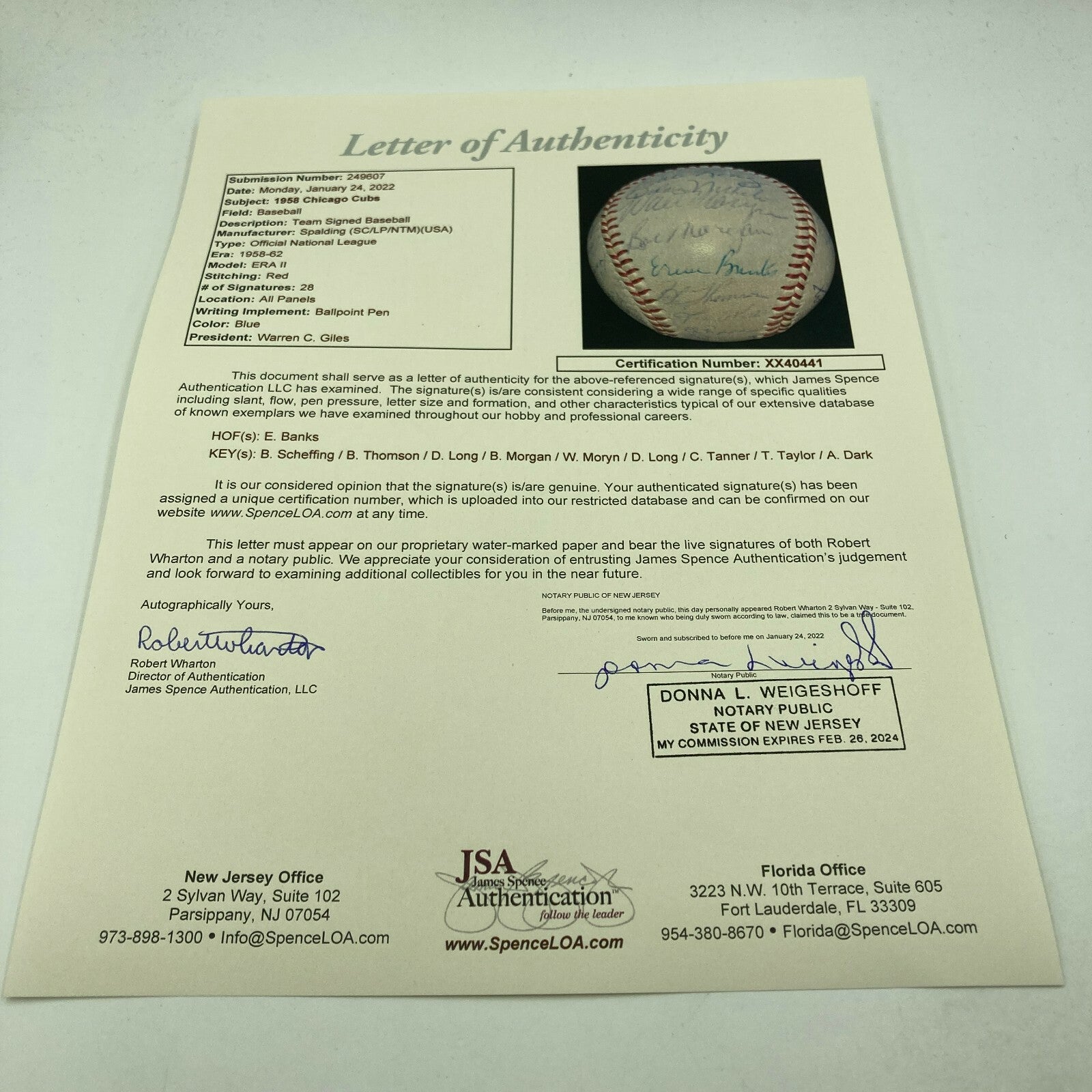 1958 Cubs Team Signed National League Baseball Ernie Banks JSA COA