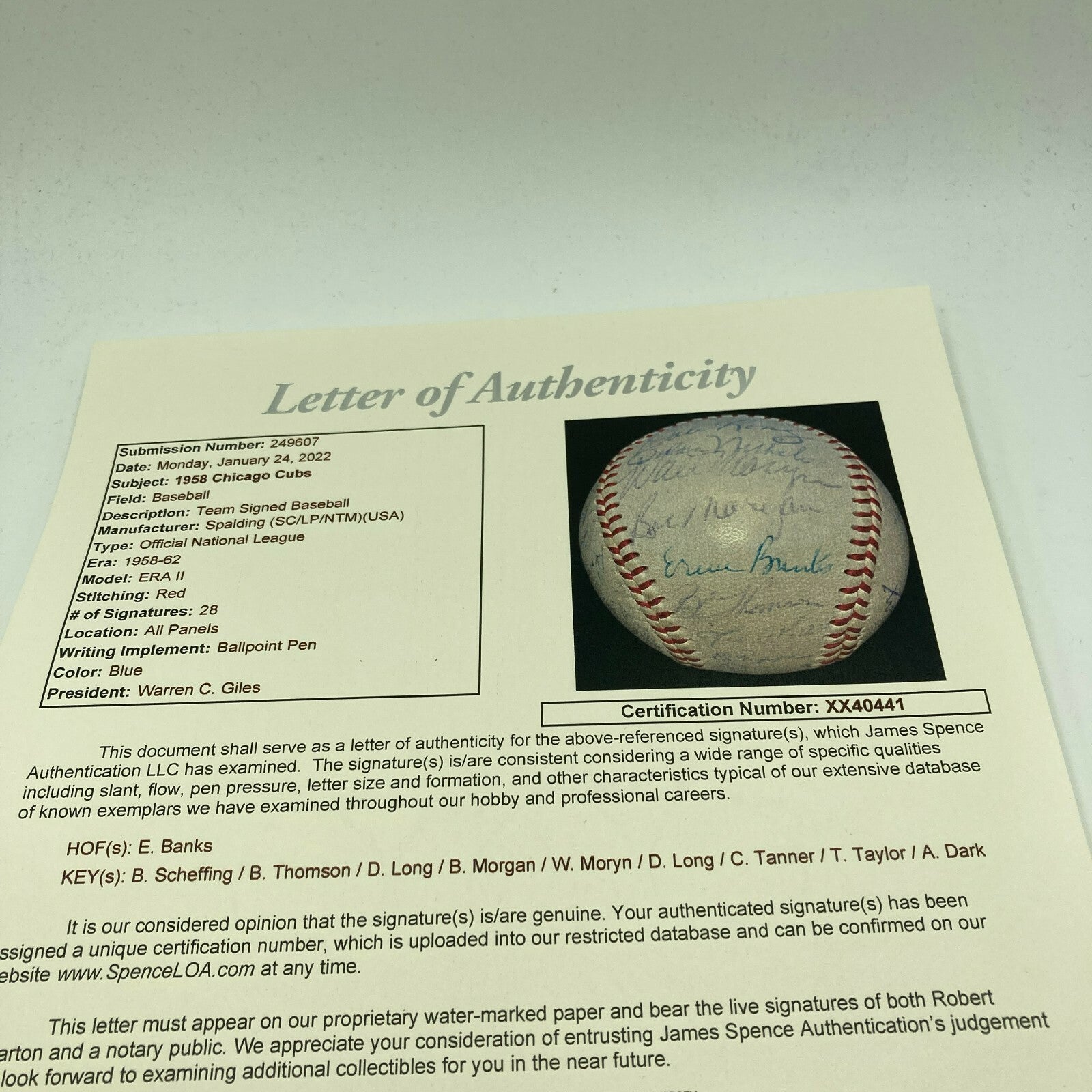 1958 Cubs Team Signed National League Baseball. 28 signatures with Ernie Banks.