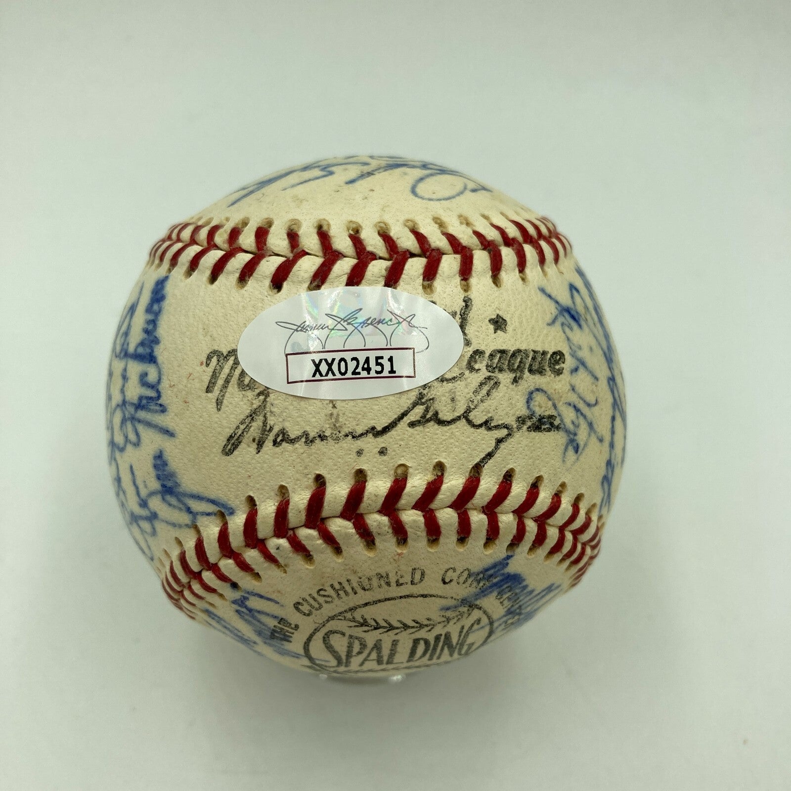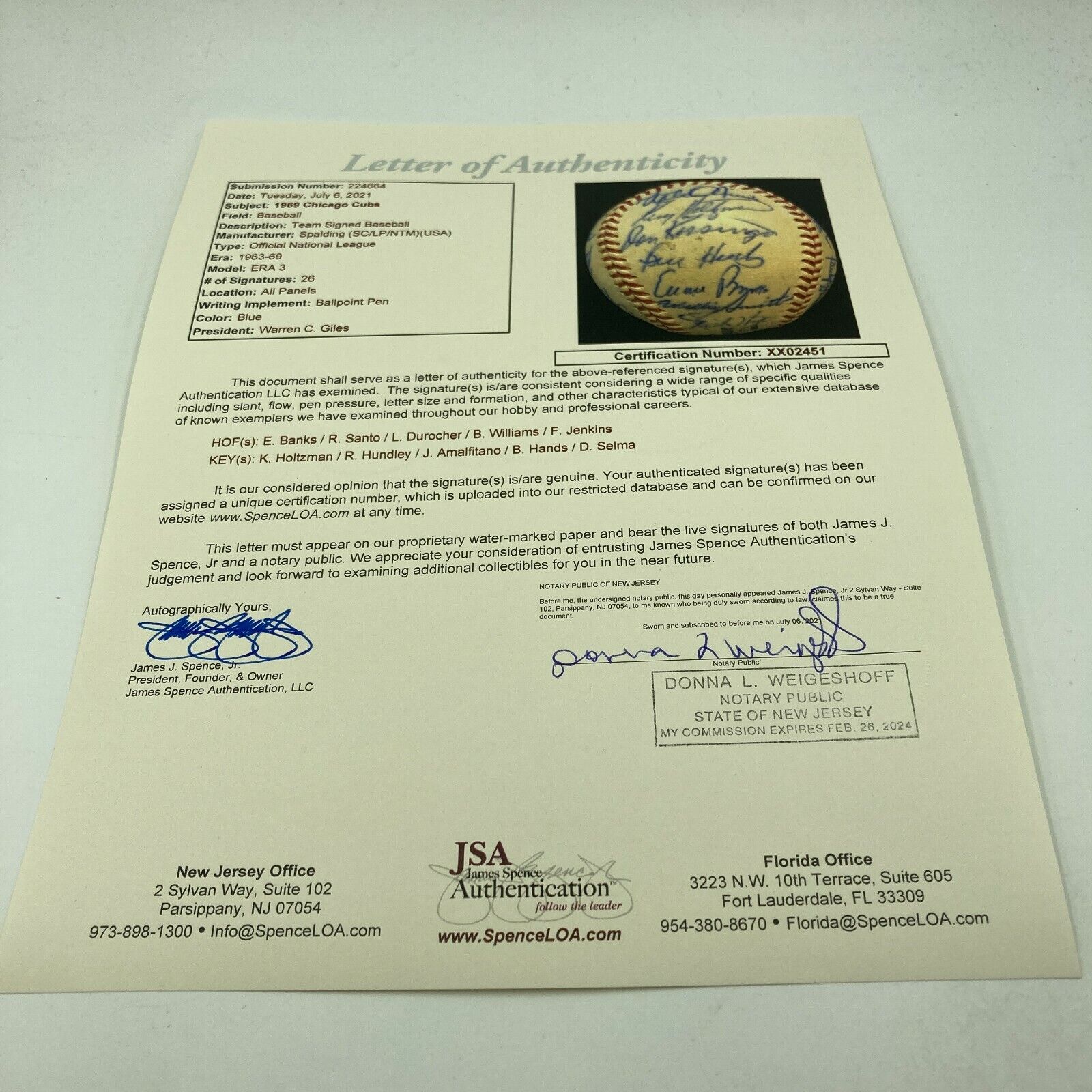 1969 Chicago Cubs Team Signed Vintage Official National League (Warren Giles) Baseball. One of the greatest Cubs teams in history. About 26 signatures with Ernie Banks, Ron Santo, Leo Durocher, Billy Williams, Fergie Jenkins, Ken Holtzman, Randy Hundley and the rest of the team. Comes with full letter JSA Certificate Of Authenticity and tamper proof sticker. Also comes with the original Spalding baseball box.