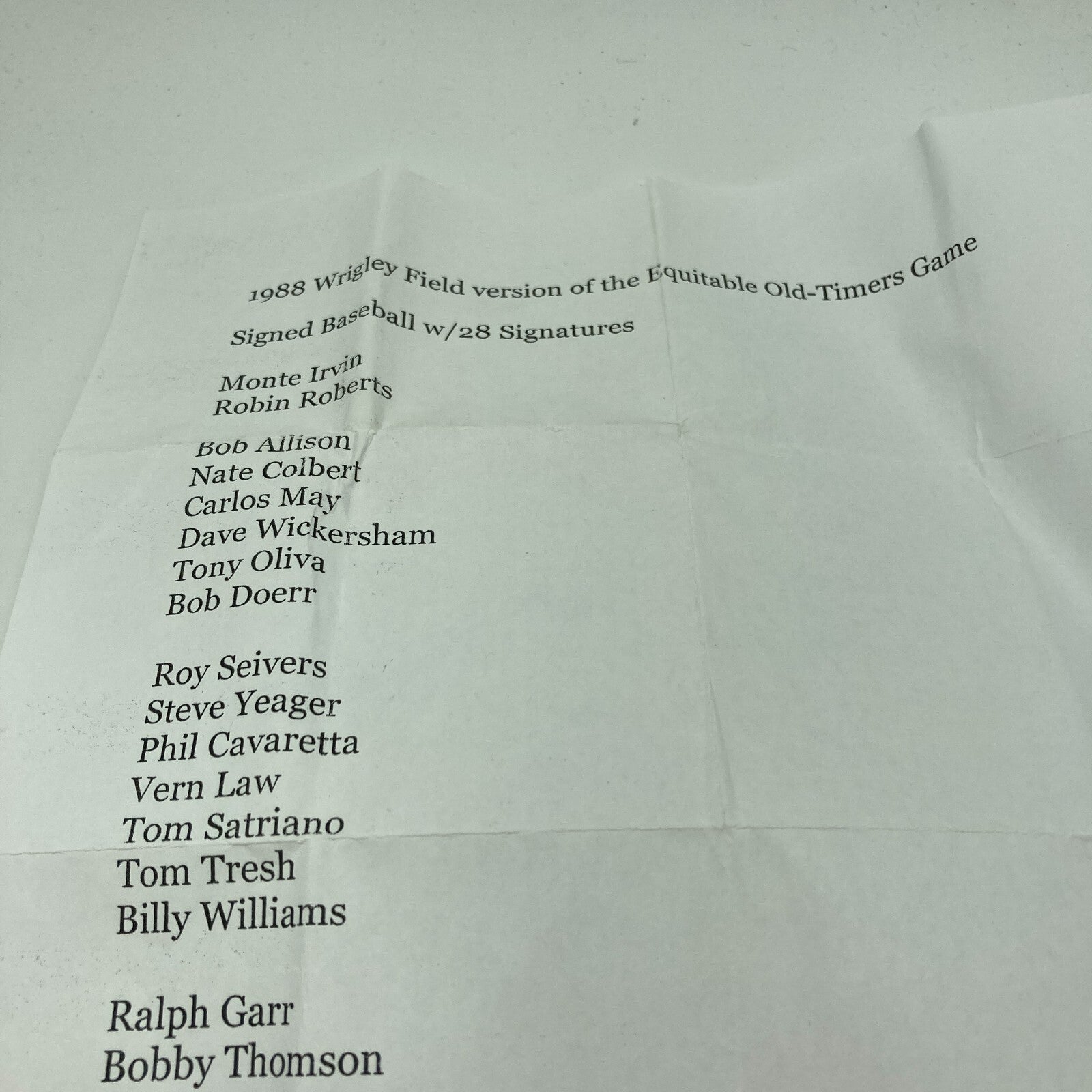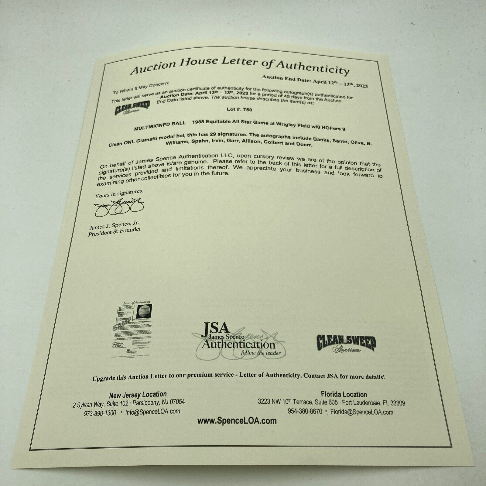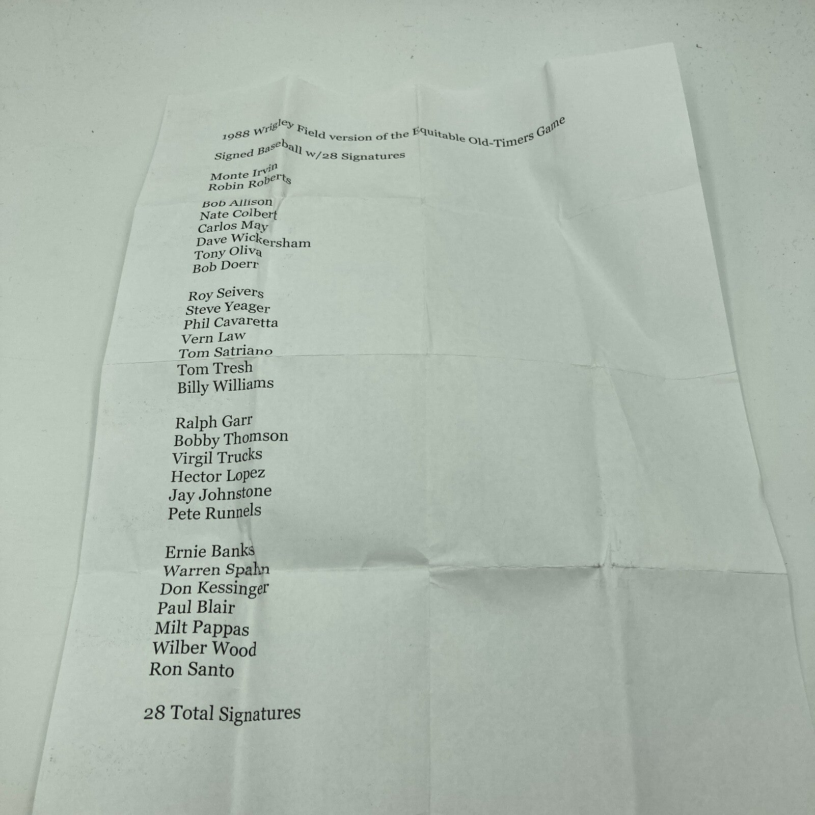 1988 Wrigley Field Equitable All Star Game Signed National League Baseball. 29 signatures with Ernie Banks, Ron Santo, Billy Williams, Warren Spahn and many others. Comes with JSA COA.