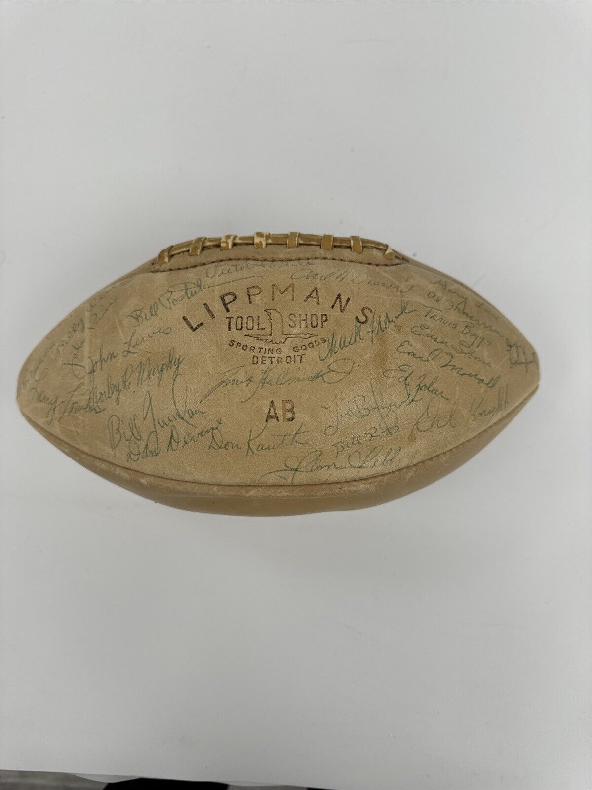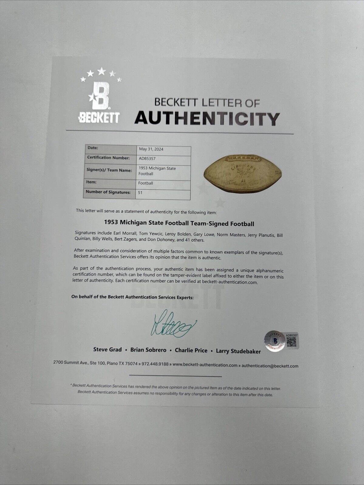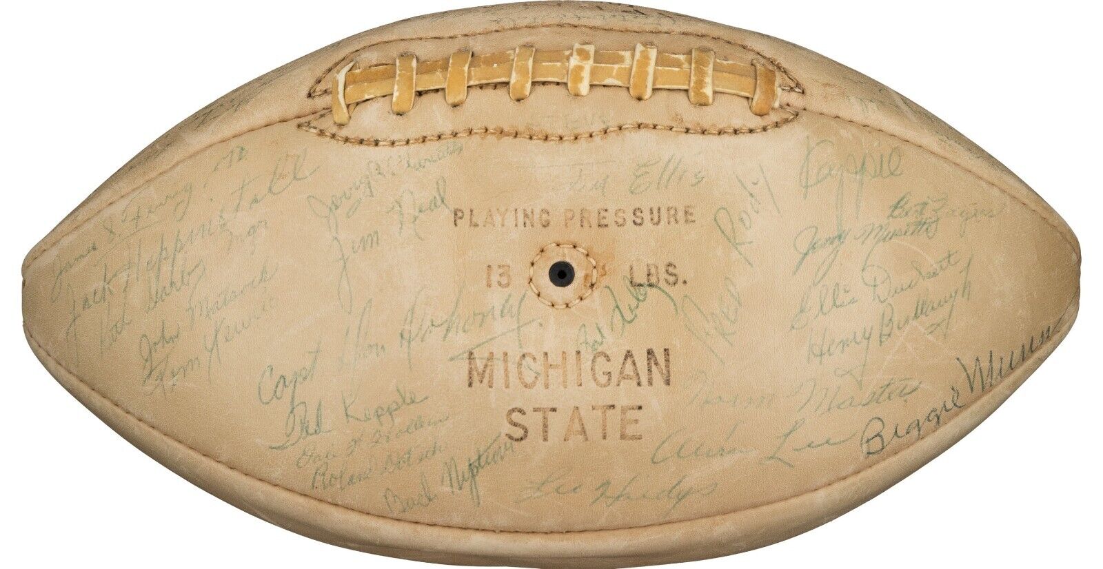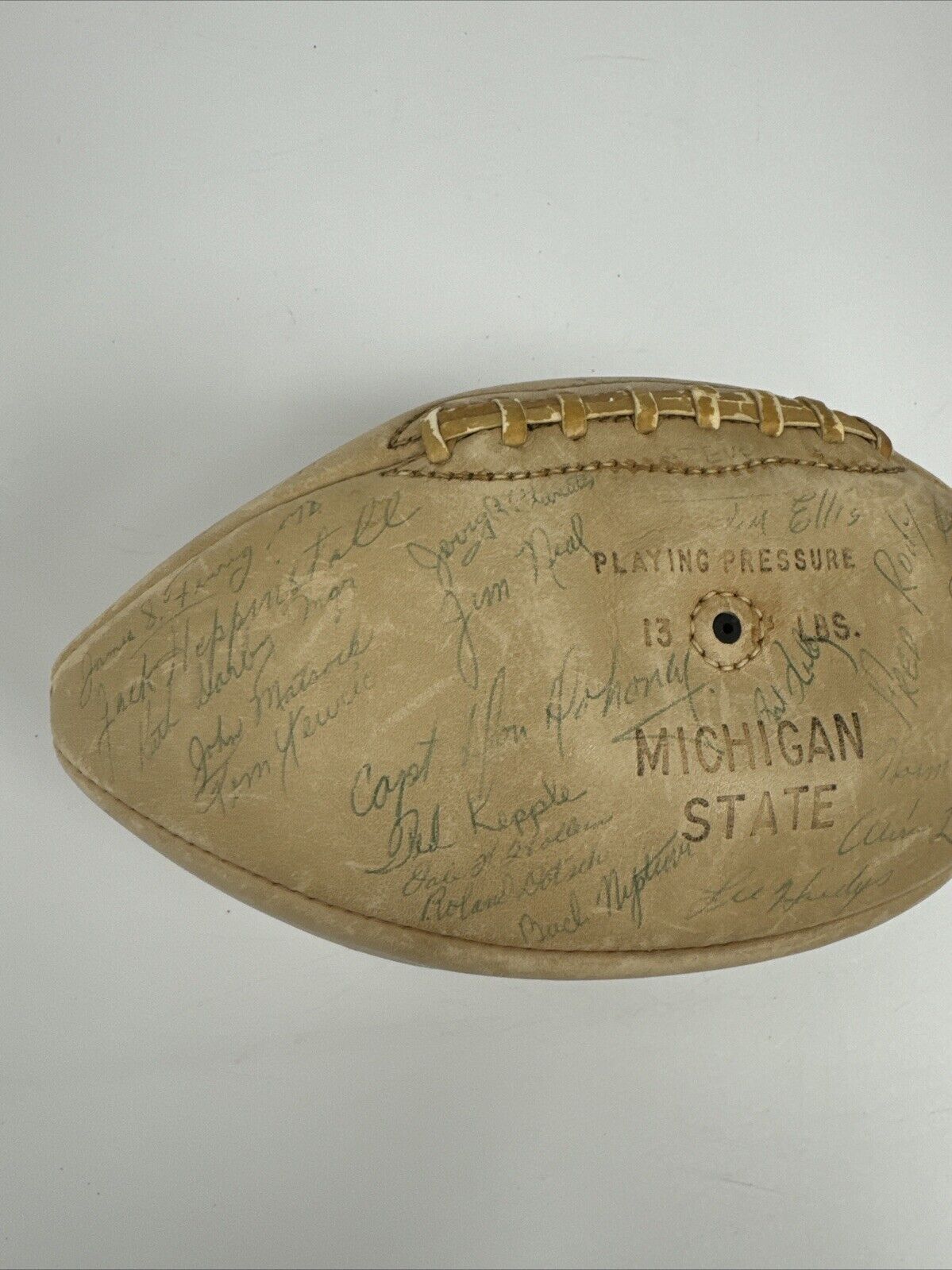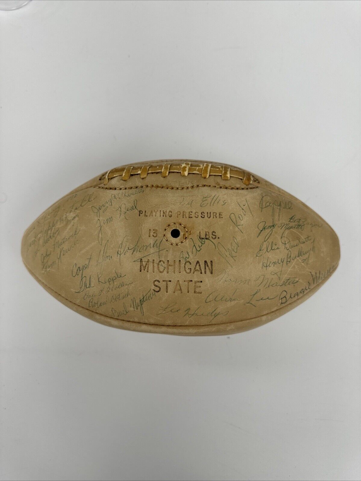 1953 Michigan State Spartans Team Signed Football. The 1953 Michigan State Spartans finished the season with a 9-1 record, won the Big Ten Conference title, won the Rose Bowl against UCLA, and were ranked third in the final AP Poll. The offered "Michigan State" autograph model football is signed by a whopping fifty-one members of that gridiron powerhouse, including Morrall, Yewcic, Bolden, Slonac, Wells, Ellis, Dononey (captain), Quinlan, Duckett, Bullough, Fowler, Hallmark, Jebb, Neal, Roninson, Ross and Munn (head coach). The ball exhibits mild toning. Meanwhile, the blue ink autographs grade an overall 8/10 in strength. Displays well. Full LOA from Beckett Authentication Services.