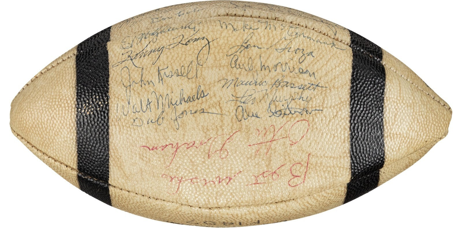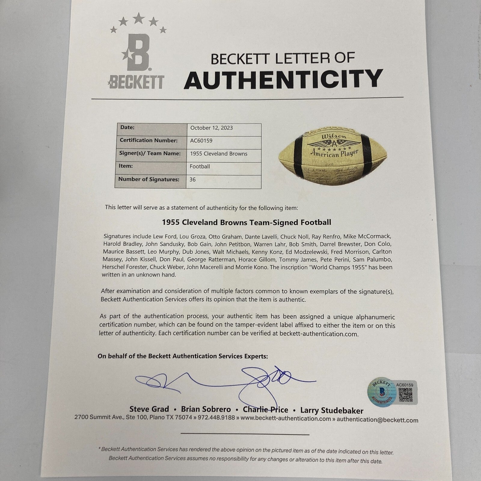 1955 Cleveland Browns Team Signed Football. Offered "Wilson American Player Otto Graham" autograph model football is signed by thirty-six NFL champion Cleveland Browns, including Hall of Famers Graham, Ford, Groza, Gatski, Lavelli, Knoll and McCormack. Others in attendance include Gain, Michaels, Colo, Gibron, Jones, Gillom and more. The blue and red ballpoint autographs grade an overall 8.5/10 in strength. Full LOA from Beckett Authentication Services.