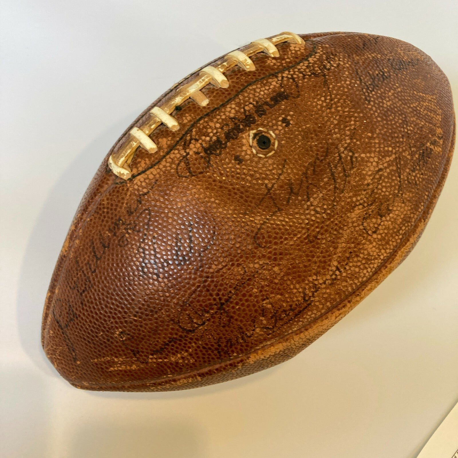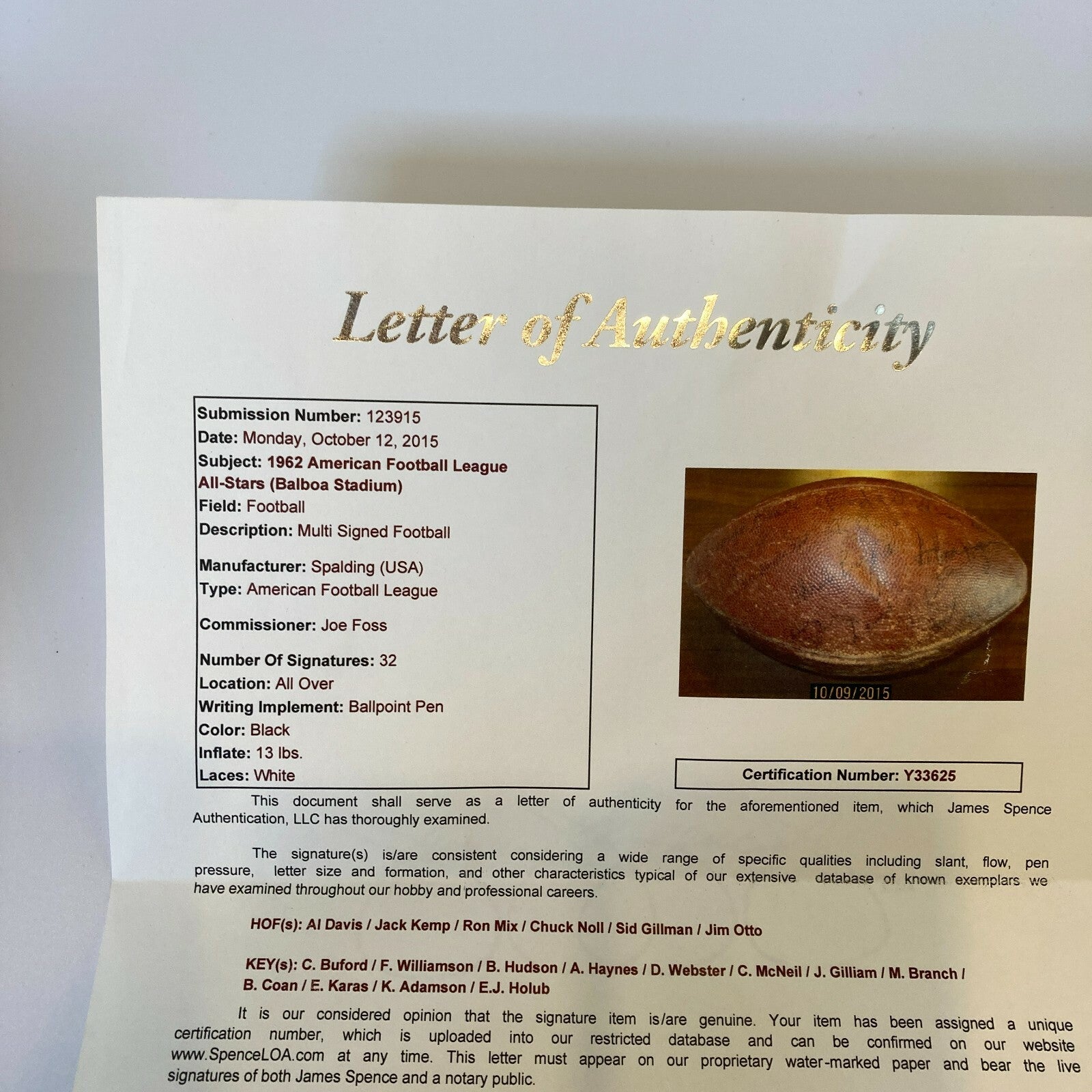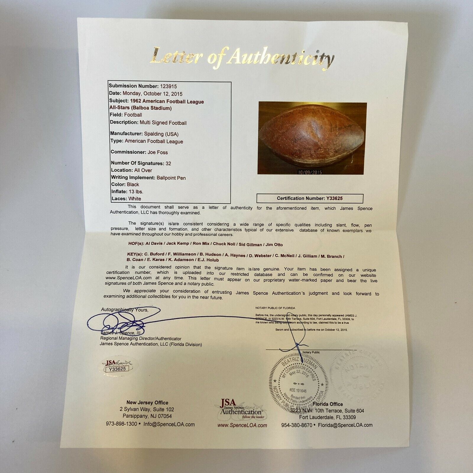 Rare early 1960s AFL team signed game used football. 32 signatures in all. The highlights include a rare early Al Davis, a super early Chuck Noll, Jack Kemp, Ron Mix, Jim Otto and Sid Gillman, for a total of six HOFers. The other signatures include Branch, Gilliam, Haynes and Williamson. The ball is not inflated but presents nicely.