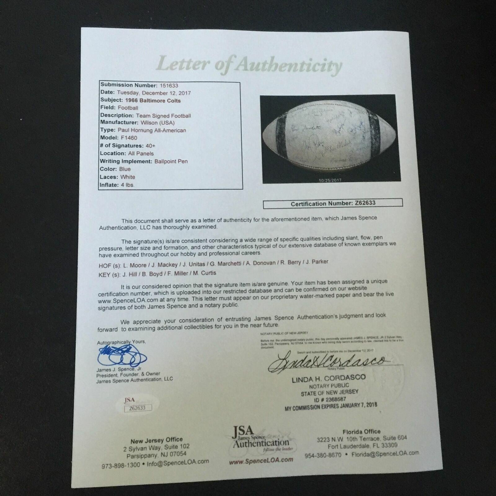 Rare 1966 Baltimore Colts Team Signed Wilson Football. Over 40 signatures with Johnny Unitas, Lenny Moore, Mackey, Gino Marchetti, Art Donovan, Raymond Berry, Parker, Cutis and many others. Comes with full letter JSA COA.