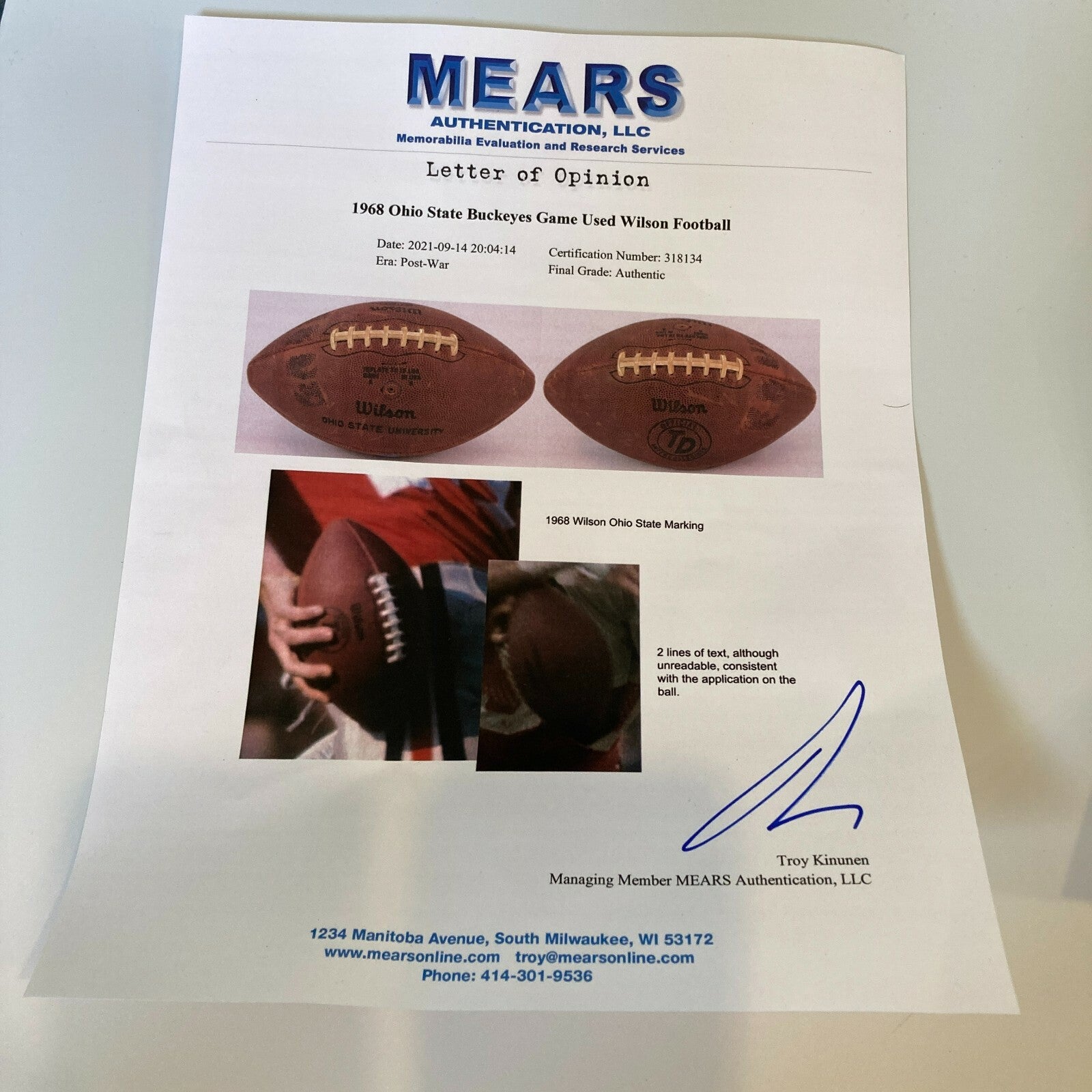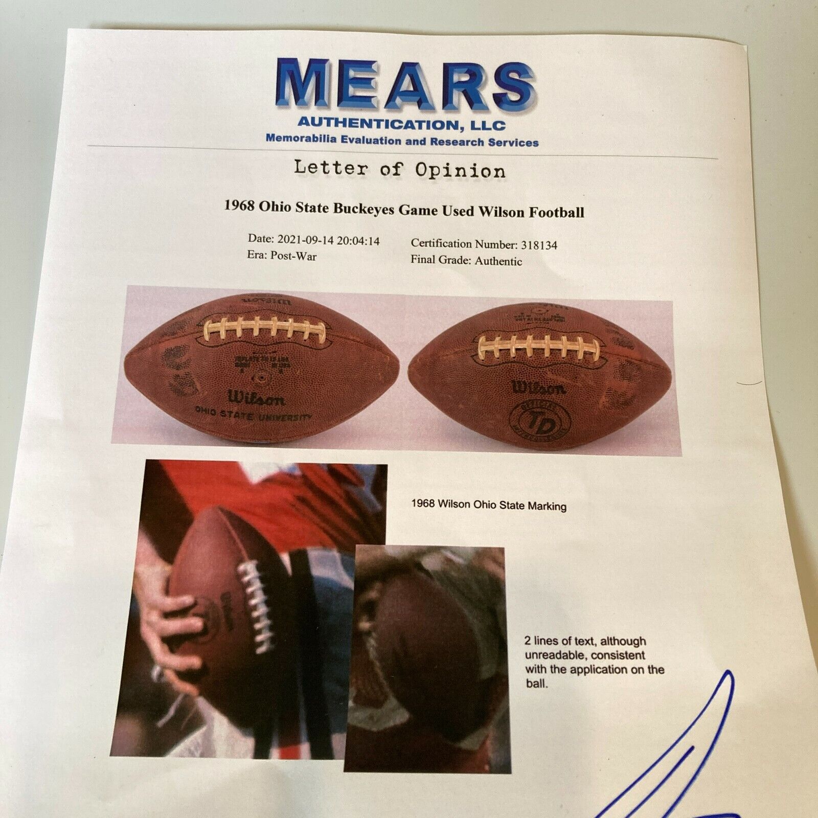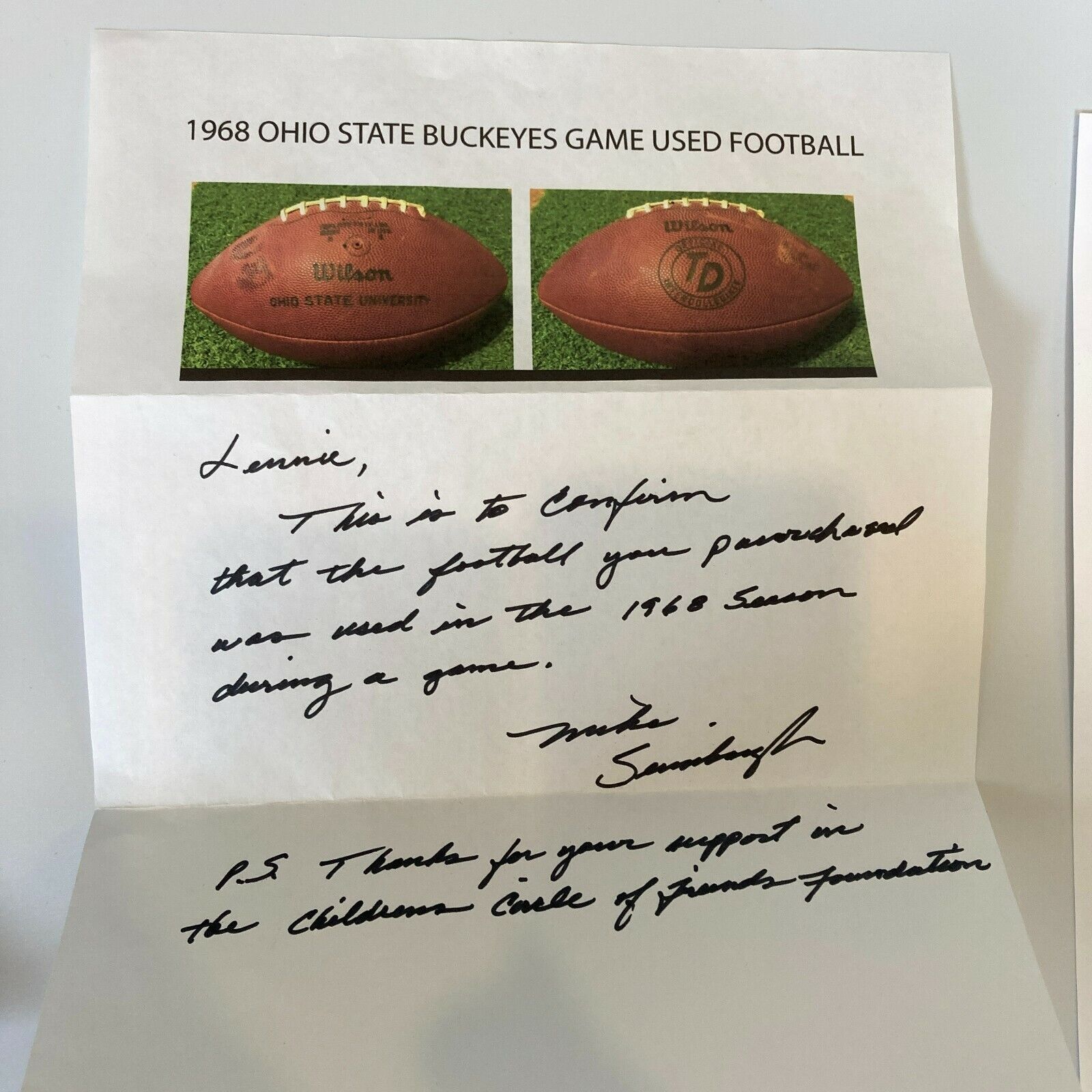 Offered here is a game used Wilson Ohio State University football used during the 1968 season and an orange football tee signed by former NFL and Ohio State player Mike Sensibaugh. Sensibaugh's 22 interceptions over his career and nine interceptions during a season are still Ohio State records. The presented football is brown and features "Wilson" imprinted in black on two panels. "OHIO STATE UNIVERSITY" is imprinted in black below "Wilson" on one of the panels. "OFFICIAL TD INTERCOLLEGIATE" is imprinted in black on one of the panels. The ball displays extraordinary evidence of game use and contains various abrasions, scuff marks, and faint dirt stains. The item comes with an LOA from MEARS (318134), who gave the item the grade of "AUTHENTIC", along with an LOA from Mike Sensibaugh for the game use.