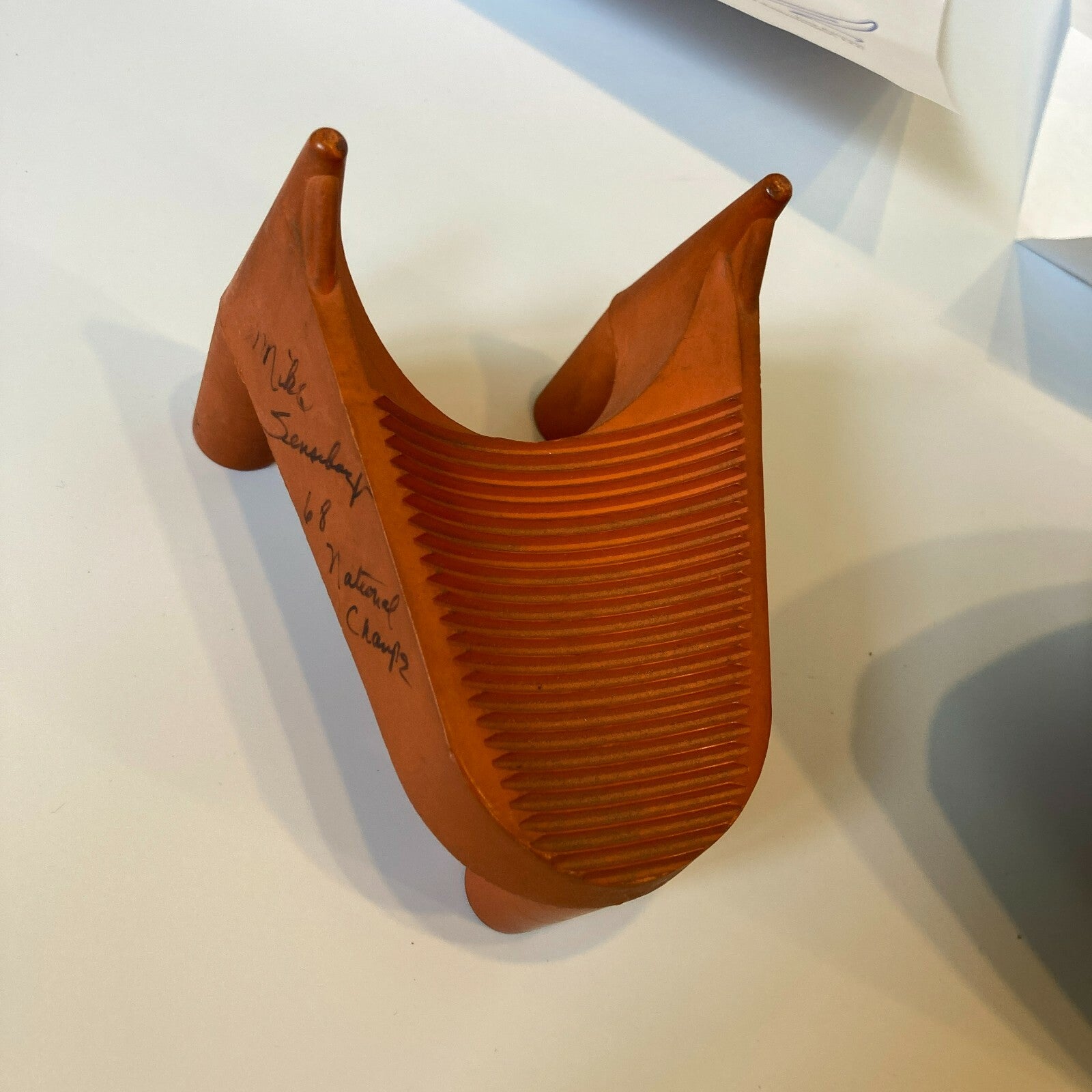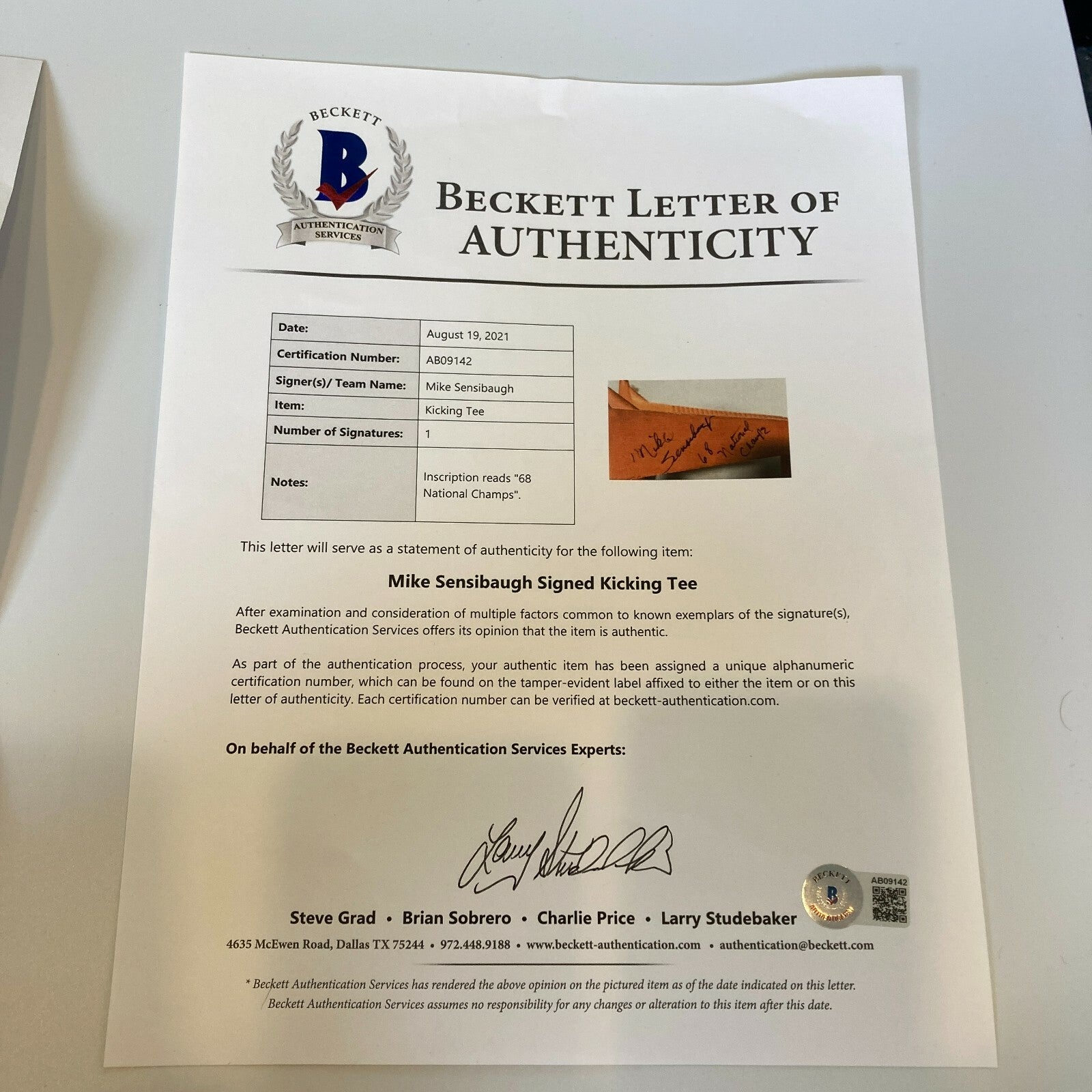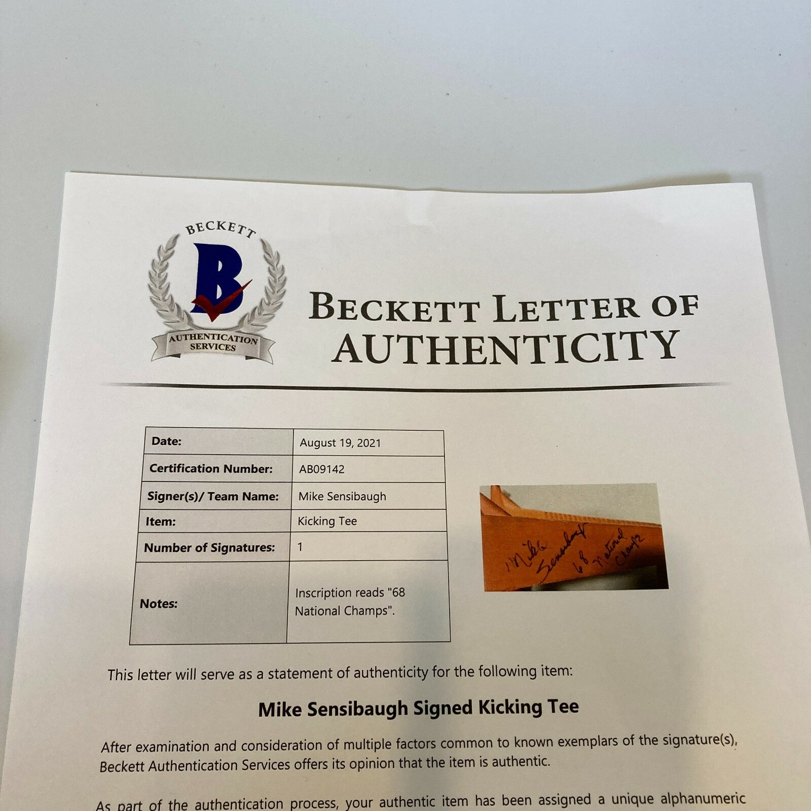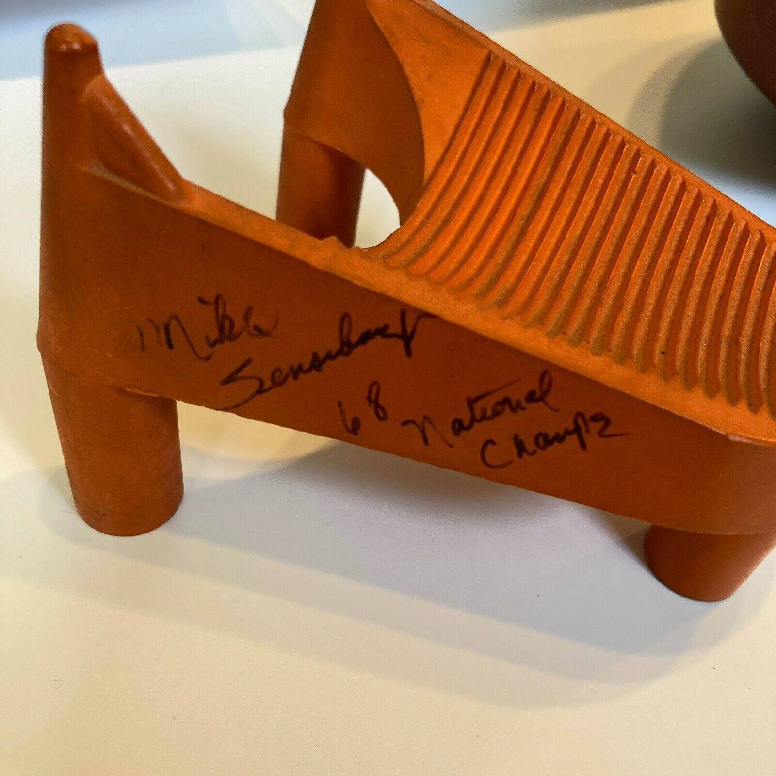 The second item in this presented lot is a kicking tee signed by Mike Sensibaugh. The orange tee features numerous abrasions, scuff marks, and faint dirt stains. Sensibaugh signed and inscribed "68 National Champs" in black ink on the left side of the tee. The signature is bold and clear, and the item comes with an LOA from Beckett Authentication (AB09142) for the signature.