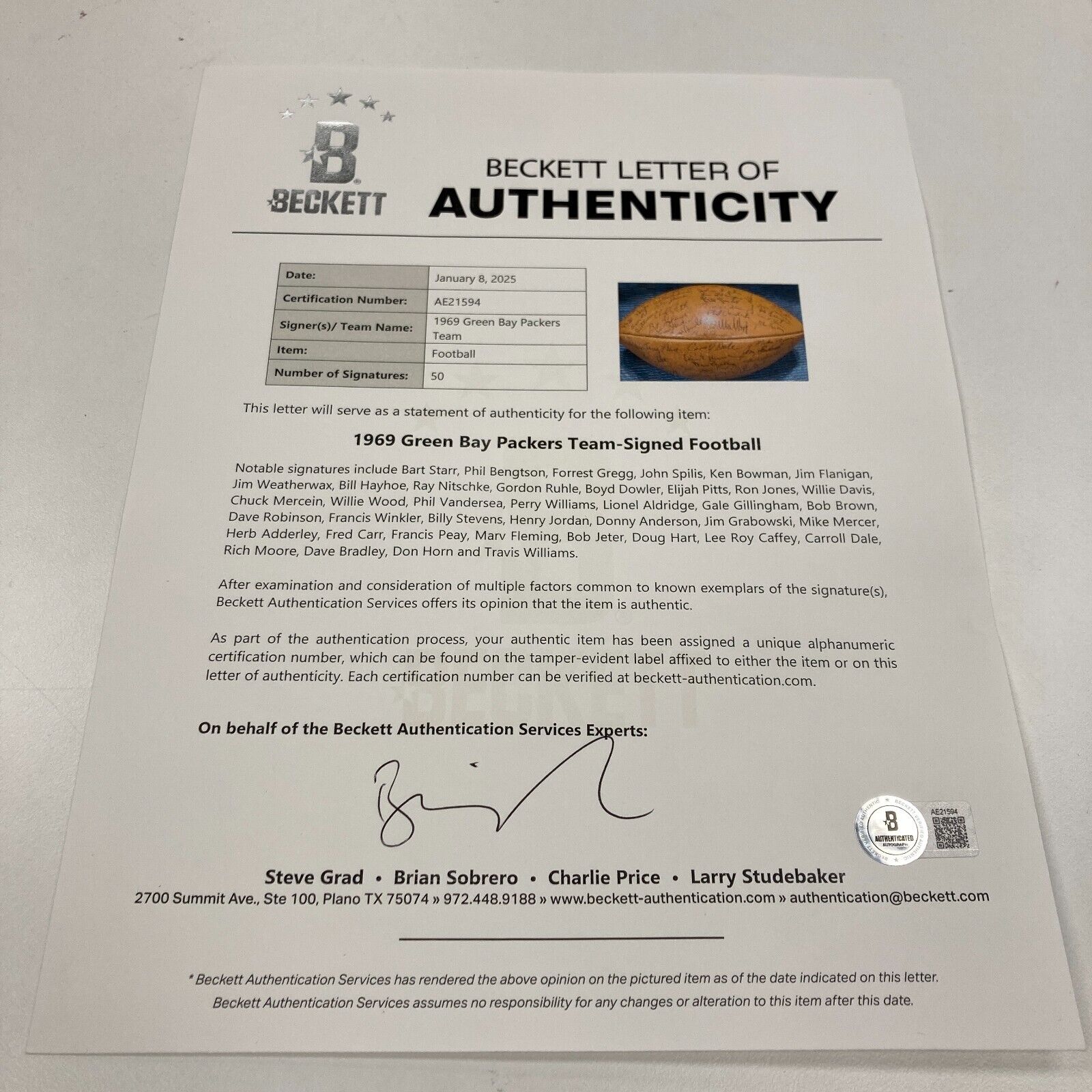 1969 Green Bay Packers Team Signed Vintage Wilson The Duke Official Game Football. 50 signatures. Notable signatures include Bart Starr, Phil Bengtson, Forrest Gregg, John Spilis, Ken Bowman, Jim Flanigan, Jim Weatherwax, Bill Hayhoe, Ray Nitschke, Gordon Ruhle, Boyd Dowler, Elijah Pitts, Ron Jones, Willie Davis, Chuck Mercein, Willie Wood, Phil Vandersea, Perry Williams, Lionel Aldridge, Gale Gillingham, Bob Brown, Dave Robinson, francis Winkler, Billy Stevens, Henry Jordan, Donny Anderson, Jim Grabowski, Mike Mercer, Herb Adderley, Fred Carr, Francis Peay, Marv Fleming, Bob Jeter, Doug Hart, Lee Roy Caffey, Carroll Dale, Rich Moore, Dave Bradley, Don Horn and Travis Williams.