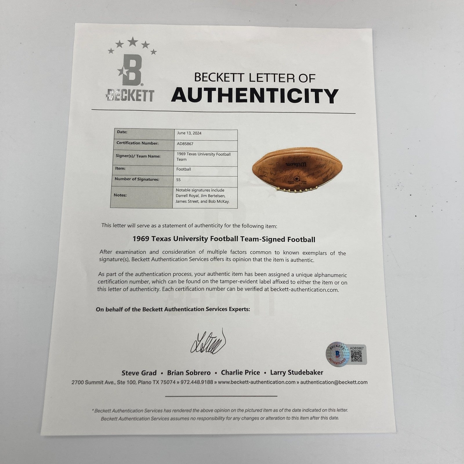 The Longhorns won all eleven games to win their second consensus national championship; the first was six seasons earlier in 1963. The 1969 team is the last all-white team to be named consensus national champions with the onset of racial integration. Approximately 55 signatures, with notables including: Darrell Royal, Jim Berthelsen, James Street, and Bob McKay. Accompanied by a full Beckett LOA. Approximately 55 signatures, with notables including: Darrell Royal, James Street, and Bob McKay. Accompanied by a full Beckett LOA.