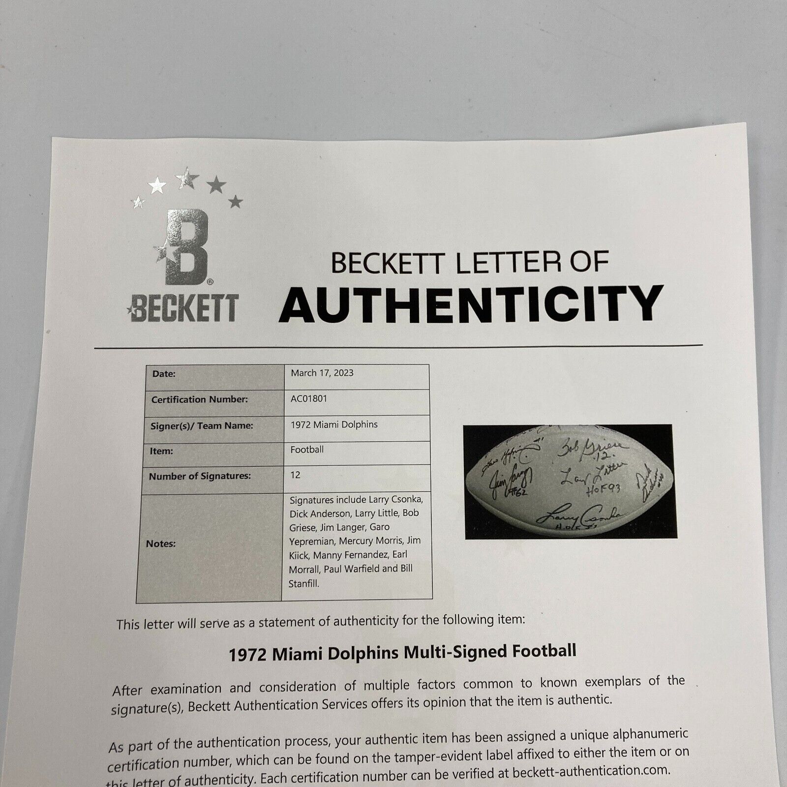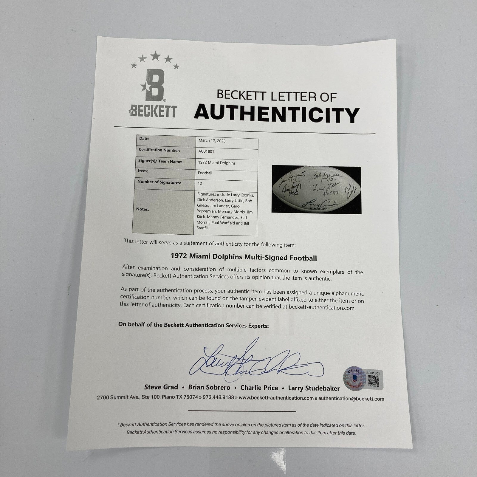 Signatures from Bob Griese, Paul Warfield, Larry Csonka, & Mercury Morris among others. Accompanied by a full Beckett Letter of Authenticity.