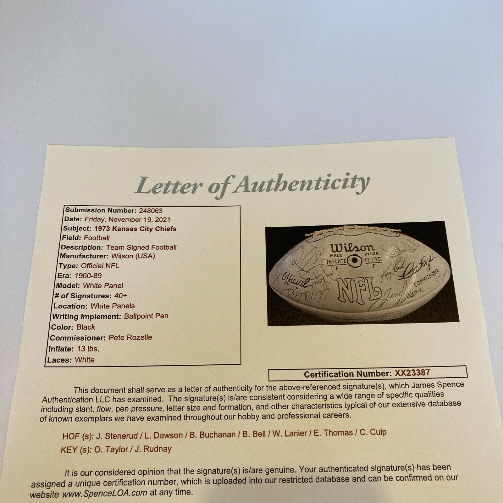 Official Wilson Pete Rozelle NFL white panel football signed by members of the Kansas City Chiefs. Signatures include: Len Dawson, Bobby Bell, Hank Stram, Jan Stenerud, Jerrel Wilson and Marv Upshaw among others. Comes with full letter JSA COA.