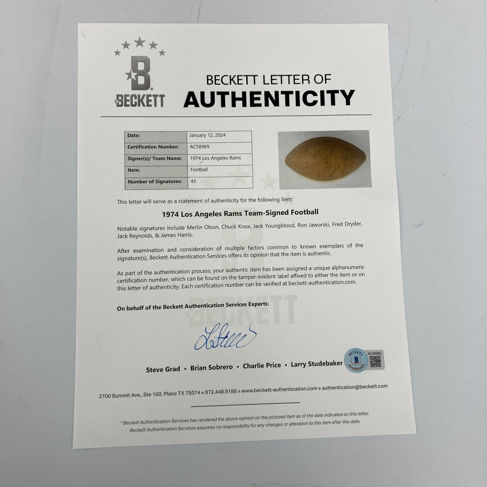 1974 Los Angeles Rams team signed football with 43 signatures of the NFC West Division Champions. Notable signatures include: Merlin Olsen, Jack Youngblood, Chuck Knox, Fred Dryer, Ron Jaworski, Jack Reynolds, James Harris, John Hadl, Jack Snow, Larry Brooks and Harold Jackson among others. Accompanied by a full Beckett Letter of Authenticity.