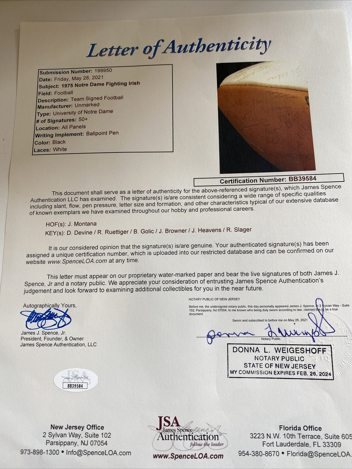 Notre Dame October 4, 1975 team signed vintage commemorative football. This special football contains over 60 autographs from one of the most historic teams in College Football history. The key signatures here are Joe Montana and Rudy Ruettiger. Famed from the classic movie, Rudy of course made it onto the field for just one play, how many team footballs could he have possibly signed?