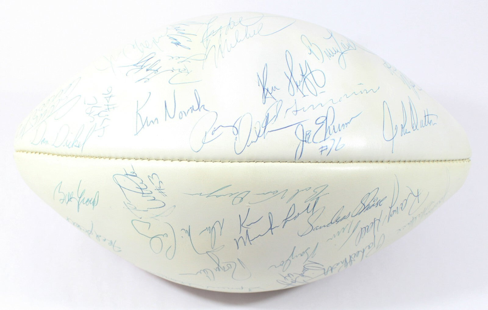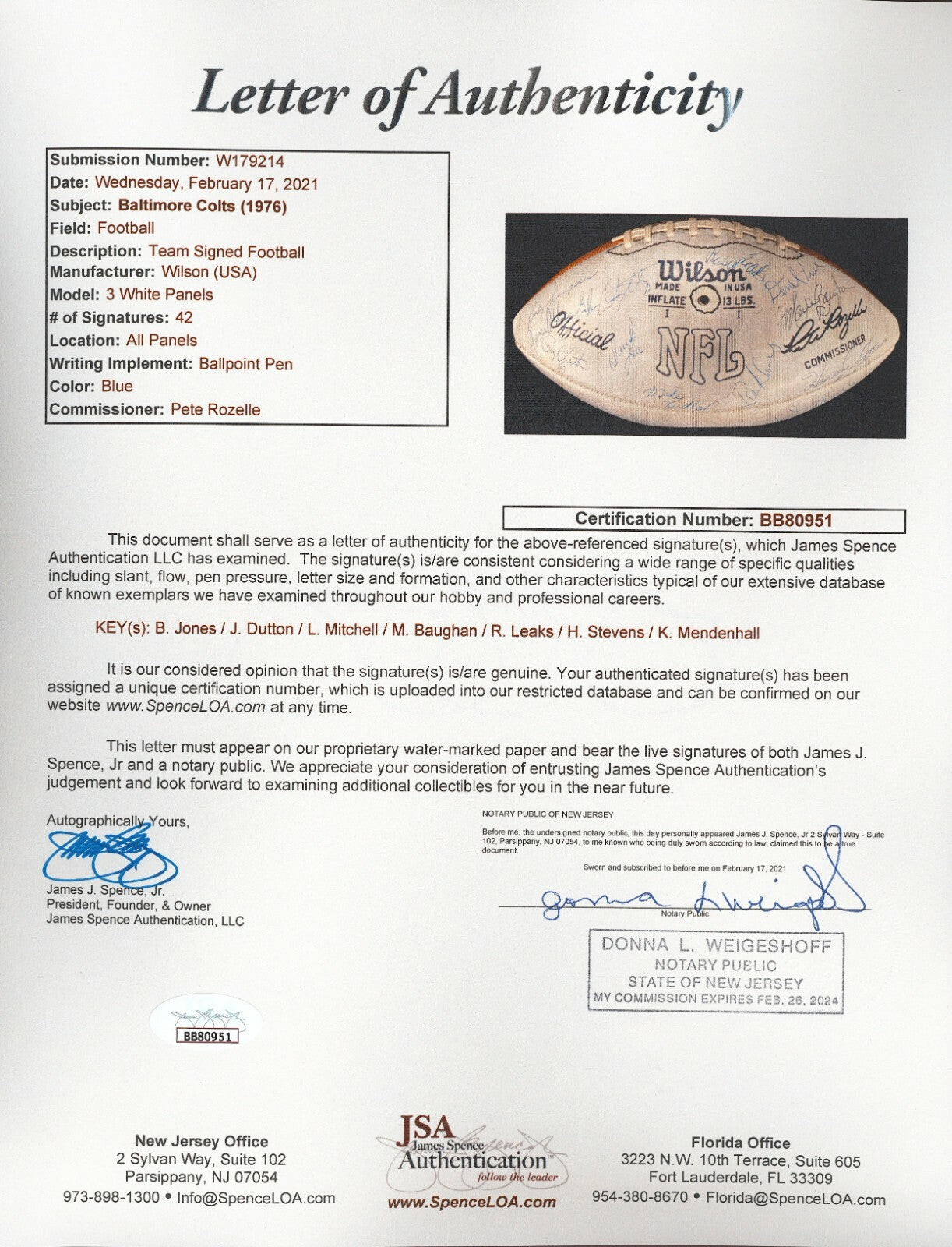 The 1976 Colts finished the season with an 11-3 record, first in the AFC East, behind quarterback Bert Jones, running back Lydell Mitchell, and a formidable offense that scored a league-leading 29.8 points per game. This fantastic Wilson Pete Rozelle football has been signed on the three white panels by 42 members of that team, including Jones and Mitchell, as well as stars Raymond Chester, John Dutton, Bruce Laird, Roosevelt Leaks, Ken Mendenhall, Howard Stevens, and many more. The football is in EX/MT condition with very little wear, the signatures applied in bold, blue ballpoint against the clean white background. An outstanding football, full LOA from James Spence Authentication.