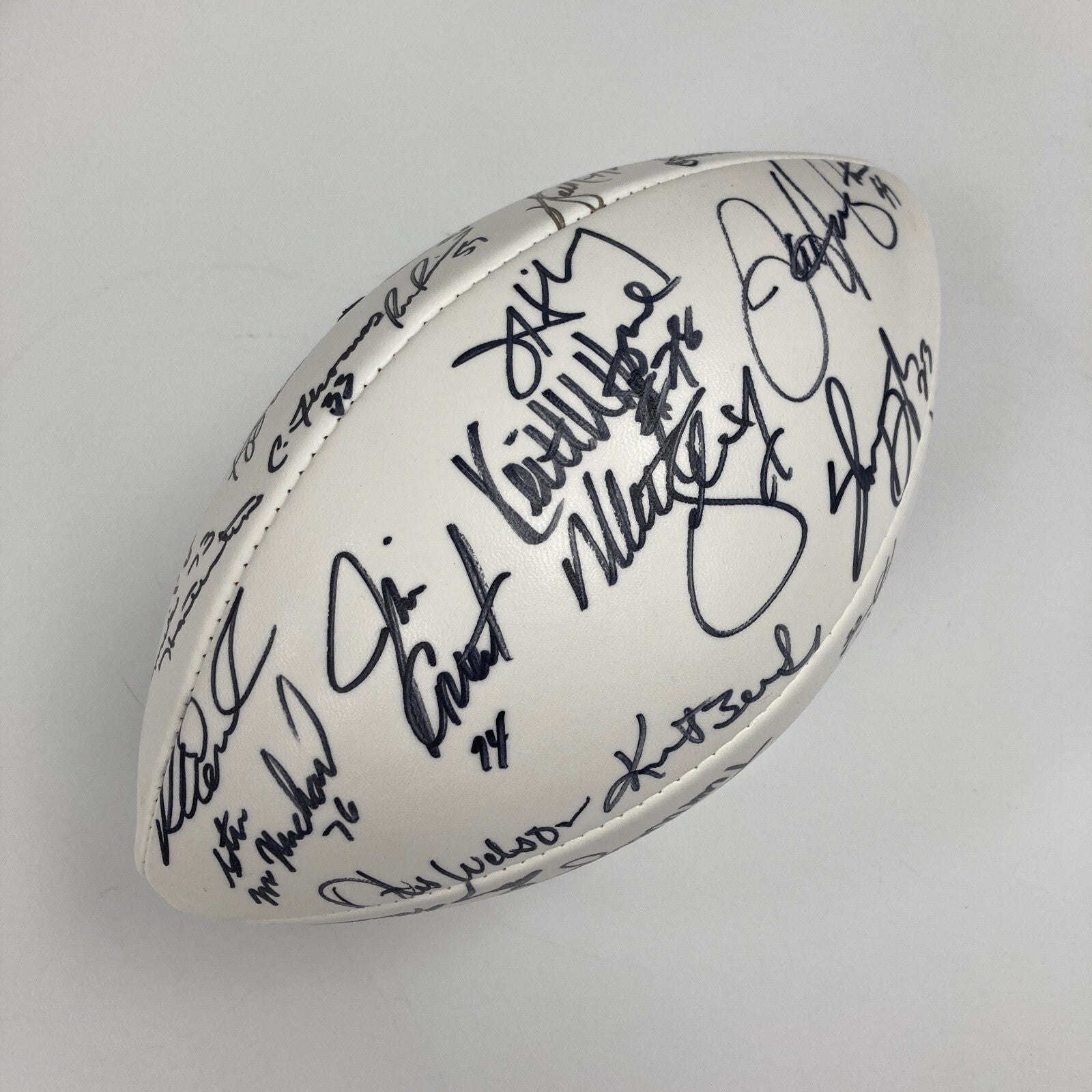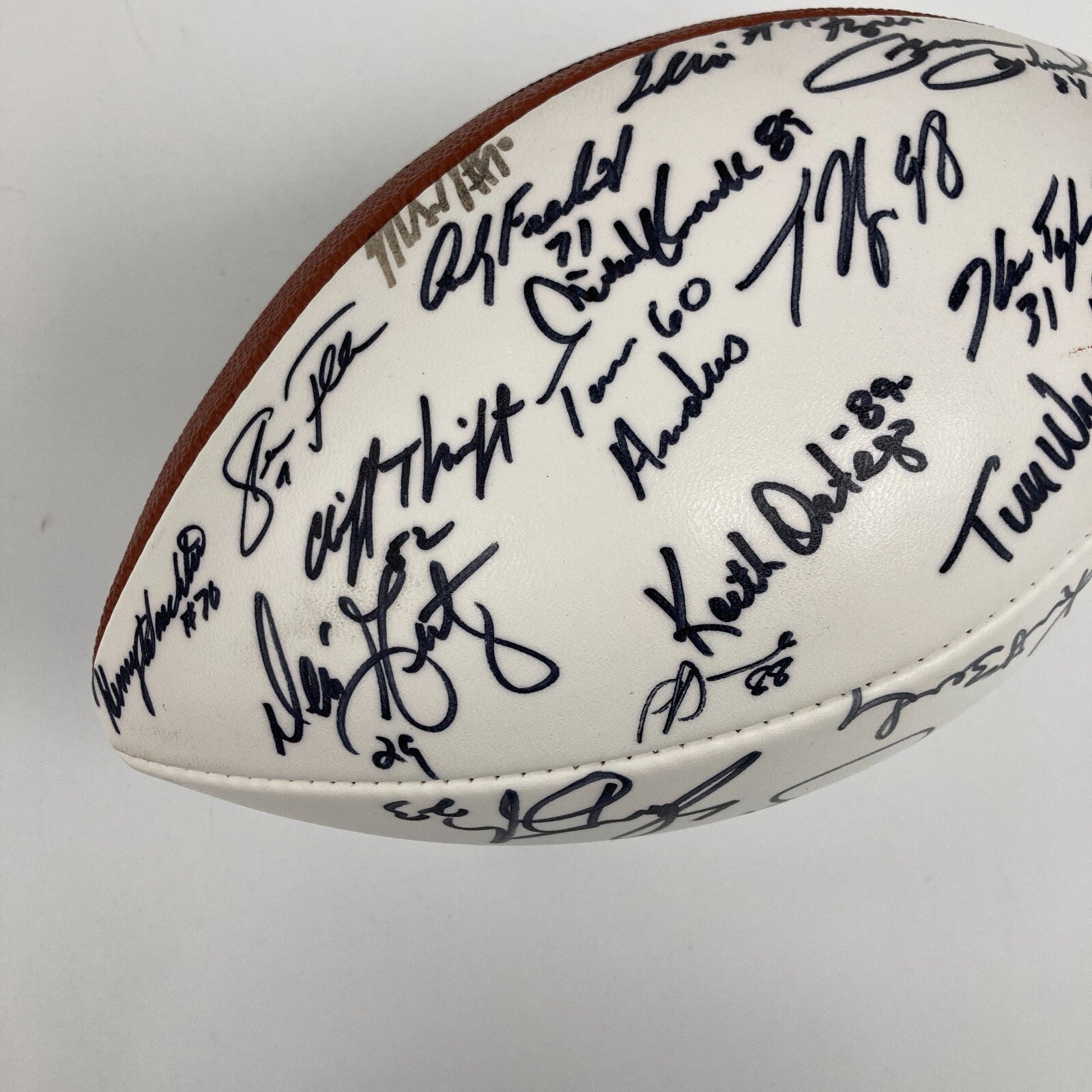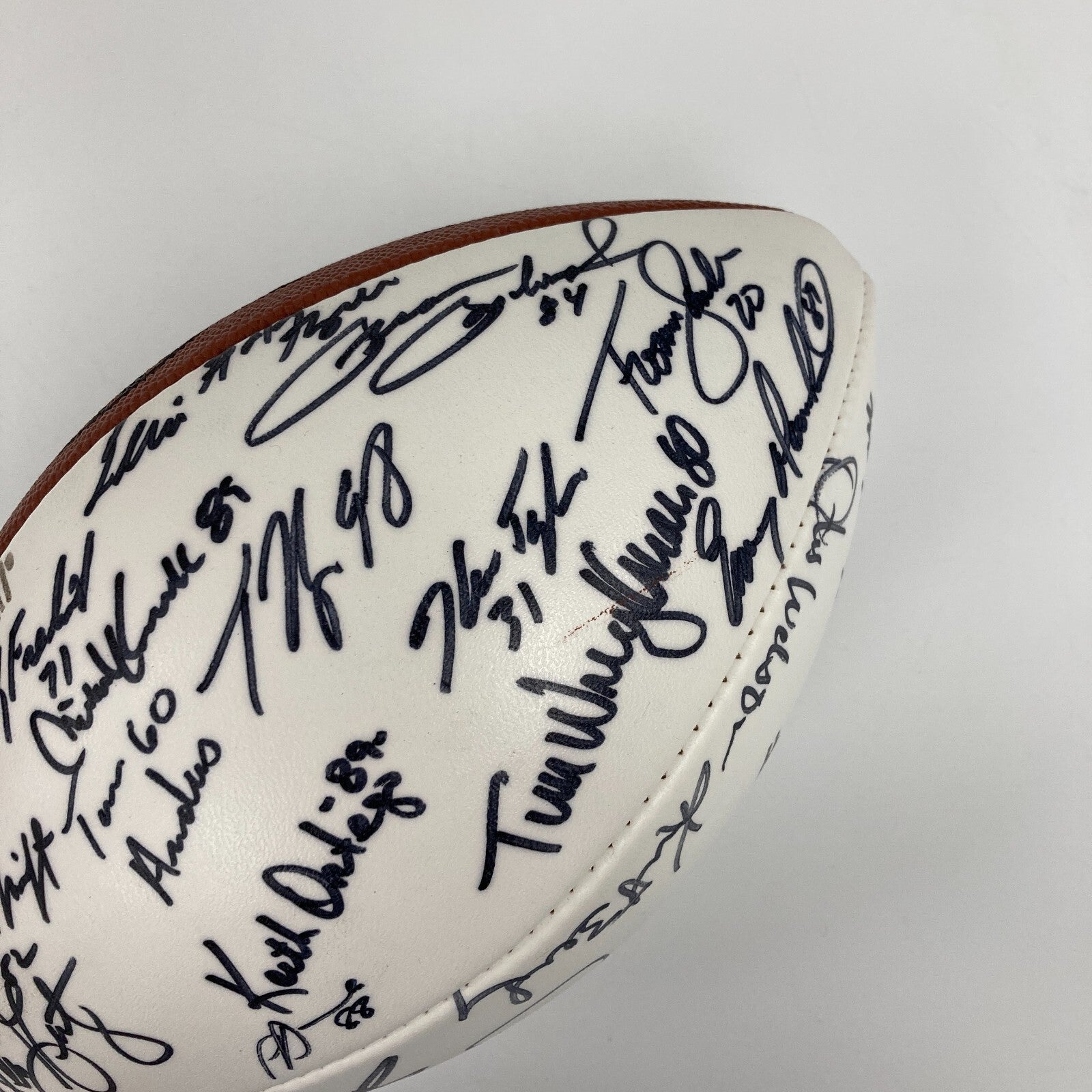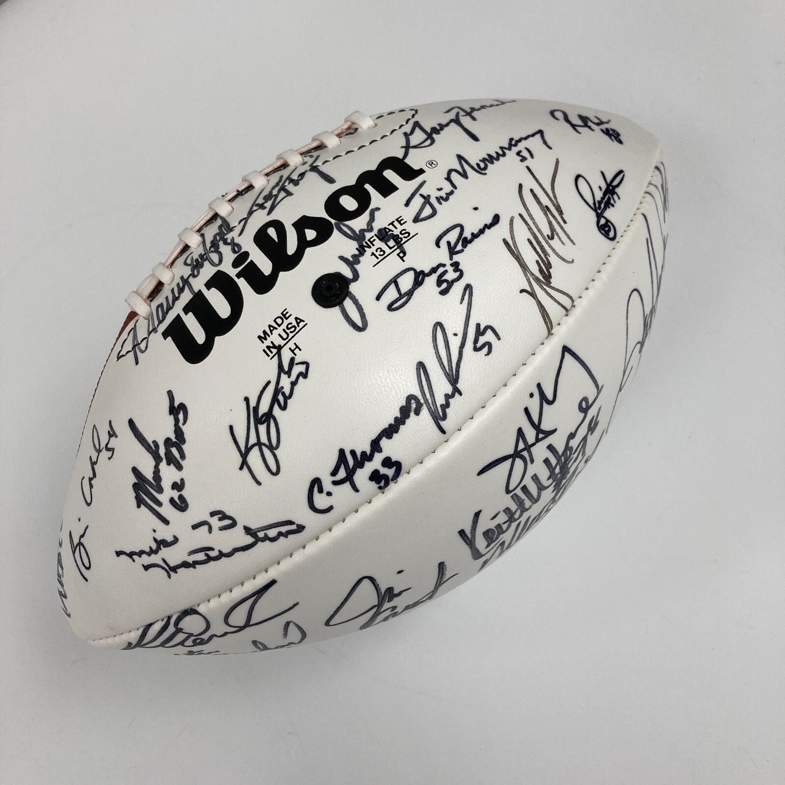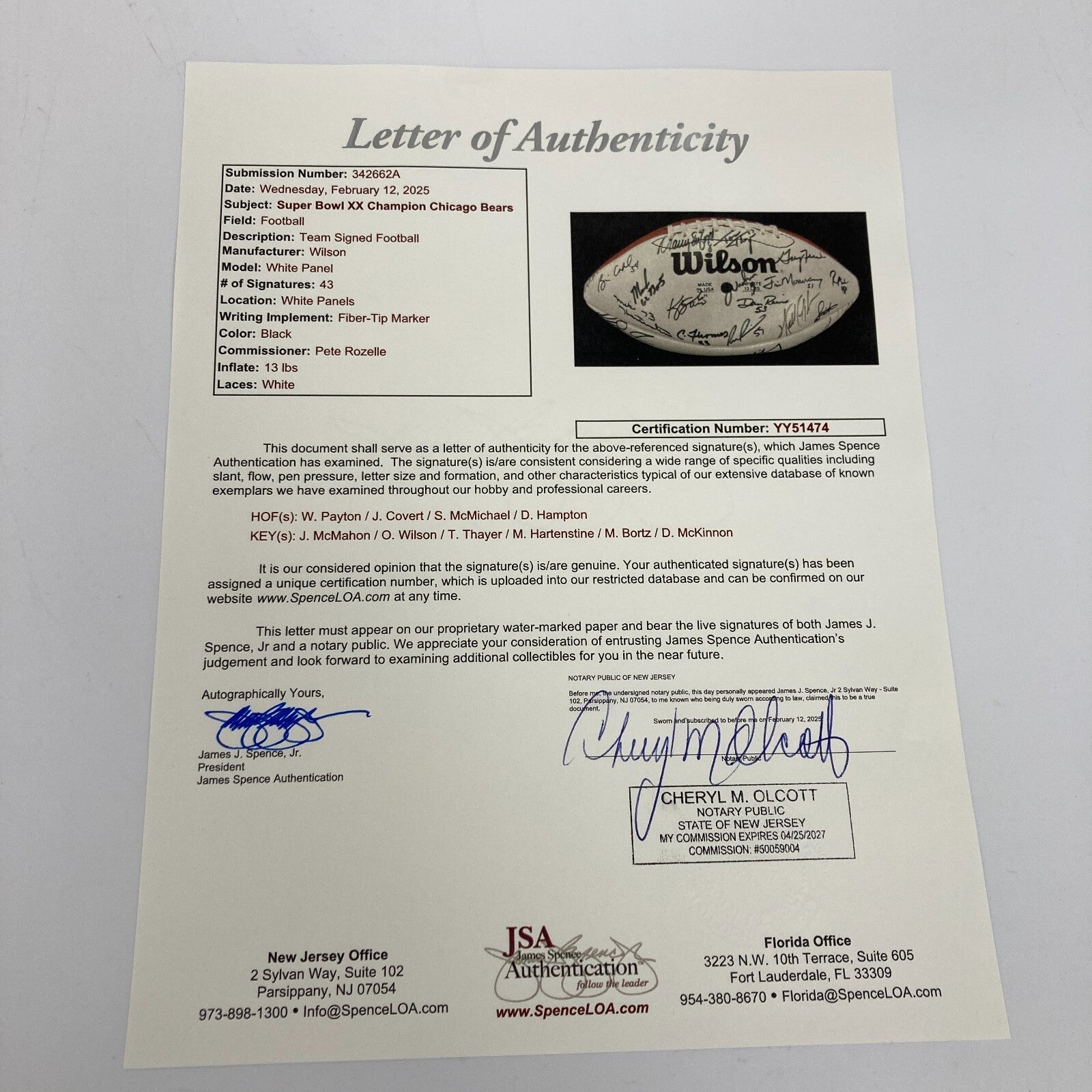 Offered is a Wilson Super Bowl XX football signed by 43 members of the memorable Super Bowl champion 1985 Chicago Bears. Key signatures on the ball in black marker include those of Hall of Famers Walter Payton and Richard Dent, with additional signatures from Jim McMahon, Calvin Thomas, Dan Rains, Tom Thayer, Tim Wrightman, Brian Cabral, Mike Hartenstine, and Jim Covert. The ball is accompanied by an LOA from JSA.