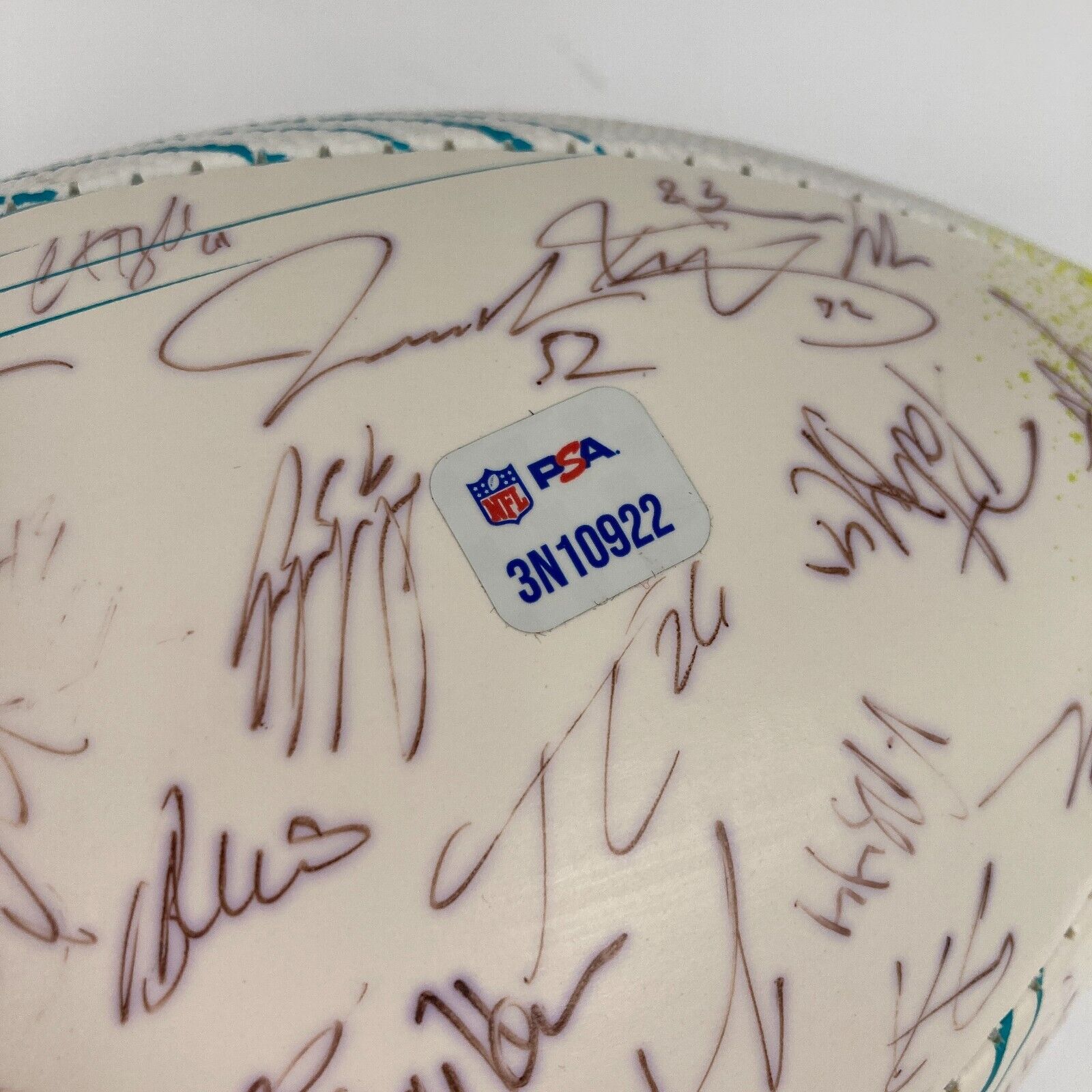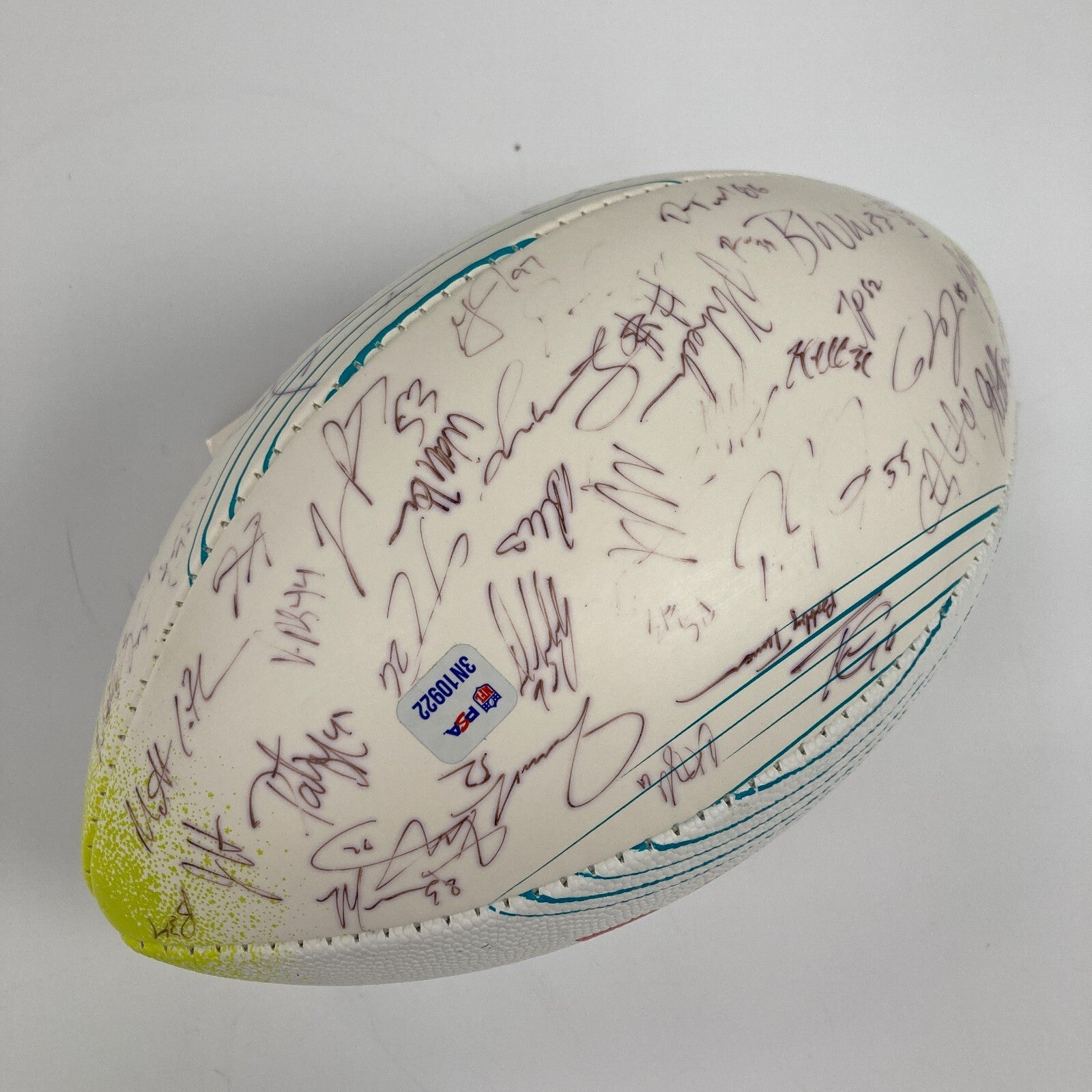 Wilson white panel football with Super Bowl LI graphics signed by over (40+) members of the NFC champion Falcons including Dan Quinn, Kyle Shanahan, Matt Ryan, Julio Jones, Tevin Coleman, Grady Jarrett, Jake Matthews, Alex Mack, Vic Beasley, Matt Ryan, and others. Includes NFL Auction COA from PSA, with matching serial #ed sticker on the ball
