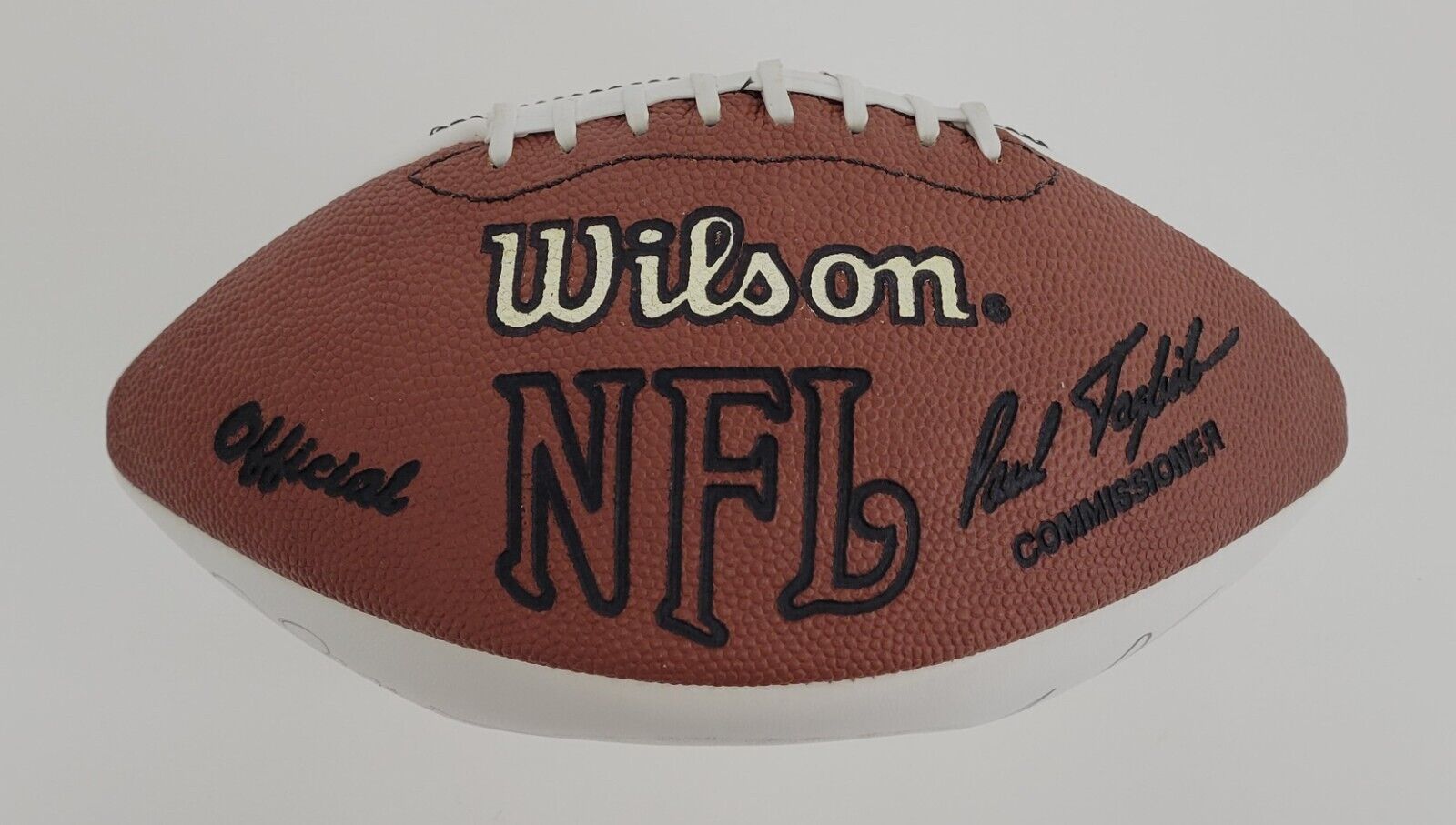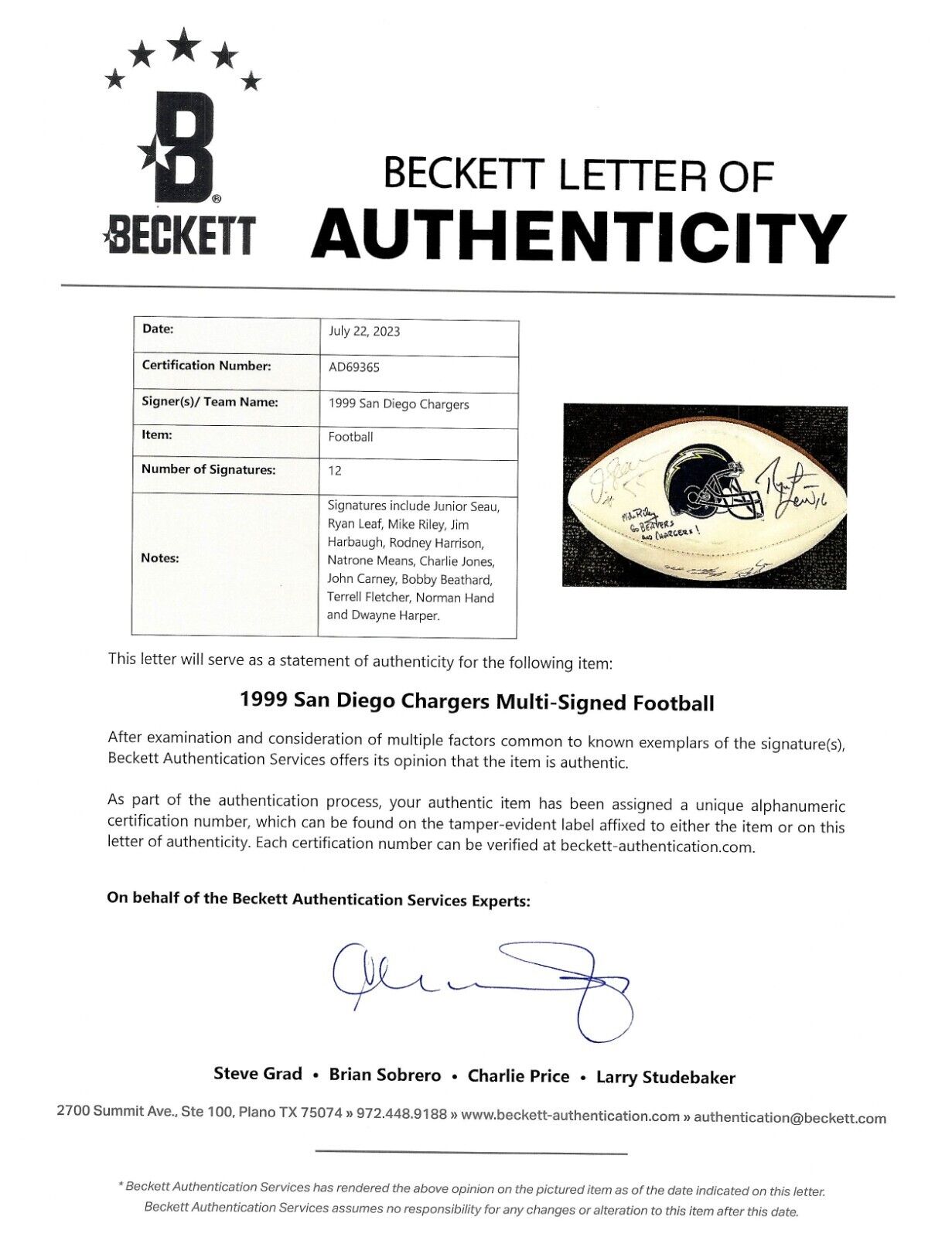 This commemorative football has been signed by 12 members of the 1999 San Diego Chargers football team- Signatures include Junior Seau, Ryan Leaf, Mike Riley, Jim Harbaugh, Rodney Harrison, Natrone Means, Charlie Jones, John Carney, Bobby Beathard, Terrell Fletcher, Norman Hand and Dwayne Harper. Accompanied by a full Beckett Letter of Authenticity.